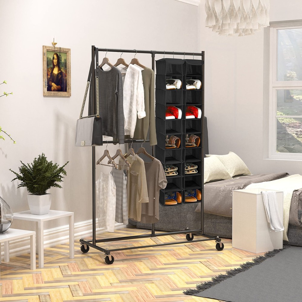 Dimension: 5" W x 12" D x 53"H Hangs on standard closet rod, wired closet rack 10 Fabric Shelves, dimension of each bin is 5'' W x 12''D x 5.25''H 2 Hooks hanging system works in closet rod or wired closet rack