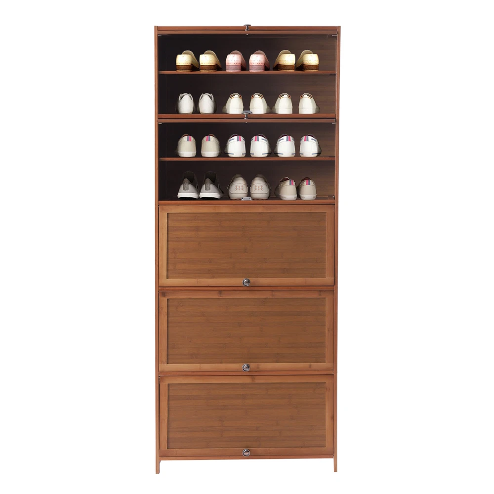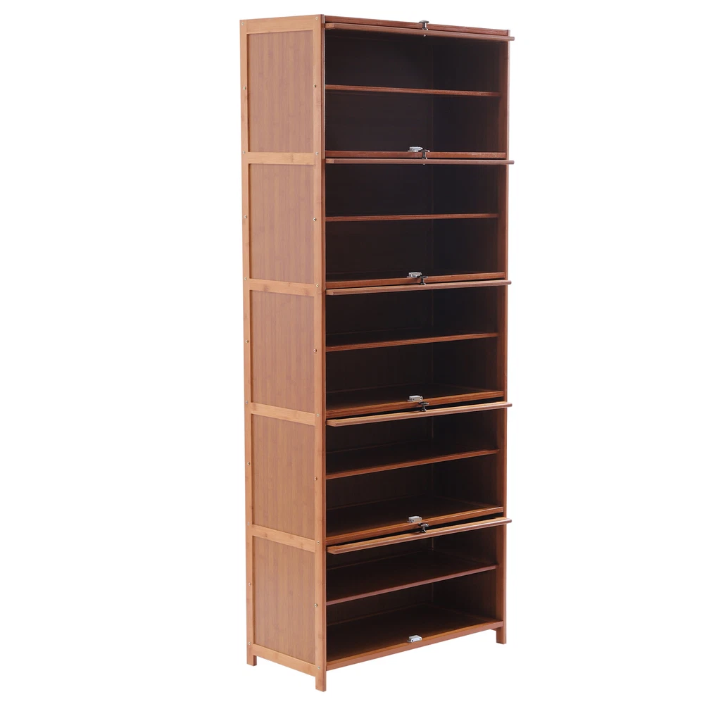 Specification Material: Nan Bamboo and Laminate Finish: Varnished Color: Brown Doors Included: Yes Shoes Capacity: 30 Pairs Assembly Required: Yes Mount Type: Floor Mount Shape: Rectanglar Packing Size: 181*36.2*16.5cm/71.25*14.25*6.49in Each Tier Height: 15cm/5.91in Product Size: 70*32*172cm/27.58*12.60*67.72in Gross Weight: 18kg/39.68lbs Net Weight: 17kg/37.47lbs Bearing Weight of Each Tier: 20kg/22lbs Package Included 1 x Shoe Cabinet 1 x Chinese User Manual All Accessories for Installation WELCOME 10-Tier Bamboo Shoe Rack Cabinet Wooden Shelf Stand Storage Book Shelf Organizer How to assmeble? Remember to override the side of the door suction with the iron plate 1. Remove the door suction laminate and the small screws for the door suction 2. Fix the door suction laminate to the side brackets with the large screws 3. Take out the back plate and insert it along the groove of the bracket. Remember to insert the metal strip into the hole, not into the groove Do not screw the front screws yet 4. Remove the door suction laminate and the back panel in turn 5. Take out the top laminate and the inner door laminate and install them with large screws 6. Remove the metal strip and insert it into the side brackets in turn. Door puller, door spacer with medium screws The metal strips are inserted into the recesses of the brackets As the screws are not screwed in step 5, the side brackets can be gently broken open Insert the metal strips into both ends of the door 7. Remove the door panel, door gasket, door pull ring and metal tabs and install them as shown in the picture 8. Break off the side brackets to the right, then snap the door panel into the brackets 9. Install the remaining door panels in sequence and tighten the screws. 1.Description Are you still troubled by the messy entryway? Are you still looking for a suitable entryway shoe rack? This shoe cabinet can not only give you a neat door but also meet your shoes storage needs. Its fully enclosed design protects against dust and moisture, while you can open the door to ventilate and disperse the smell, giving your shoes a dry, clean storage environment. It will be the ideal choice for you! Specification Material: Nan Bamboo and Laminate Finish: Varnished Color: Brown Doors Included: Yes Shoes Capacity: 30 Pairs Assembly Required: Yes Mount Type: Floor Mount Shape: Rectanglar Packing Size: 181*36.2*16.5cm/71.25*14.25*6.49in Each Tier Height: 15cm/5.91in Product Size: 70*32*172cm/27.58*12.60*67.72in Gross Weight: 18kg/39.68lbs Net Weight: 17kg/37.47lbs Bearing Weight of Each Tier: 20kg/22lbs 2.Package Included 1 x Shoe Cabinet 1 x Chinese User Manual All Accessories for Installation 3.Key Features High Good Material made of high-quality Natural Nan bamboo and laminate with a varnished surface, which is sturdy and waterproof to ensure a long service life Top Surface Platform can be used to place bags, keys, umbrellas, and other personal items , and you can also place some ornaments to decorate this shoe rack, which is pleasing to the eye Water-Resistant The smooth, waterproof surface makes it easy to clean. You can easily wipe off dust and stains with a damp rag. Durable Handle with a sophisticated rounded handle that fits comfortably in your hand and allows you to open and close the door with ease. Push-in Invisible has a concealed sliding design that slides up and pushes into the top for storage, so it won't take up external space. In addition, the magnetic iron tabs attach the doors more securely High Load-bearing Capacity The solid construction and thicker laminate ensure a strong load capacity of up to 20kg/44lbs per tier to meet your daily needs. Large Capacity: This 10-tier shoe cabinet can hold up to 3 pairs of adult shoes per tier, providing enough storage space to keep family members' shoes organized, and free from cluttering up the entryway for a cleaner and tidier room. All-around Protection: The back-sealed composite baffle will provide all-around protection for your shoes to avoid dust or being moistured. High-quality Material: It is made of high-quality Nan bamboo and laminate with a varnished surface, which is sturdy and waterproof to ensure a long service life. The natural bamboo is very healthy and environmentally friendly, which will not emit harmful gases or substances and makes it more secure for your family to use. Tiered Storage: Its multi-tiered design makes it easy to sort and store your shoes, either by type or by the owner, for easy selection and access. The intermediate laminates are also freely removable according to your needs, enabling the storage of tall boots or high heels. Versatile Decoration: The overall design of this shoe cabinet is simple and the color is vintage brown. Whether it is placed at the door or in the living room, it is very harmonious and brings a warm atmosphere to your space. Extra Storage Platform: The top platform can be used to place bags, keys, umbrellas, and other personal items, and you can also place some ornaments to decorate this shoe rack, which is pleasing to the eye. Easy to Assemble: The package includes installation instructions and the required accessories for your convenience. You can enjoy the pleasure of assembling it. Stable Placement: The wider tier plate provides better accommodation for larger sizes of shoes. At the same time, the raised strips on the front edge of the tier help to keep shoes securely in place and prevent them from falling out. High Load-bearing Capacity: The solid construction and thicker laminate ensure a strong load capacity of up to 20kg/44lbs per tier to meet your daily needs. Space Saving : This shoe cabinet makes full use of the vertical space and occupies a small area(27.58*12.60in), so it can be placed in every corner of the home without taking up too much space. Easy to Clean: The smooth, waterproof surface makes it easy to clean. You can easily wipe off dust and stains with a damp rag. 4.Details Raised Legs: The raised leg avoids direct contac