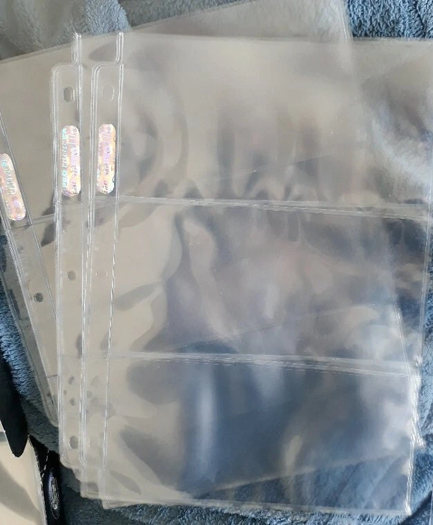 These Ultra PRO Platinum Hologram Series 3-Ring Binder Pages are suited for banknotes, proof sets, small envelopes and anything size 7 7/8" × 3 5/8" and are a must-have for any collector. You are bidding on ten (10) Ultra Pro 3-Pocket Platinum Album Pages that can hold up to 30 items. The clear pockets provide an easy view of yout collectibles and protect them from damage. They are perfect for organizing your collection. The pages are heavy-duty construction and are suitable for all your collecting needs. They are perfect for long-term storage and display of your collectibles. Shipped USPS First Class Mail. US shipping only (M,W,F) (0624)
