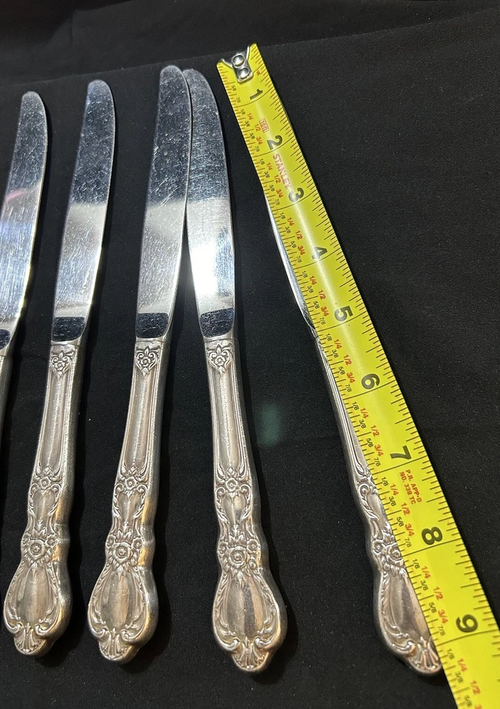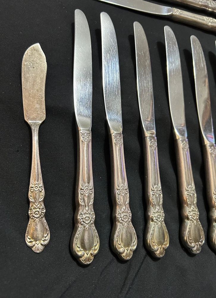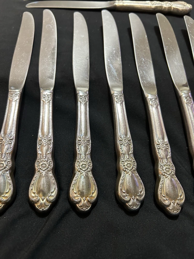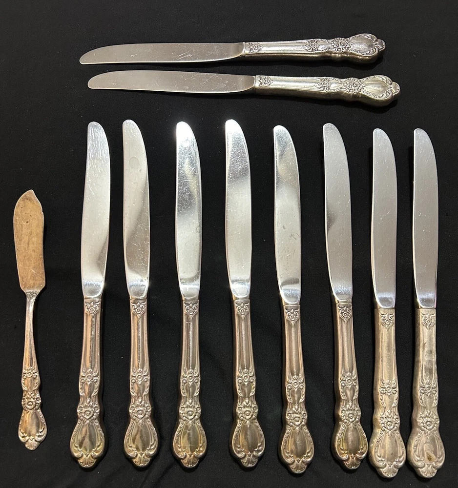 10 Vtg 1847 Rogers Bros Silver Plate Heritage Dinner Knives 9” & 1 Butter Knife Good used condition. Normal signs of wear and tear, minor scuffs and scratches. There is patina throughout. Please study pictures carefully before purchasing Feel free to ask any questions. Thank you for visiting our store! Bag5B