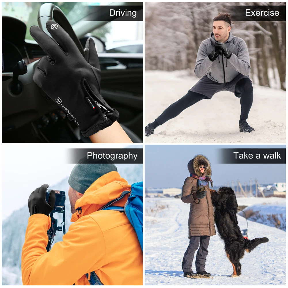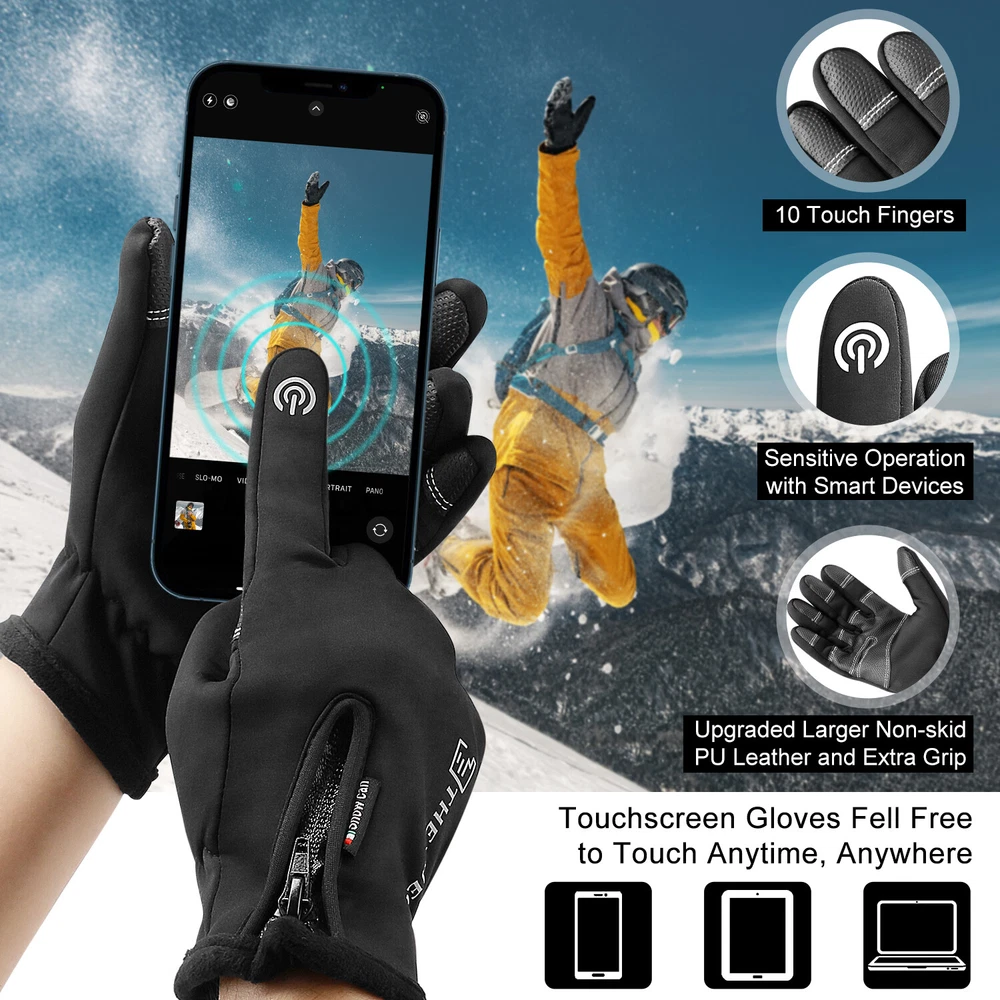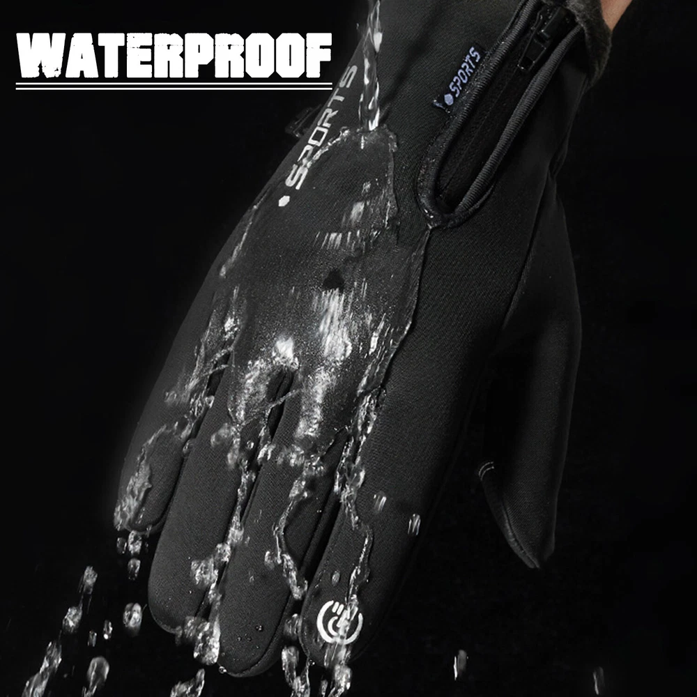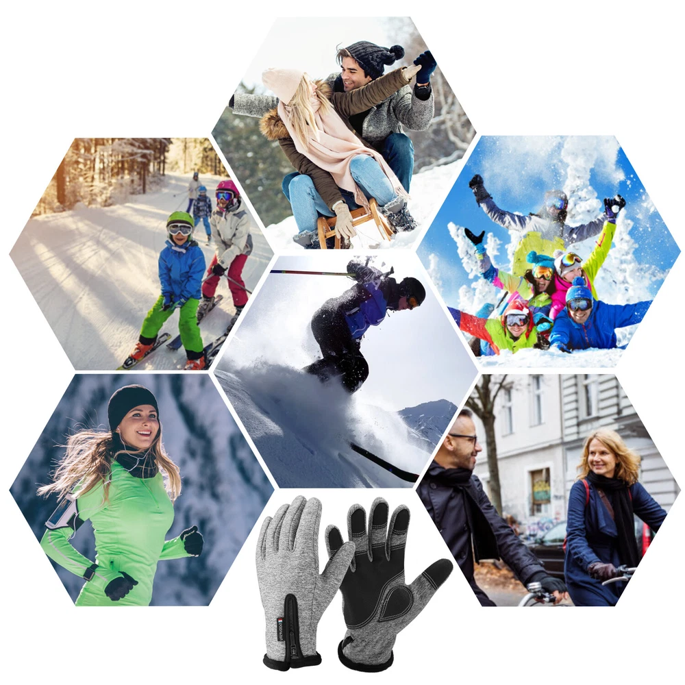 -10℃ Waterproof Winter Warm Ski Gloves Thermal Touch Screen Motorcycle Snowboard Decription: Our products are made of woolen windproof fabric for added warmth and comfort. Adjustable zipper for different size hands and easily take off gloves.Touch the screen with full-fingered PU gloves, more sensitive and no harm.s. This pair of gloves is worth having,In this winter. Size: Size S M L XL XXL Palm Width 2.76-2.95in 2.95-3.15in 3.15-3.54in 3.54-3.94in 3.94-4.72in Palm Circumference 6.69-7.08in 7.08-7.48in 7.48-7.87in 8.26-8.66in 8.66-9.49in Feature: [ Keep Hands Warm & Comfortable] Combined with the warm and soft polar fleece lining and stretchy cuff, these winter gloves not only lock the temperature on your hands and reduce the heat loss, but also absorb moisture and sweat. Say goodbye to the clamminess, your hands will always warm and dry while wearing these warm gloves. [Excellent Waterproof & Windproof ] with high-density waterproof membrane on the surface layer, these cold weather gloves for men can keep your hands dry and warm against melting snow or drizzle. No longer to endure the cold wind or wet to take the heat away in your winter daily activities. [Sensitive Touchscreen & Safety Anti-Slip Silicone] These women running gloves adopted with high-sensitivity conductive material on the thumb and index, help to control all your smart devices conveniently with gloves on. Coated with high-quality silicone on palms and fingers for enhanced friction and grip. Contribute to a higher efficient on daily work. [Flexible & Lightweight ] Unique 3D tailoring and high-stretchy Lycra greatly improve the flexibility and comfort of wearing. These snow driving gloves will fit your hands perfectly like your second skin. So that flexible enough to enhance movement for all the activities. Lightweight and sleek design allow you to take them easily wherever you go. Please Note:Water Resistance (Not Waterproof),gloves should not be immersed in water for long periods of time. Package Included: 1 pair Waterproof Windproof Sensitive five-finger touch screen gloves. Contact us: If you have any questions, please feel free to contact us to resolve the issue before opening a case or Negative, Thanks a lot!