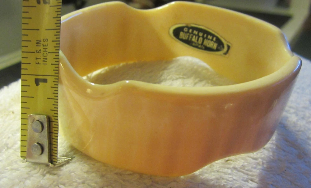 Colored Diamond Intensity: non Jewelry Department: Fashion Department: Women Style: Bangle Color: yellowish Brand: Unbranded Secondary Stone: No Stone Seller Notes: “Fine used shape with minor use wear for age. 10 inches outside diameter of bracelet.” Total Carat Weight: non Item Length: shown Base Metal: Buffalo horn Main Stone Shape: none Vintage: Yes Type: Bracelet Cut Grade: non Main Stone Color: none Main Stone: none Clasp Type: Bangle Bracelet Main Stone Treatment: non Main Stone Creation: none Diamond Color Grade: non Metal Purity: non Metal: non Country of Origin: Unknown Setting Style: non Certification: non Diamond Clarity Grade: non Material: Horn, buffalo horn