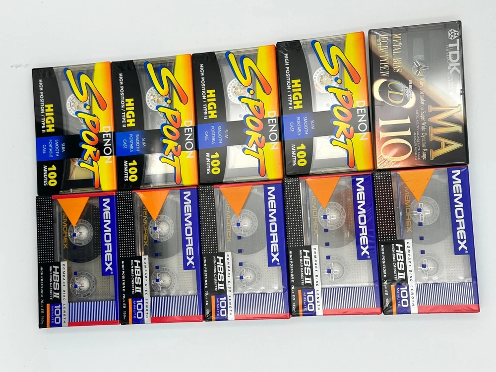 Elevate your audio experience with this set of 10 new and sealed cassette tapes, featuring renowned brands such as TDK, Memorex, and Denon. The lot includes the S-Sport series, ensuring high-quality sound for your listening and recording needs. Each cassette is meticulously crafted to provide you with a reliable and exceptional audio tape every time.Whether you're into music production, podcasting, or simply looking to enjoy your favorite tunes on cassette, this collection is perfect for you. The tapes come in a pristine, sealed condition, guaranteeing their integrity and performance. Add these cassettes to your audio arsenal and enjoy the classic feel of analog sound. With Memorex vintage carry case.