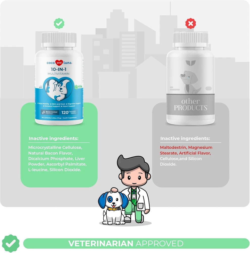 Store New Arrivals Add to Favorite View Feedback Contact 10 in 1 Multivitamin for Dogs - 120 Chewable Tablets with Glucosamine and Chondroitin - Fish Oil & Vitamins with Coq10 for Skin & Heart Health, Gut & Immune Support Description Age Range Description All Life Stages Item Dimensions LxWxH 2.5 x 2.5 x 5 inches Brand Name Coco and Luna Country of Origin USA Product Dimensions 2.5 x 2.5 x 5 inches; 4.59 ounces Active Ingredients function(f) {var _np=(window.P._namespace("DetailPageProductOverviewTemplatesJava"));if(_np.guardFatal){_np.guardFatal(f)(_np);}else{f(_np);}}(function(P) { P.when('A').execute(function(A){ A.on('a:truncate:po-attribute-truncate-3:updated', function(data) { var isTruncated = !data.truncateInstance.getIfTextFits(); var seeMoreElement = document.getElementById('po-attribute-see-more-id-3'); if(seeMoreElement) { seeMoreElement.style.display = isTruncated ? '' : 'none'; } }) }); })); Glucosamine, Chondroitin Sulfate (bovine), Methylsulfonylmethane (MSM), Milk Thistle Extract, Fish Oil, Lactobacillus Acidophilus, Vitamin C, Vitamin B3, Vitamin E, Pancreatin 4x, Vitamin B1, Vitamin B5, Vitamin B6, Vitamin B2, Vitamin A, Coenzyme Q10, Manganese, Vitamin B9, Vitamin B7, Vitamin D3, Vitamin B12 See more Product Benefits function(f) {var _np=(window.P._namespace("DetailPageProductOverviewTemplatesJava"));if(_np.guardFatal){_np.guardFatal(f)(_np);}else{f(_np);}}(function(P) { P.when('A').execute(function(A){ A.on('a:truncate:po-attribute-truncate-4:updated', function(data) { var isTruncated = !data.truncateInstance.getIfTextFits(); var seeMoreElement = document.getElementById('po-attribute-see-more-id-4'); if(seeMoreElement) { seeMoreElement.style.display = isTruncated ? '' : 'none'; } }) }); })); Supports Skin & Coat Health, Supports Liver Health, Immune Support, Multivitamin, Supports Joint Health See more Item Weight 4.6 ounces Specific Uses for Product Multivitamin Pattern Name Tablet Target Audience Keyword dogs Flavor Bacon and Liver Is Discontinued By Manufacturer No Item Form Tablet Brand Coco and Luna Item Package Dimensions L x W x H 4.41 x 2.09 x 2.09 inches Manufacturer VITA PET LIFE LLC Dog Multivitamin - Our dog supplement contains enzymes, Niacin, and probiotics that support your dog’s digestive health as well as having vitamin D for dogs and vitamin E for dogs to enhance their immune system. Skin and Coat - Our formula has Omega 3, Biotin, and a variety of vitamins that help your pet's skin and coat as well as providing hip and joint support. Liver and Kidney - Coco and Luna 10 in 1 is a dog vitamin that contains Milk Thistle which detoxifies impurities and harmful toxins that accumulate in your pet’s liver and kidneys. Veterinarian Formulated - Our supplements are veterinarian formulated and are free from harmful ingredients like Palm Oil, Corn, Soy Derivatives, Synthetic Colors, or Artificial Flavors, prioritizing your pet's well-being. Made in the USA from US and Globally Sourced Ingredients - All of our supplement products are manufactured in the USA in FDA-registered facilities that are NSF and GMP-certified in the USA. Product Description BENEFITS OF COCO AND LUNA 10 IN 1 MULTIFUNCTIONAL Immune Support Boost your dog’s immune system with the vitamins A, C, and E found in this incredible supplement. Hip and Joint Support Helps to support joint health and reduce any pain or discomfort your pet may be experiencing due to any joint maladies. Digestive Support The enzymes, Niacin, and probiotics in this product support your pet’s digestive health, lessening symptoms such as diarrhea, constipation, gas, and bloating. Do away with uncomfortable and disruptive conditions by giving your furry loved one on this natural supplement. Liver Support Our unique formula promotes detox and removes waste substances from the blood, helping to maintain the normal balance of fluids and minerals within your pet's body. Kidney Support Our formula contains vitamin E and vitamin C which provides overall kidney function support. Skin and Coat Support If your pet has been feeding off processed pet foods, it couldn’t hurt to put them on a DHA and EPA fatty acids supplement to ensure their skin health. Heart Health The coenzyme Q10 found in this supplement promotes heart health, giving your pet the chance to stay active. Provides a balance of essential fatty acids, such as EPA and DHA, protecting your pet's heart. Energy Booster Our unique formula promotes overall health and may increase your dog's energy. Containing vitamin E and vitamin C which are both antioxidants that by fighting free radicals, have the ability to slow aging and degeneration, and can even increase lifespan. About Coco and Luna 10-in-1 Multifunctional Health Support for Dogs - Milk thistle eliminates harmful toxins that accumulate in your dog’s liver and kidneys. Increases your pet’s mobility, allowing dogs of all ages to continue being active well past puppyhood. The Omega 3, Biotin, and variety of vitamins found in this natural supplement make your pet’s coat shiny and glossy, while also leaving your pet itch-free! Digestive Support - The enzymes, Niacin, and probiotics in this product support your pet’s digestive health, lessening symptoms such as diarrhea, constipation, gas, and bloating. Do away with uncomfortable and disruptive conditions by giving your furry loved one this natural supplement. Immune and Cardiovascular Support - The coenzyme Q10 found in this supplement promotes heart health, giving your pet the chance to stay active. Also boost your pet’s immune system with the vitamins A, C, and E found in this incredible supplement. PREMIUM INGREDIENTS Glucosamine Glucosamine has an anti-inflammatory effect, helping to reduce your pet's discomfort Helps restore joint health naturally, increasing mobility Improves lubrication in your pet's joints Milk Thistle It specifically protects the liver against toxins. Activates protein synthesis, and stimulates growth of new liver cells to r