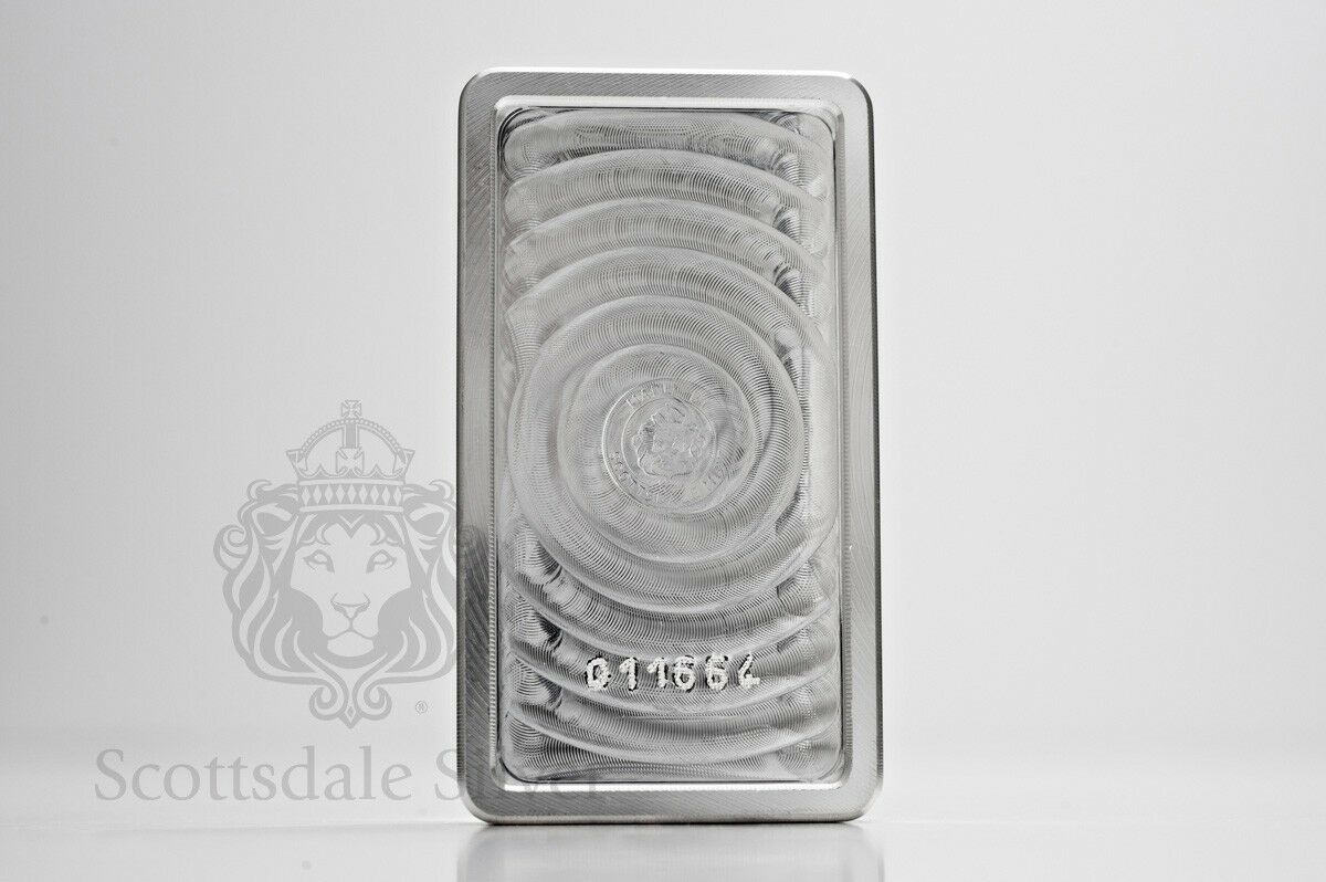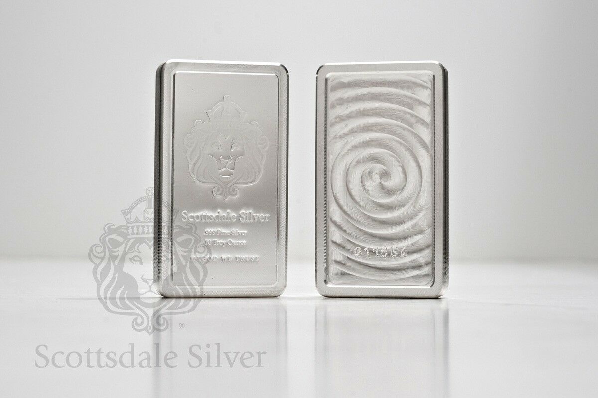 10 oz Scottsdale STACKER Silver Bar - Ten Troy oz .999 Silver Bullion Click to see supersized image Click to see supersized image Click to see supersized image Click to see supersized image Click to see supersized image Click to see supersized image Click to see supersized image Click to see supersized image Click to see supersized image SCOTTSDALE MINT presents: (1) 10oz Scottsdale STACKER ® Silver Bar 10 Troy Ounce Silver Bar .999 Pure Silver (Solid) Brand New The Stacker is back, and better than ever! Now featuring individual serial numbers. Precision machining at its finest. Nicknamed the Stacker ® , this 10 Troy Ounce bar's beveled, interlocking edges make it easy to create neat rows that will fit perfectly in your deposit box or safe. The logo and text is precision-stamped and the surface is highly reflective, giving the Stackers ® a clean uniform look. An anti-forgery swirl pattern with a light security Scottsdale Mint hallmark on the back adds to the good looks and exclusivity of this item. All good reason why this is this most popular silver bar in the World. Brand New .999 Pure Silver MADE IN USA. ISO 9001-2008 Certified and Qualified for IRA's. Dimensions: 73mm x 41mm x 11.4mm Each bar has its own unique serial number Private Auction - Allows buyers to remain anonymous to other eBay users Scottsdale Silver...the most distinguished name in bullion Free Regular Shipping and Free Insurance Upgraded Shipping available This auction will ship to the USA ONLY. Please contact us for options to ship internationally. Sorry, no APO/FPO/DPO. PayPal (accepts all major credit cards, PayPal balance, linked bank account, PayPal Credit (subject to pre-approval by PayPal) Due to the volitile nature of the Market: ALL SALES ARE FINAL & Payment must be made within 48 hours. Scottsdale Silver GUARANTEE: Whether you buy a Scottsdale Silver branded product or a different item from us, we 100% guarantee it to be authentic. When you buy directly from Scottsdale Silver & Gold you are purchasing from one of the most respected Metals Companies in the industry. Our facility is based in Arizona and we are one of the largest sellers of bullion on eBay. Check our Feedback and Bid with Confidence. Why take chances buying from private individuals or lesser known sellers? Email us through the Ebay system or Google "Scottsdale Silver" Track Page Views With Auctiva's FREE Counter