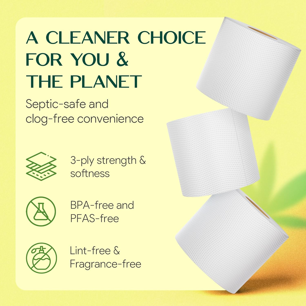 Tree-Free: Palm Naki bamboo toilet tissue – Made from bamboo. Biodegradable and sustainable. A tree-free alternative to paper-based toilet tissue Stronger: Bamboo is renowned for its strength and tear resistance. Absorbent 3-ply bamboo tissue is more durable than regular toilet tissue Pure: Free from inks, dyes, BPA and PFAS for an all natural experience. Every wipe feels clean and fresh, with no lint, dust, or residue left behind Comfort: Palm Naki 100% Bamboo tissue are gentle on your skin and soft to the touch, particularly for sensitive feminine areas Rapid Dissolving: Bamboo dissolves quickly and easily and is safe for all septic systems, especially good for RVs, camping and boating Product description