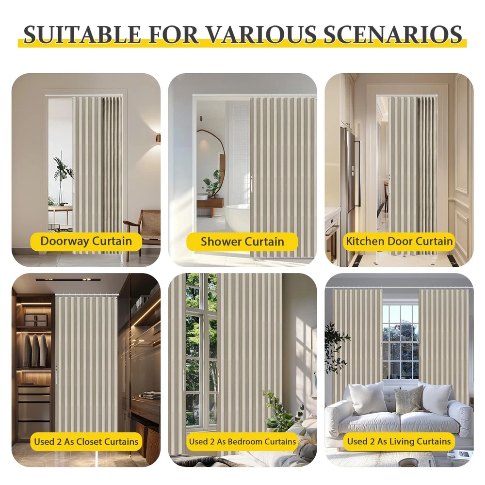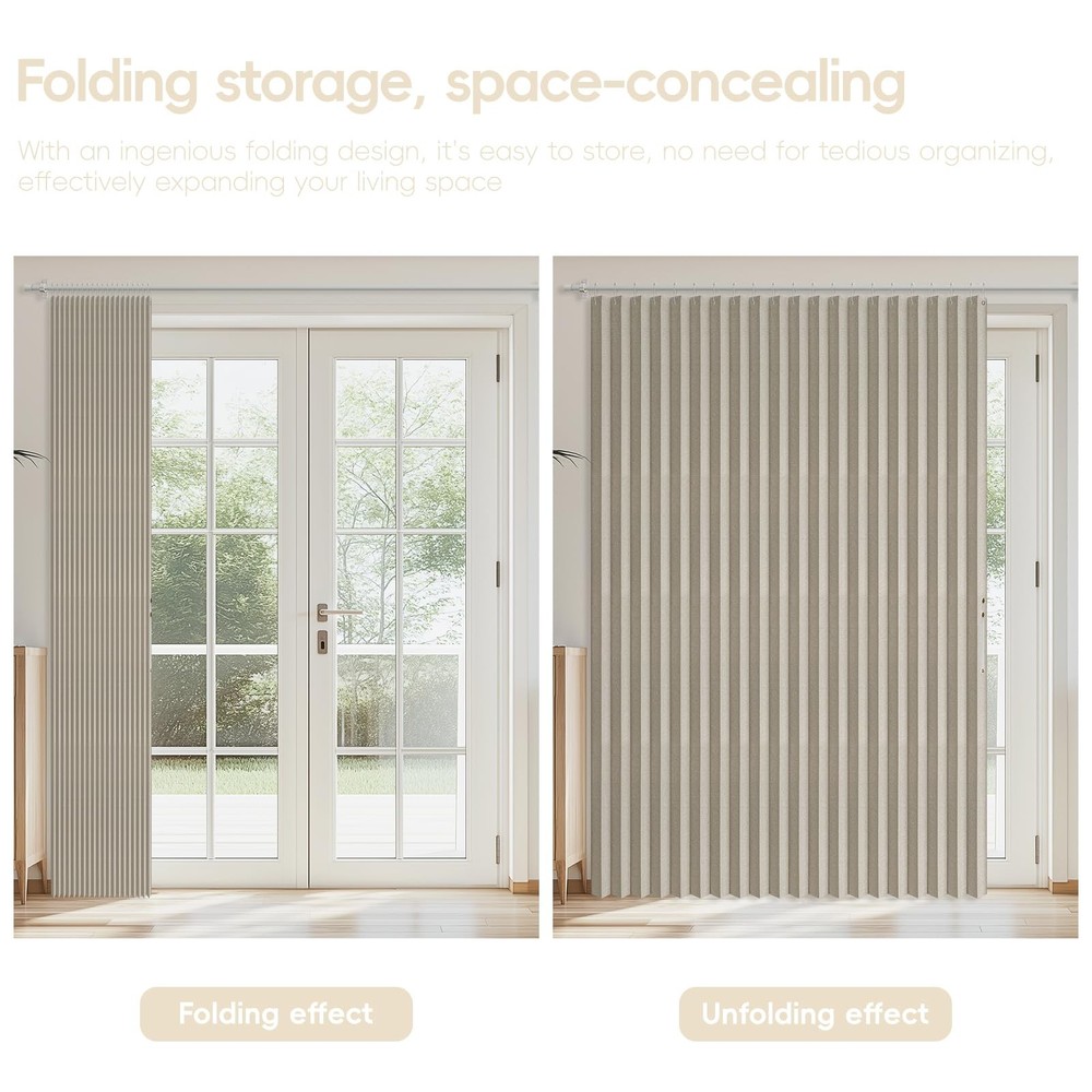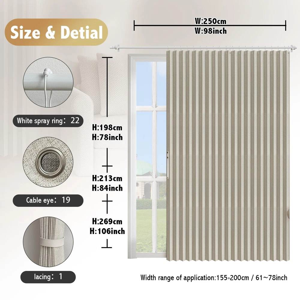 【The package contains 】1 Curtain Panel, 19 stainless steel metal cable eyes, 1 adjustable strap, 19 rust-proof white hooks (1.62-inch inner diameter) suit for most curtain rods (rods not included). 【Full Blackout Fabric Material】:100% blackout curtains use high-density materials to effectively block outside light and provide the best protection for your private space. Summer shading heat insulation, winter thermal insulation. 【Accordion Design】 : Accordion folding design is beautiful and generous, but also save space, suitable for a variety of Windows, doorways, wardrobes, courtyards, partitions, add a modern sense of fashion for home decoration. 【Multi-functional】 : Suitable for bedroom, living room, dining room, kitchen, bathroom, home office and other occasions, can be used as blackout curtain, door curtain, closet door curtain, sliding door curtains, patio door curtain, partitions. 【Size Description】 : 98" W (W 250cm), suitable for 61 to 78 "wide openings, length 78" /84 "/106" options. To meet your different size needs. 【Easy maintenance】: Select high quality fabric material, high temperature wrinkling; Durable, easy to clean and maintain, to ensure long-term use of beauty and functionality.