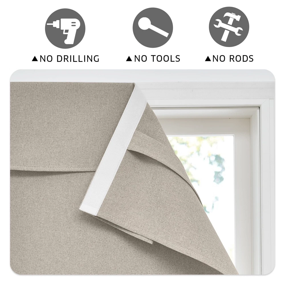 100% Blackout Linen Door Curtains with Adhesive Strips, 1 Panel Our blackout door curtains block 100% of light and UV rays. Includes 1 panel + adhesive strips for easy installation. Perfect for French doors, front door, and back doors. Thermal Insulated Energy-saving fabric reduces heat transfer by about 30%. Keep rooms cool in summer and cozy in winter while enjoying peaceful privacy. 4 Size Options for Every Space 8"x36" for classroom narrow sidelights | 26"x40" for standard doors | 12"x69" for sidelight windows | 26"x69" for standard doors | 36"x72" for wider doors. Choose your perfect fit! No Tools Needed Installation Skip curtain rods! Attach directly to glass/smooth surfaces in 3 minutes using included adhesive strips. Adjustable for temporary or permanent use. Luxury Feel & Easy Care Silky-soft 100% polyester. Machine wash cold, tumble dry low – maintains like-new quality for years. Package Includes: 1 premium blackout curtain panel (26"W x 69"L) + 1 adhesive strip. Perfect for French door, front door and back door window. Total Blackout & Privacy: Enjoy complete privacy and the perfect sleep with our fully blackout door curtain. It blocks 100% of light, creating a dark, peaceful space. Ideal for shift workers, nap lovers, and anyone seeking restful sleep. Diverse Colors and Sizes: Choose from a wide array of colors and sizes to meet your unique needs. Whether you're decorating your doors in a bedroom, living room, dining room, or kitchen, these blackout linen door curtains blend seamlessly into any space in your home. Easy Installation & No Tools Needed: Skip the rods! Attach directly to glass or smooth surfaces using the adhesive strip. Follow our step-by-step guide for a seamless setup in minutes. Easy Care: Easy to maintain and machine washable. Use only non-chlorine bleach & warm iron when needed. Tumble dry low.