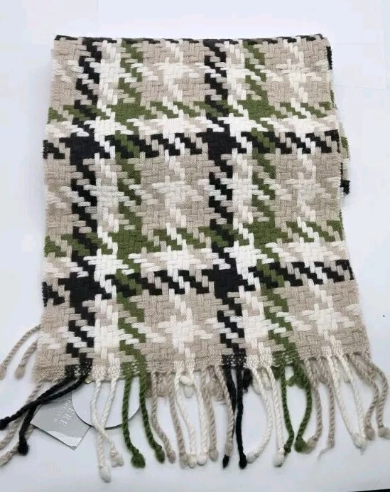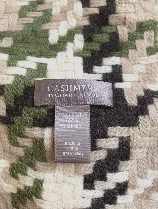 Elevate your style with this stunning multicolored plaid scarf from Charter Club. Made from 100% cashmere, this rectangle scarf features fringed ends for an added touch of elegance. The scarf measures Approx.. 9.5 in x 63 in and is perfect for both men and women. The beautiful combination of green, tan, and black colors makes it easy to pair with any outfit. New with Partial Tag Retailed $95