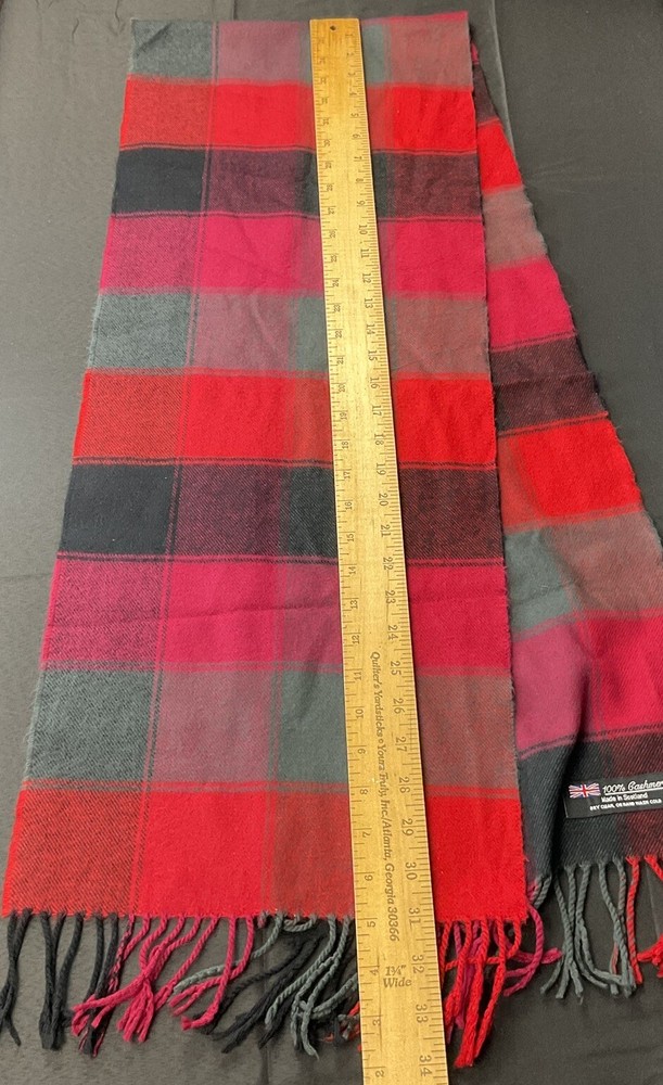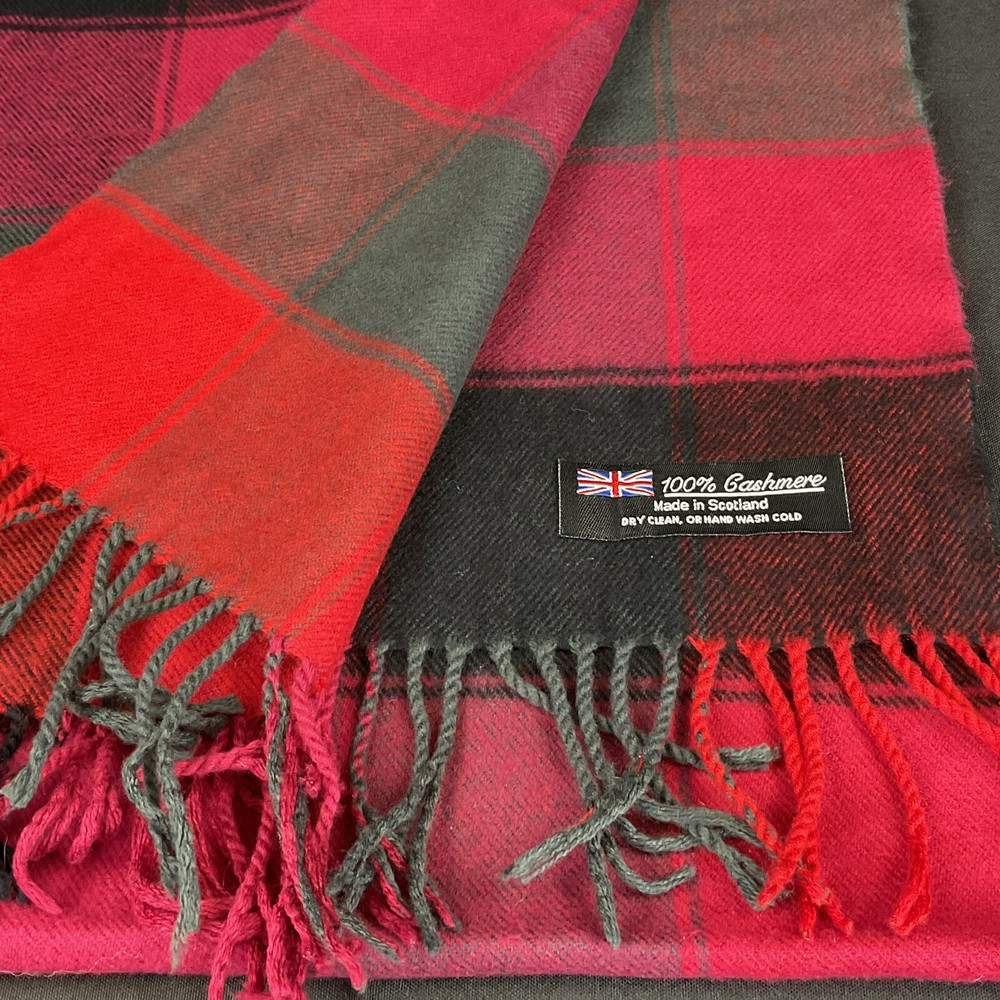 100% Cashmere red, pink, black, and gray tartan plaid scarf with fringe. Made in Scotland. Dry clean or hand wash. Excellent preowned condition. Please see photos for additional details.