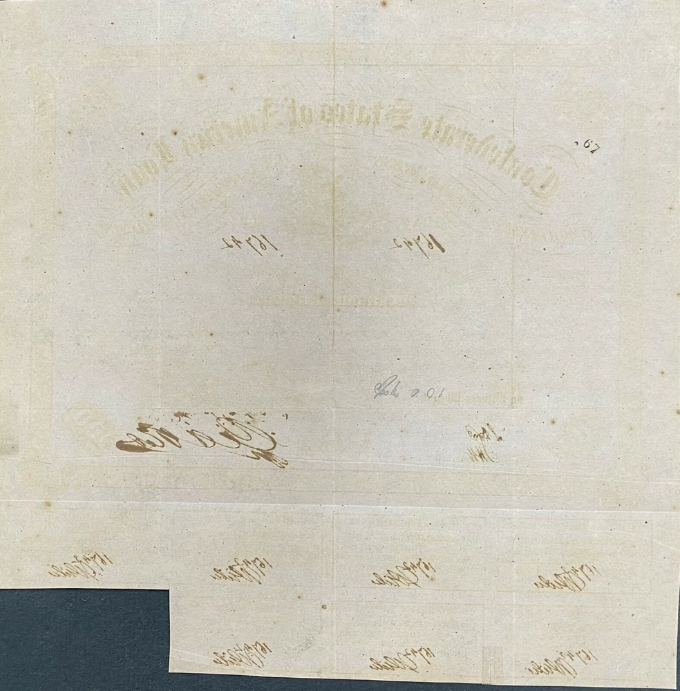 $100 Confederate States Coupon Bond – Criswell 120, Ball 212 Offered for your consideration is a $100 bond issued by the Confederate States of America under the Act of February 20, 1863. It was catalogued by the late Grover Criswell as Cr. 120 and by the late Dr. Douglas Ball as B. 212. The central vignette depicts a standing Confederate officer in his uniform, one hand on his sword and the other resting against a tree. He gazes at a distant body of water, traditionally identified as the Rappahannock River. A group of mounted soldiers can be seen dimly in the background. Immediately above this scene, presented in an arc, is printed “Confederate States of America Loan” , as well as “ AUTHORIZED BY THE ACT OF CONGRESS C. S. A. of FEBRUARY 20 th 1863. ”, while below is the financial obligation, executed in a lovely italic script. According to this obligation, “On the first day of July 1868, the Confederate States of America, will pay to the Bearer of this Bond … the Sum of One Hundred Dollars, with Interest thereon from date, at the rate of Seven per Cent. per annum …” . It further states that “… This contract is authorized by An Act of Congress approved 20 th February 1863, Entitled “An Act to authorize the issue of Bonds for funding Treasury Notes,” and is upon the Express Condition that said Confederate States may from time to time, extend the time of payment for any period not exceeding thirty years, from this date, at the same rate of interest …” . It was signed and sealed “… at Richmond, this second day of March 1863 …” by “C A Rose” in his capacity as an assistant “ for Register of the Treasury” . A second, smaller vignette, depicting what appears to be a race between a sidewheel seamer on a river and a train on the shore behind, can be seen at the bottom. A decorative border encloses the above elements, neatly separating them from the seven remaining interest coupons. Each of these coupons is valued at “THREE 50/100 DOLLARS” and is hand signed by “N Giles” (Miss N. Giles), a female employee of the Confederate treasury. This bond was printed on the same pink paper used on two other bond types and some of the currency issued at the same time. In common with most government bonds of this era, the back is blank. Confederate financial records indicate that 31,066 bonds of this type were originally issued, a considerable amount given the time and the military situation (the authorizing act was passed less than 3 months before the stunning Confederate victory at Chancellorsville, and less than 6 months before the dual losses at Gettysburg and Vicksburg). While not particularly rare, this bond is very popular with collectors and framers alike. This is a great opportunity to add one to your collection. Charles A. Rose served as one of two assistant registers, the other being E. Apperson. Little is known of him except that he was 53 years old when he was appointed in 1863 and was a Richmond notary public. He had worked for the treasury department earlier, with his initials (CAR) appearing on numerous bonds. Following his appointment, Rose remained as an assistant register until the close of the war. Very minor toning is present across the entire surface of the presently offered specimen, imparting to the bond a somewhat subdued appearance. Numerous foxing spots are scattered throughout the design, though most of these are relatively small (those in the selvage and on the back could be easily hidden if this piece were framed). The contrast is average for the issue, with the manuscript additions remaining relatively sharp and bold. In common with virtually all documents of this size and type, numerous storage folds and creases are present, though none of these appear to have compromised the integrity of the paper (many of these folds occurred when the bonds were placed in safes or the cubbyholes of desks). Numerous small pinholes can be seen when the bond is held to the light. Minor ink erosion and spreading can be seen at the manuscript additions, particularly at Rose’s signature (this is a result of the poor quality of the paper and the acidic nature of the ink). This interesting and historic reminder of the Lost Cause measures approximately 13¾ x 14 inches, and would look great framed in an office or den. A charge of $6.95 will be added to the winning bid for postage and insurance. A $5.00 charge will be added to any item picked up in person at our physical location. If you have any questions concerning this item, please ask before purchasing. Buy or Bid with Confidence – American Coins& Collectibles President Richie Self has worked 6 years as a paper money grader/authenticator. He has contributed to numerous reference books within the industry, as well as being a co-author of “The Comprehensive Catalog and History of Confederate Bonds, 2 nd Edition” with Douglas B. Ball, Ph.D., Henry F. Simmons, M.D., Ph.D. and James R. Desabaye. Mr. Self is a life member of the American Numismatic Association, the Society of Paper Money Collectors, as well as numerous regional numismatic associations. He is an authorized submitter to NGC, PCGS, and PMG, a diamond founding member of Coin Dealers Helping Coin Dealers and a supporter of the Industry Council for Tangible Assets. American Coins and Collectibles can be found at many of the state and local coin shows. American Coins and Collectibles Shreveport, LA