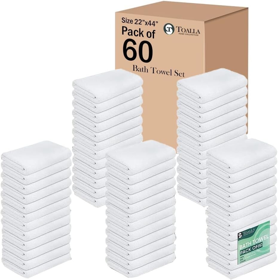 100% Cotton Bath Towel Set Pack of 60|500 GSM|Soft Large Bath Towel|Super Absorbent|Quick Dry|Ideal for Pool Home Gym Spa Hotel|Perfect for Daily Use|Bath Towel Set 24 x 44 Inches|White COTTON - Bath Towels are professionally crafted from pure cotton fabric to provide hotel-quality towels that feel super soft to the touch. COMMERCIAL-GRADE - These White Bath Towels are designed not only for personal and home use. They are also ideal for commercial utilization, such as for College Dorm Room Essentials, Gym, Salon, Spa, Resort, Hotel, and more; also perfect for cleaning and drying dishes. EXTRA ABSORBENT - Our Towels make the best all-around utility towels as they are extremely lightweight, low-maintenance, and quick drying. They are made for maximum absorbency that's why they make a great towel for drying hair and body after taking a bath or swimming. DURABLE CONSTRUCTION - Featuring double-stitched hems, our Cotton Towels create a neat, finished hemline that adds up as extra protection against fluff on raw edges that can result in towel damage. They are safe for machine wash and can be reused multiple times. VALUE PACK - For This lot you will get 60 pieces of Classic White Towels at an economical price. This is a great deal for business owners who are always in need of quality yet affordable towels: for hair care salons, massage parlors, and more!