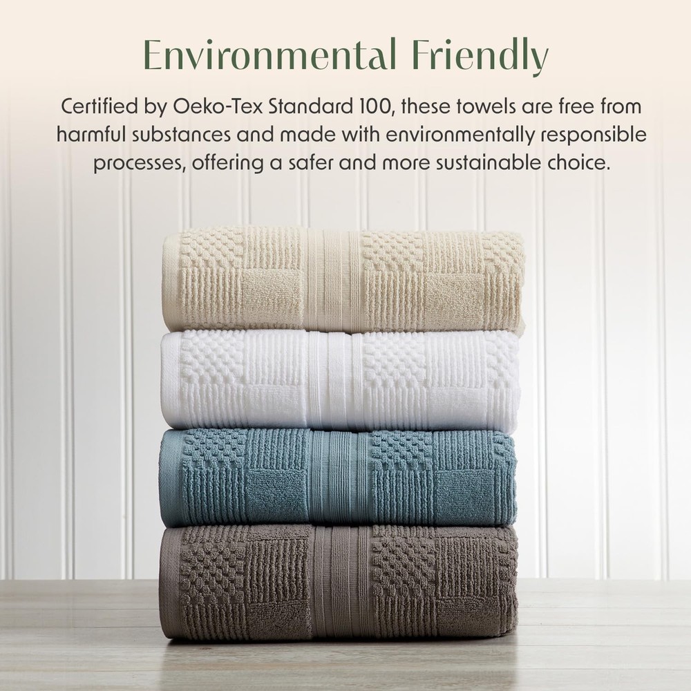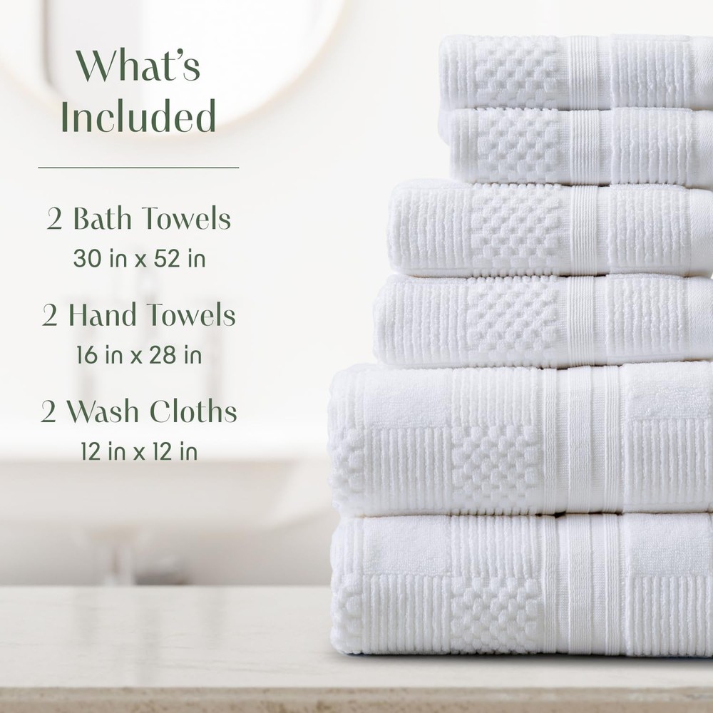 100% Cotton Textured Bath Towel, Hand Towel, and Washcloth. Durable and Absorbent. Wide variety of colors to accommodate and bathroom design and décor. OEKO-TEX Standard 100 certified, no harmful chemicals. SET INCLUDES : 6-Piece set of 2 Bath Towels 30" x 52", 2 Hand Towels 16" x 28", 2 Wash Cloths 12" x 12" QUALITY : Made of 100% High Quality Cotton for Ultimate Comfort and Durability. Our towels are 600 gsm with provides extra absorbency and the textured fabric dries quickly and completely. MADE IN GREEN : OEKO-TEX Standard 100 certified no harmful chemicals. Feel good about using our towels, they are safe on your skin and good for the environment! EASY CARE : For best care to keep your towels soft, fresh, and Absorbent. Machine wash cold with like colors and tumble try on low heat or hang to air dry. Avoid Dryer Sheets for maximum absorbency! SATISFACTION GUARANTEED : We love our towels and we want you to love them too, In fact we love them so much that we use them ourselves! If you are however unsatisfied, contact us and we will make it right.