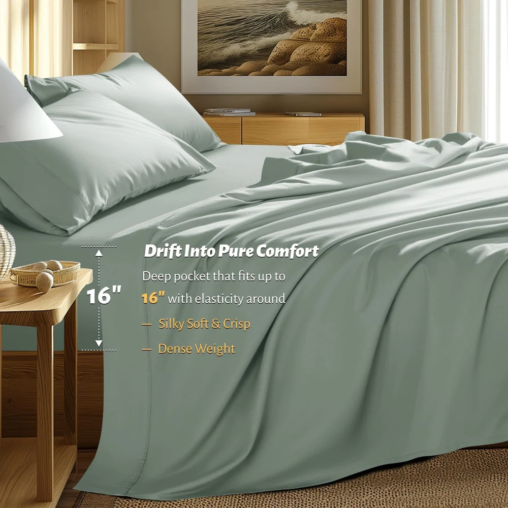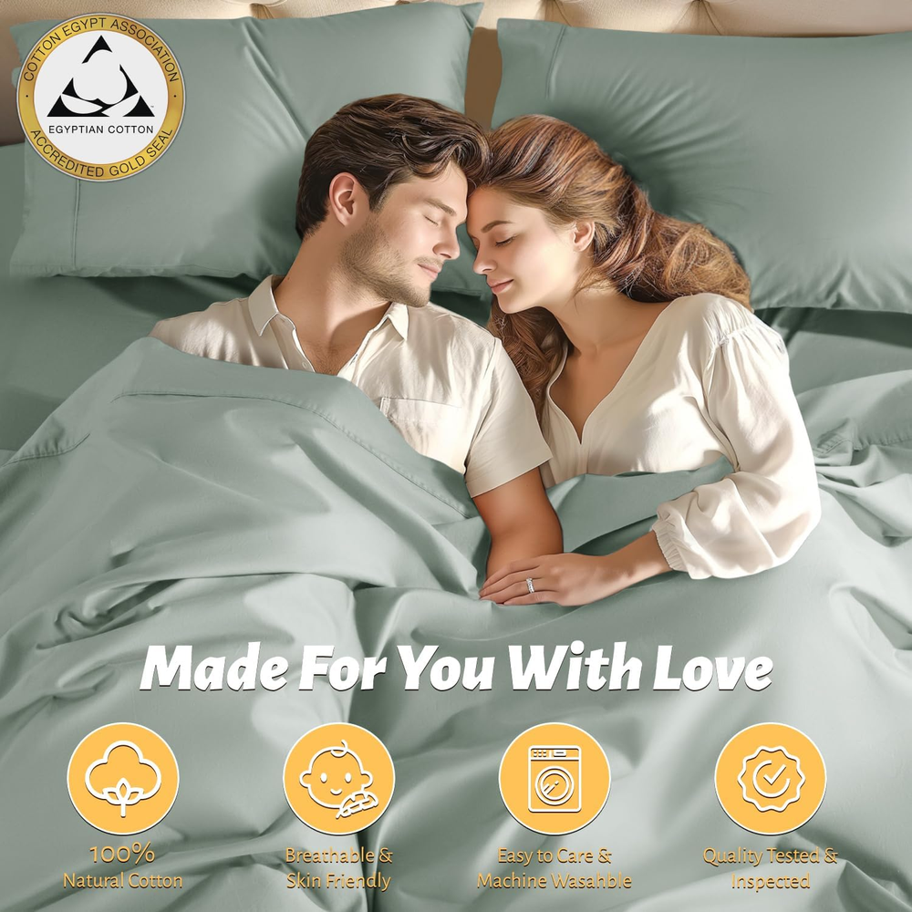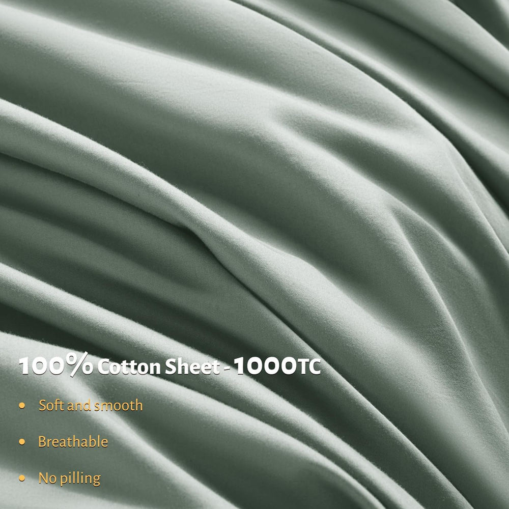 Store New Arrivals Add to Favorite View Feedback Contact 100% Egyptian Cotton Queen Size Sheets Set - 1000 Thread Count,Luxury Cotton Bed Sheets,Breathable & Cooling Bedding and Pillow Cases, 16 Inch Deep Pocket - 4 Piece (Sea Glass, Queen) Description Item model number 56CMSJT Closure Type Envelope Style Modern Included Components Fitted Sheet,Flat Sheet,Pillowcases Color 06 - Sea Glass Pattern Solid Fabric Type 100% Cotton Material Cotton Country of Origin China Item Weight 4.64 pounds Pillowcase Quantity 2 Age Range (Description) All Ages Thread Count 1000 Seasons All Number of Pieces 4 Special Feature Breathable Package Dimensions 14.76 x 9.65 x 4.17 inches Product Care Instructions Machine Wash Size Queen 100% Cotton 100% PURE COTTON FOR PREMIUM COMFORT & SOFTNESS:Imagine slipping into bed every night and feeling the softness of our certified 1000 thread count sateen 100% cotton sheets against your skin. It's like having a five-star hotel experience in your own bedroom! You'll feel cool and comfortable in all seasons with our luxury sheets set CERTIFIED GREEN WEAVING & DYEING: All fabric used are 100% Eco friendly, Chemical free and certified AZO FREE, making it soothing for even the most sensitive skin. These deep pocket sheets are Standard 100 by OEKO-TEX, leaving no worries of thread count & performance SNUG FIT:Looking for a fitted sheet in the 4-piece set that actually stays in its place and doesn't come off? Our fitted sheet comes with an all-around elastic to fit your mattress perfectly. The head/foot side indicator tells you how to make the bed easily. WHAT'S INCLUDE: Each Queen Size Sheet Set comes with 1× Fitted Sheet 60"×80"×16" + 1× Flat Sheet 90"×102"+2× Pillowcases 20"×30". Care Guidance: These sheets are finished with high-strength stitching and are low-maintenance. Machine wash your sheets in cold water, tumble dry low, and iron on low heat when needed. If you prefer wrinkle-free bedding, use a short dry cycle and take your sheets out promptly from the dryer. ENHANCED SLEEP ENVIRONMENT: Elevate your sleep experience with our luxury 1000 thread count cotton sheets. The natural breathability properties of our cotton create a comfortable sleep environment, keeping you cool and relaxed throughout the night. Ideal for all seasons, these sheets provide a soothing touch and very suitable for hot sleepers Product Description ABOUT US We’re committed to offering great deals on quality products you can trust. From home décor and garden essentials to tools, hardware, and pet accessories, there’s something for everyone at prices you’ll love. SHIPPING Orders ship directly from the USA for fast and reliable delivery. Most items ship within 1 business day and include free shipping to the lower 48 states. International orders are fulfilled through eBay’s Global Shipping Program. Simply proceed to checkout to view shipping costs, duties, and taxes for your country. FREE RETURNS We offer a 30-day return policy on items you are not completely satisfied with. You may choose a full refund or an exchange.. CUSTOMER SATISFACTION We do everything we can to ensure every customer is fully satisfied. If something is not right, send us a message and we will take care of it quickly.
