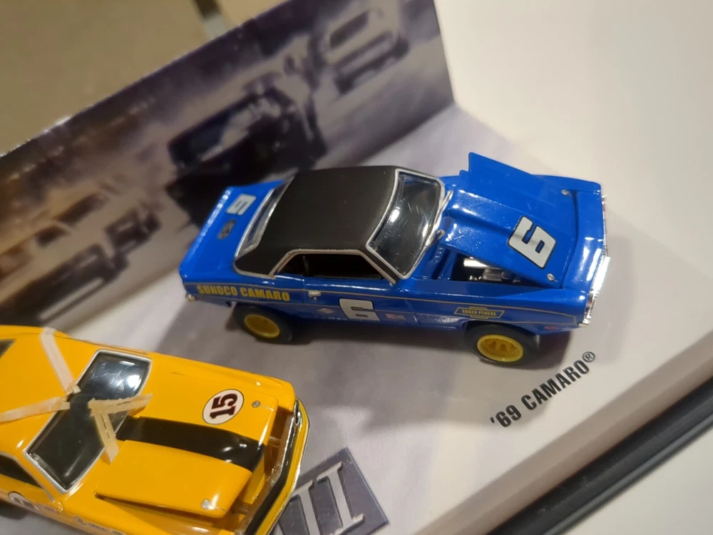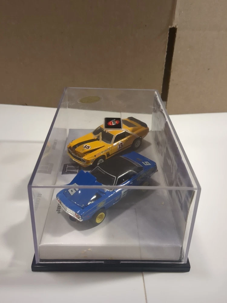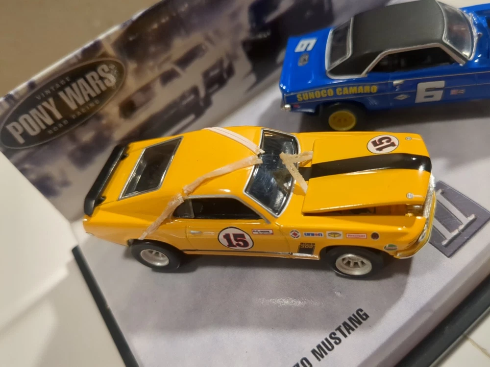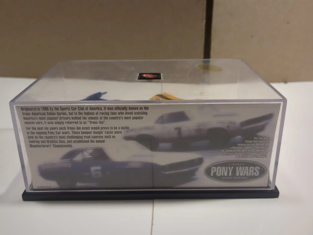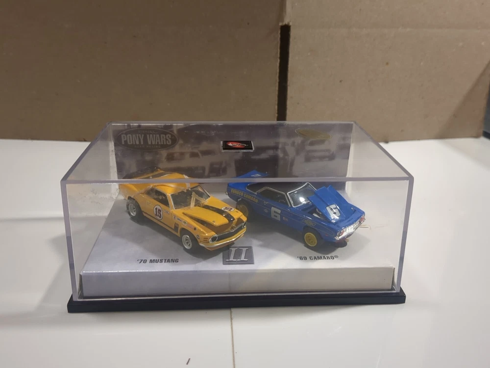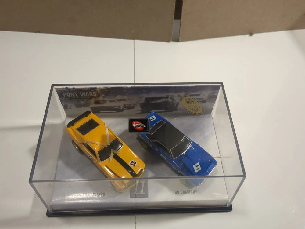 This Hot Wheels Limited Edition Pony Wars Road Racing Set is a must-have for any diecast car collector or fan of the iconic '70 Mustang and Camaro. The set features two 1:64 scale diecast cars in yellow and blue colors, with no modifications made to the vehicles. The cars are from the 2002 series and are perfect for boys and girls who love cars. The set is made of high-quality materials and features limited edition features, making it a great addition to any collection. This item is perfect for those who love Hot Wheels and are looking for a unique and rare piece to add to their collection. Loose,, No box,,, Condition issues see pics