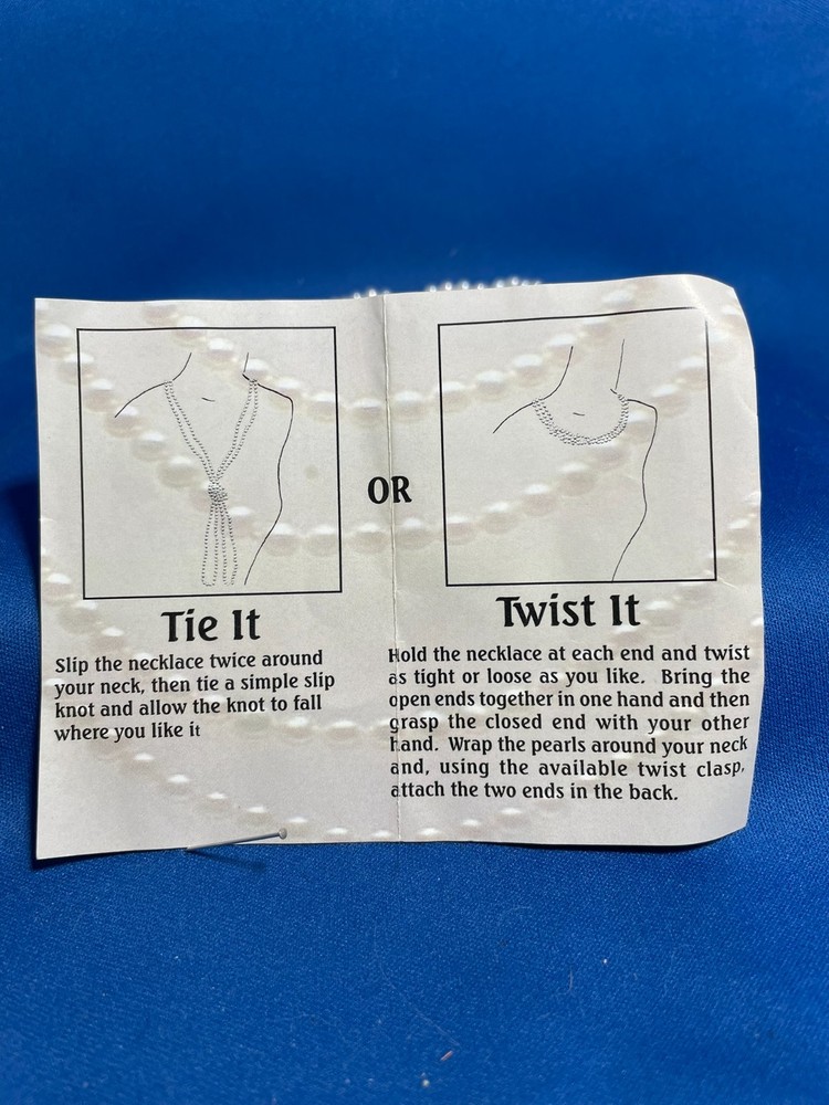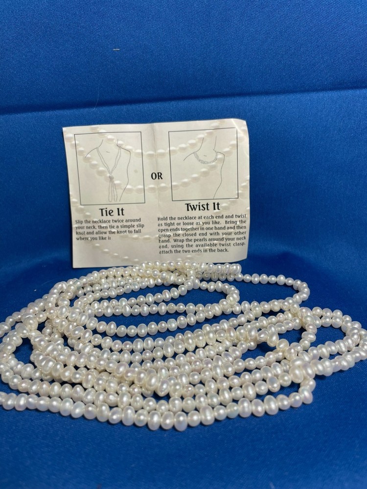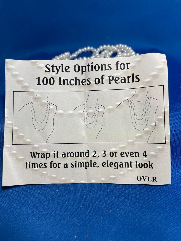 STYLE OPTIONS FOR 100 INCHES OF PEARLES. WRAP IT 2,3 0R EVEN 4 TIMES FOR A SIMPLE, ELEGANT LOOK. TIE IT, OR TWIST IT. MANY DIFFERENT WAYS TO WEAR THE PEARLES FOR FASHION LOOKS. GOOD CONDITION.