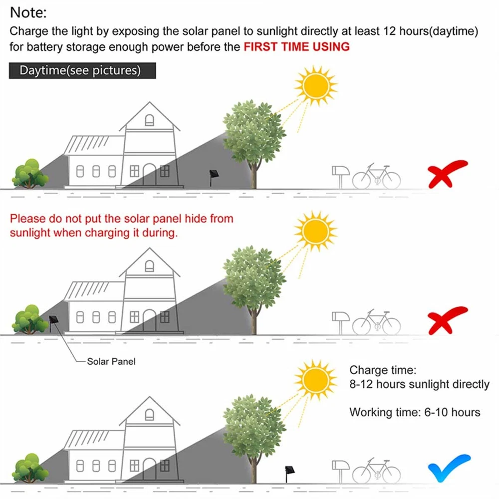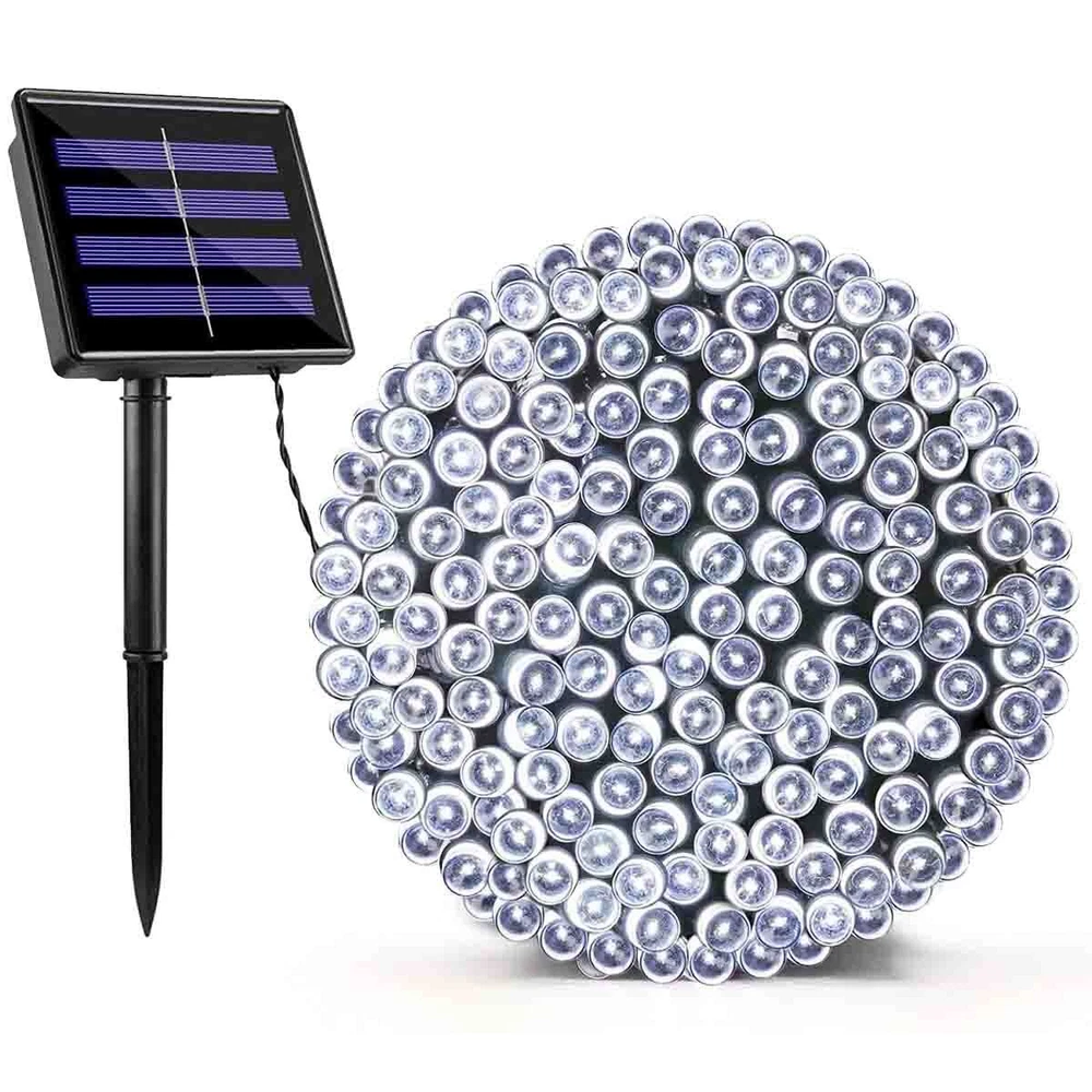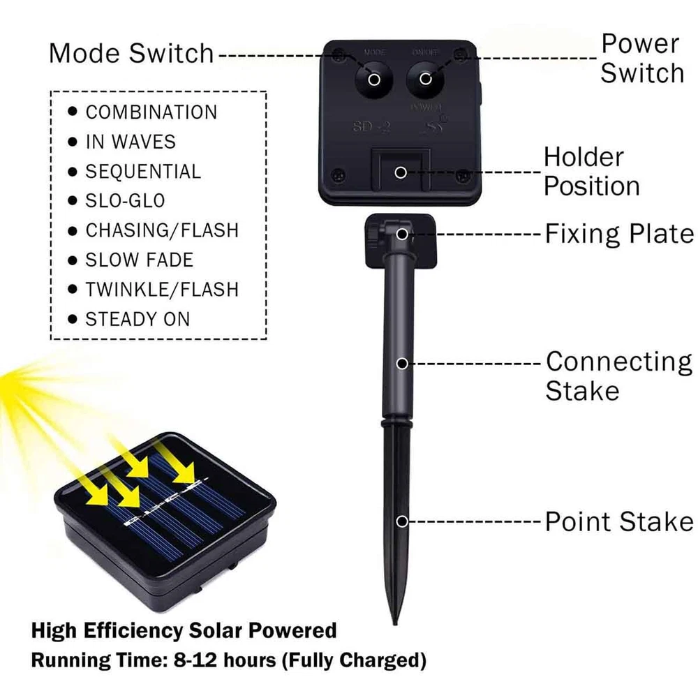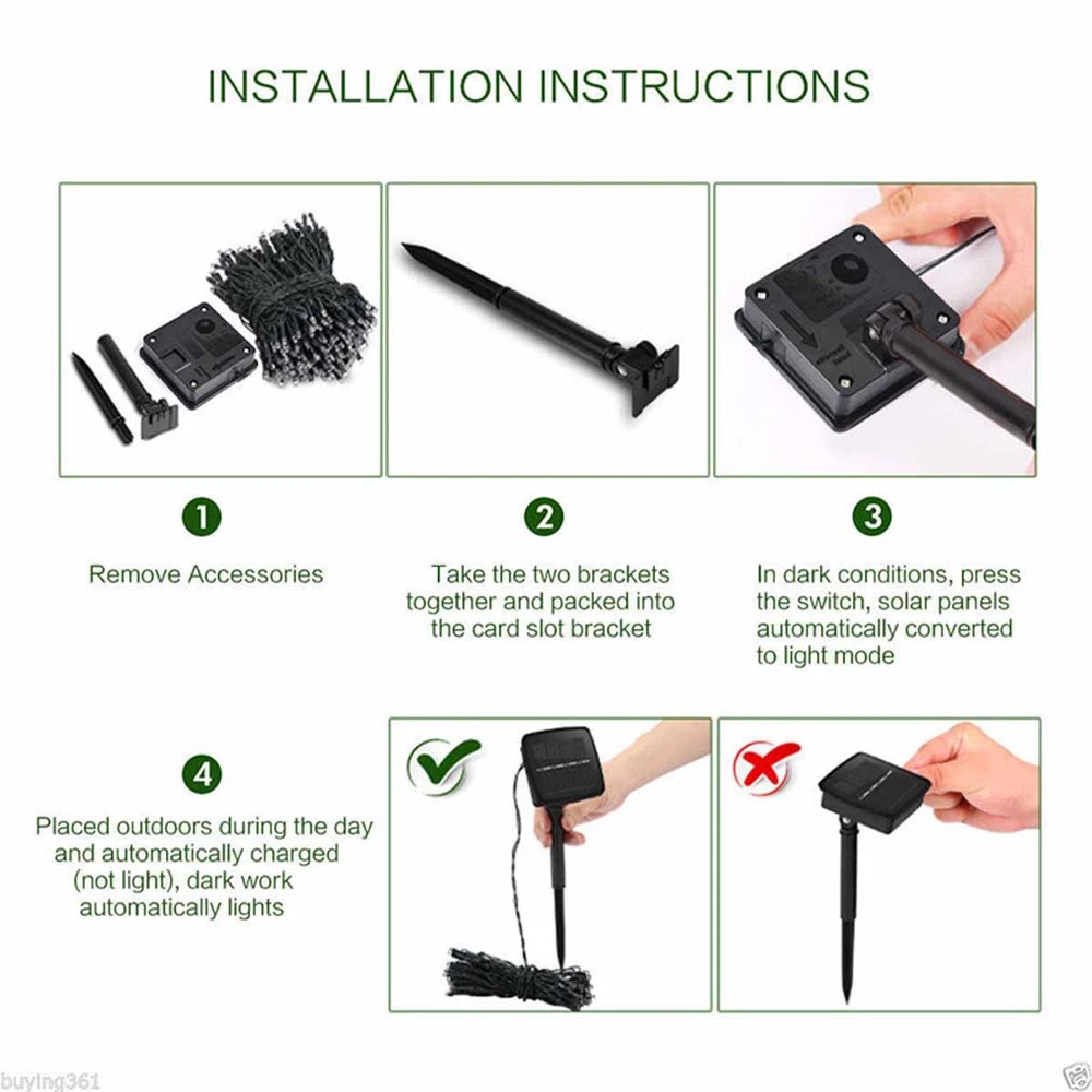 Solar Christmas Lights 39ft 100 LED 8 Modes Solar String Lights Waterproof Solar Fairy Lights for Garden, Patio, Fence, Balcony, Outdoors High Efficiency Solar Panel & Adjustable Design Less charging time and more working time, full charge of 6 hours will work more than 8 hours. No extra electricity consumption occurred Adjustable design enables solar panels to absorb sunlight energy efficiently. 100 LED solar string lights Solar-powered led light strings, low voltage power, non-plug-in, no utility energy costs. Energy-saving outdoor solar lights, high energy conservation rate. Lighting sensor technology: the string lights will light up automatically at dusk and automatically turns off at dawn. Waterproof: The solar Christmas lights can withstand all kinds of weather(IP65), including heavy rain and snow, perfect for indoor and outdoor decorations. What's in the box? 1 x 100 LED Solar String Lights 1 x Solar Panel with Ground Stake 1 x User Manual Solar Christmas Lights 39ft 100 LED 8 Modes for Christmas , Garden, Patio, Fence, Balcony, Outdoors Decorations 8 Modes & Memory Function Just need to press the mode button and selects 8 different modes to satisfy your diverse needs. Super convenient. Build in Memory chip save your last modes setting and no need to reset mode every day. Light up your event/festival Ideal light for adding a fantastic atmosphere to your backyard, patio, gazebo, lawn, or use as a festoon to celebrate your wedding, anniversary, or graduation in style. Impress your bistro, cafe, or party guests with ambiance. Easy to install & Auto ON/OFF Built-in Lighting sensor technology, the string lights will light up automatically at dusk and automatically turns off at dawn. All you need to do is set it up and the lights will work automatically. Just hang the lights anywhere you like, set the panel somewhere it will get lots of sun, and use the stake to position it. NOTES How to check the string lights work during Daytime? A. Completely cover the solar panel ,the String Lights will light up. B. If not, Leave the Solar Panel in the sun for an hour and then completely cover the solar panel again and it should light up. Make sure that the solar panel is NOT sheltered from the sun, because it needs to absorb enough energy from the sun. It is ONLY designed to be protected from rain. Please do NOT immerse it in the water. The solar string lights have a memory function . It will return to your previous setting when you turn it off and turn it on again. The solar panel is with light sensor feature ,so that the string lights can automatically turn off at dawn and turn up at dusk. On May 28, 2025 at 23:54:45 PDT, seller added the following information: