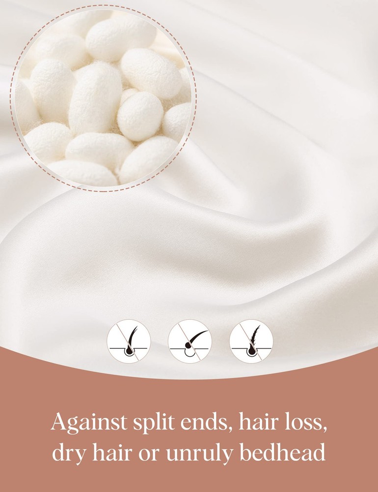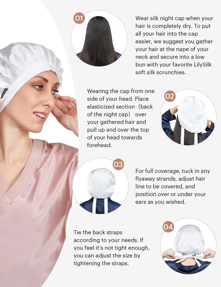 ✅100% PURE MULBERRY SILK NIGHTCAP: Both inside and outside of this Silk Sleep Cap is made of 6A Grade 100% pure mulberry silk. Silk has lowest frictional irritation to human's skin among all kinds of fibers, Providing Comfort and Aids in Hair Regrowth. BREATHABLE silk are widely acknowledged as 'human's secondary skin' and lauded as 'Queen of fibers'. It stays on all night and light as a feather. ✅SUIT FOR BOTH LONG & SHORT, THICK & THIN HAIR: Size: 22.4’’ - 24’’ (57-61cm). We make the size based on thousands of tests and one size would fit most people (durable adjustable elastic drawstring with silk ribbon through button hole on both sides of cap allows you to adjust the cap to your level of comfort). ✅PREVENTS HAIR LOSS & NO FRIZZY HAIR: Retains the moisture in your hair and doesn't dry them out, helps re-growth and not break while sleeping. Keeps your hairstyle fresh looking, and prevents loss of hair and wake up with no frizz/bed head just like silk pillowcases. ★We made the silky side on the outside to make the nightcap look better. The inside may not have the silky luster like the outside, but it is also pure silk. You can pull out some threads to have a test. ✅FLAT DESIGN ON FRONT, NO TRACE LEFT ON FOREHEAD: If you have curly hair and sleep with this cap, going to work without doing anything to your hair besides take the cap off; no more tight on head with adjustable bands; no red lines on forehead with flat design on forehead part; extremely light and easy to carry on travel; covered in this silk cap, your hair still can breathe! ✅PACKED IN BEAUTIFUL DECENT BAG PACKAGE: Beautiful Gift Bag Packed; A Sweet Gift for Wife, Mother, Girlfriend or Just Treat Yourself for coming Thanksgiving, Christmas and New Year! Silk Cap is Soft but Strong Enough to Stand up to Frequent Washing. Hand or Machine Wash in Cold Water on Gentle Cycle. Hang to Dry.
