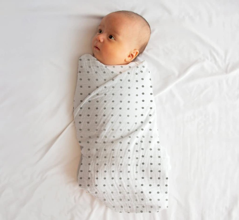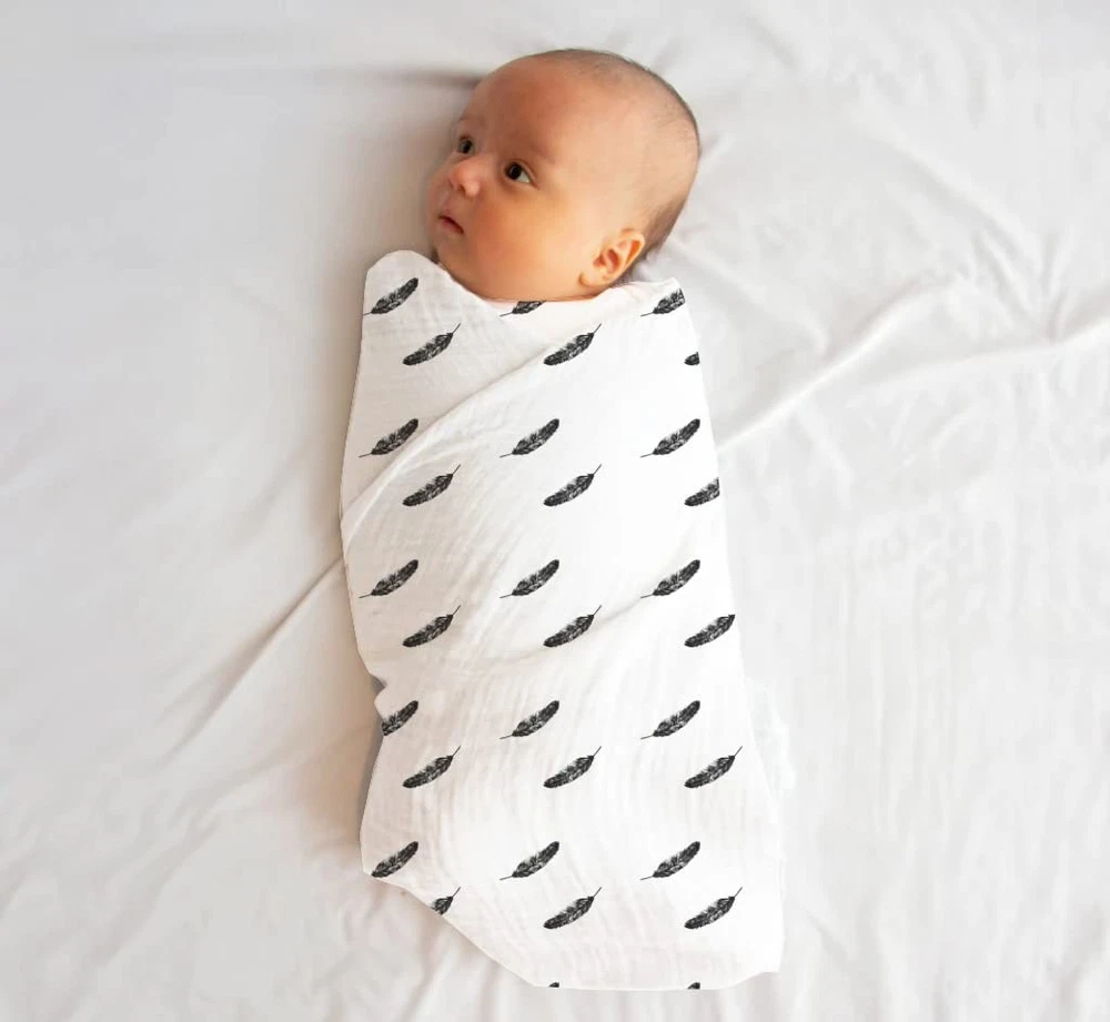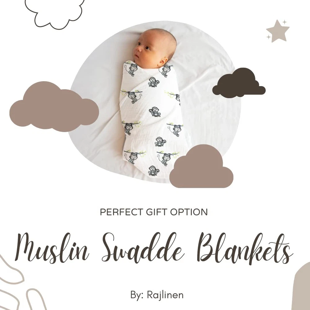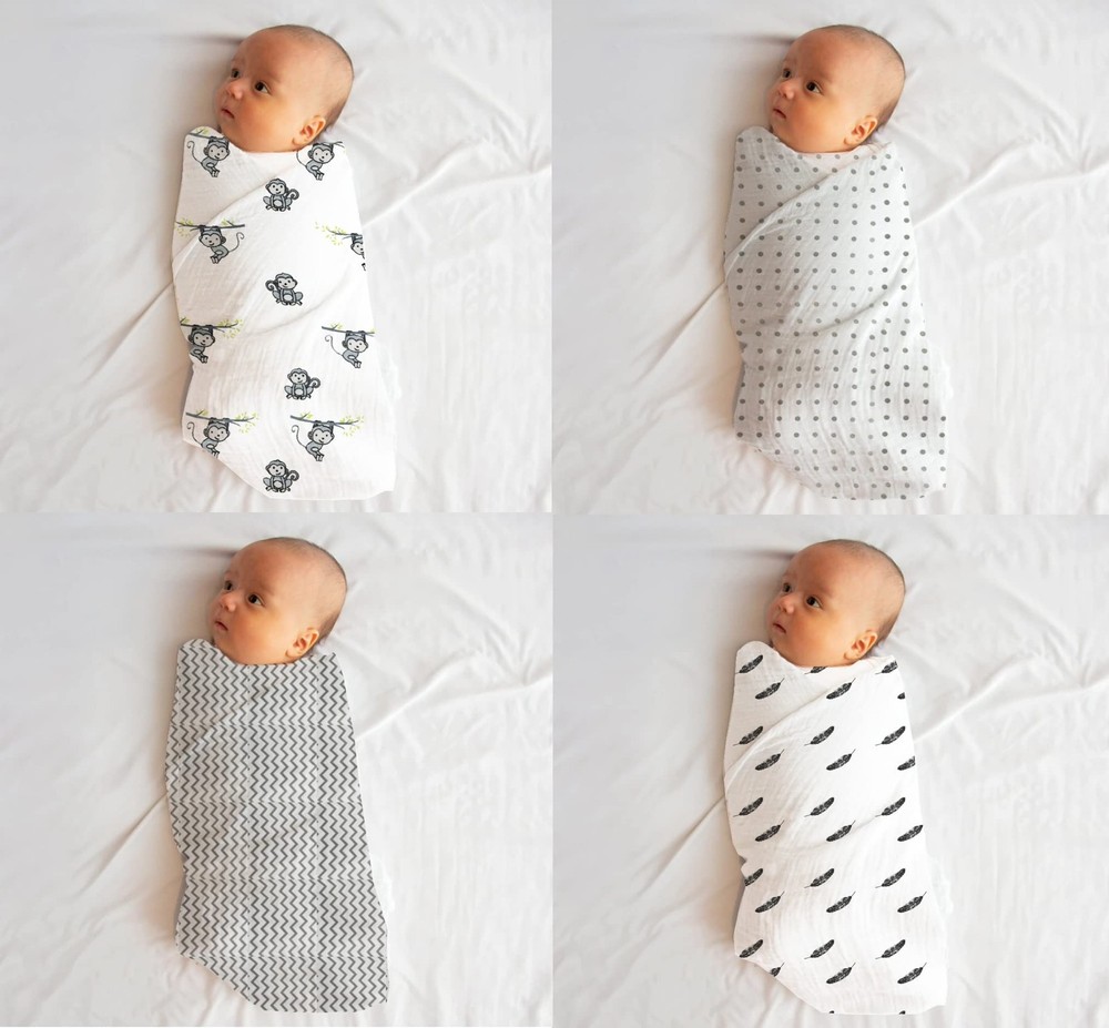 This beautiful baby swaddle blanket is the perfect addition to your baby's nursery or a great present for a new baby. This Unisex swaddle blanket is made out of super soft, silky 100% cotton muslin fabric. Generous size 47" X 47'' (120 x 120 cm). This amazing fabric gets softer with every wash. Perfect gift for mom, gift for new mom, baby shower gift, gift for mom and dad to be. MUSLIN SWADDLE BLANKTES INCLUDES - Pack of 4 Muslin Cotton Swaddle Blanket 47" X 47'' (120 x 120 cm). These are large enough to easily wrap or swaddle babies from new born infants to toddlers. Easy steps to swaddle, no late-night struggles. Our generously sized unisex swaddle blanket is designed to grow with your baby as they transition into their toddler years. SWADDLING MADE EASY - Swaddling your baby snugly and securely becomes easy with our swaddle wraps. Our large blankets provide you and your little bundle of joy with enough space for wrapping & swaddling without having to fear that she / he will outgrow the blanket too soon! You can also perfectly use our baby blankets as a receiving blanket, swaddle sack and stroller cover. UNIQUE, VERSATILE & STYLISH - Each design strives to be as different and unique as the little one it's wrapped around. Ideal for swaddling, sunshield, tummy time, privacy throw and more. Four individual unisex patterns that suit for both baby girls and baby boys. Each individual swaddle blanket is thin enough to provide ample breathability PERSONALIZED BEST SHOWER GIFT SET - Every new Mom-to be or Dad-to-be will fall in love with this considerate gift. Swaddling recreates the snugness of the womb so your baby is provided with a well-deserved good night’s sleep. Our muslin blankets are specifically designed to match your little ones needs. Keep your little one from overheating while at the same time providing her / him with a nice comfy blanket, perfect gift for mom. MULTI-USE : The muslin baby blanket can also be used as newborn swaddle, receiving baby blanket, cuddle blanket, nursing cover, sunscreen for strollers, burp cloth, car seat cover, play mat, changing pad, mini crib sheet and so on. Great baby shower gifts for new mom and newborns.