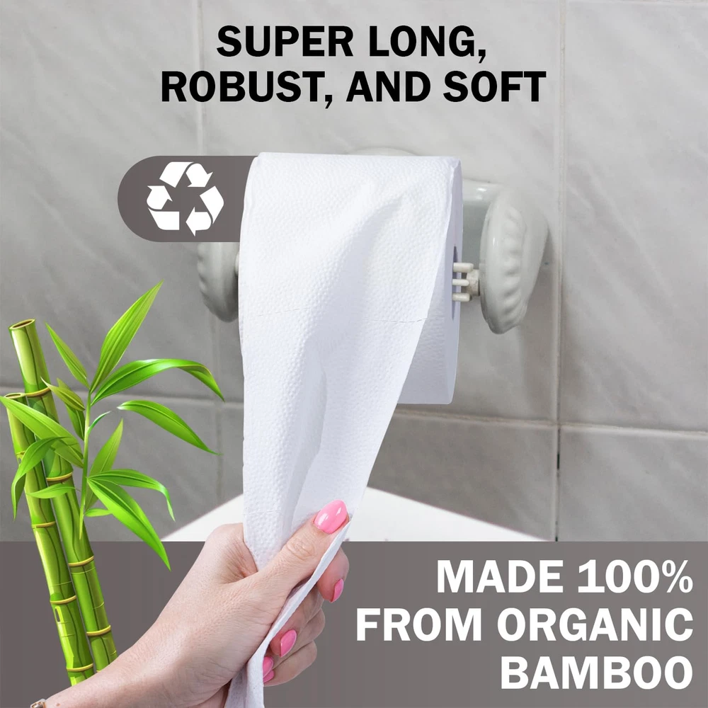 ULTRA-SOFT 3-PLY CUSHIONING COMFORT - Experience the luxury of ultra-soft, 3-ply bamboo toilet paper rolls that offer superior cushioning. Our toilet paper 3 ply is designed to provide maximum comfort and absorption, ensuring a gentle and effective clean every time. Say goodbye to harsh and flimsy toilet paper rolls and upgrade to a more comfortable bathroom experience. EXTRA-LONG ROLLS WITH 400 SHEETS - Each roll of bulk toilet paper rolls boasts an impressive 400 sheets, three times the length of an average roll. Enjoy fewer roll changes and more convenience with these extralong bathroom tissue toilet papers that keep you stocked up longer. Perfect for busy households, commercial use, or anyone who values convenience and quality! COMPACT 38MM CORE DESIGN - The innovative 38mm core design allows each roll of this septic safe toilet paper to have three times as many sheets as an average roll while maintaining a standard size. This ensures that it fit perfectly on most toilet paper holders, providing convenience without the bulk. Enjoy high-capacity toilet tissues rolls that save space and reduce the frequency of roll changes. 100% RENEWABLE & CHEMICAL-FREE BAMBOO - Our ultra soft toilet paper are made from sustainable, fast-growing bamboo, ensuring an ecofriendly and durable option. Free from harmful chemicals including inks, dyes, scents, and BPA, they are perfect for sensitive skin and allergies. Choose for a greener, safer, and gentler bath tissues toilet paper without compromising on quality. PREMIUM ABSORPTION, STRENGTH & COMFORT - These jumbo toilet paper rolls feature a premium fiber construction for exceptional absorption and strength, with an embossed texture that ensures a sturdy, reliable clean. Luxuriously soft and 3X thicker than leading brands, each chemical free toilet paper has three cushiony layers for ultimate comfort. Trust for a superior and comfortable bathroom experience. VALUE PACK & WORRY-FREE GUARANTEE: At such an excellent price, you'll get a pack of not just ONE but SIX Top-Quality Organic Bamboo Toilet Paper Rolls, each with an impressive 400 sheets. We have full confidence in the quality of 3 ply toilet paper. However, if they don't meet your expectations or if you have any questions or concerns, please feel free to reach out to us. We're here to help!!