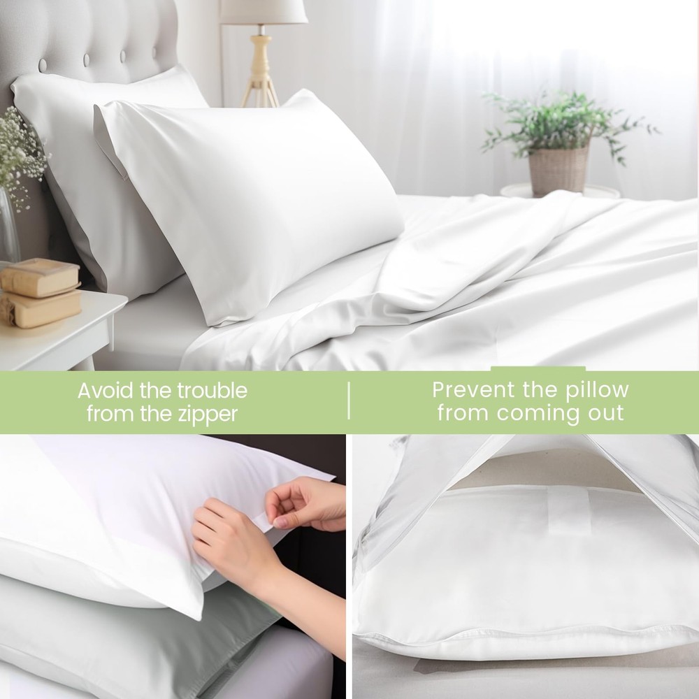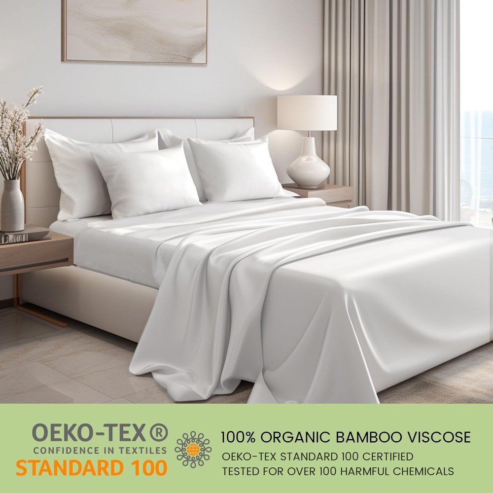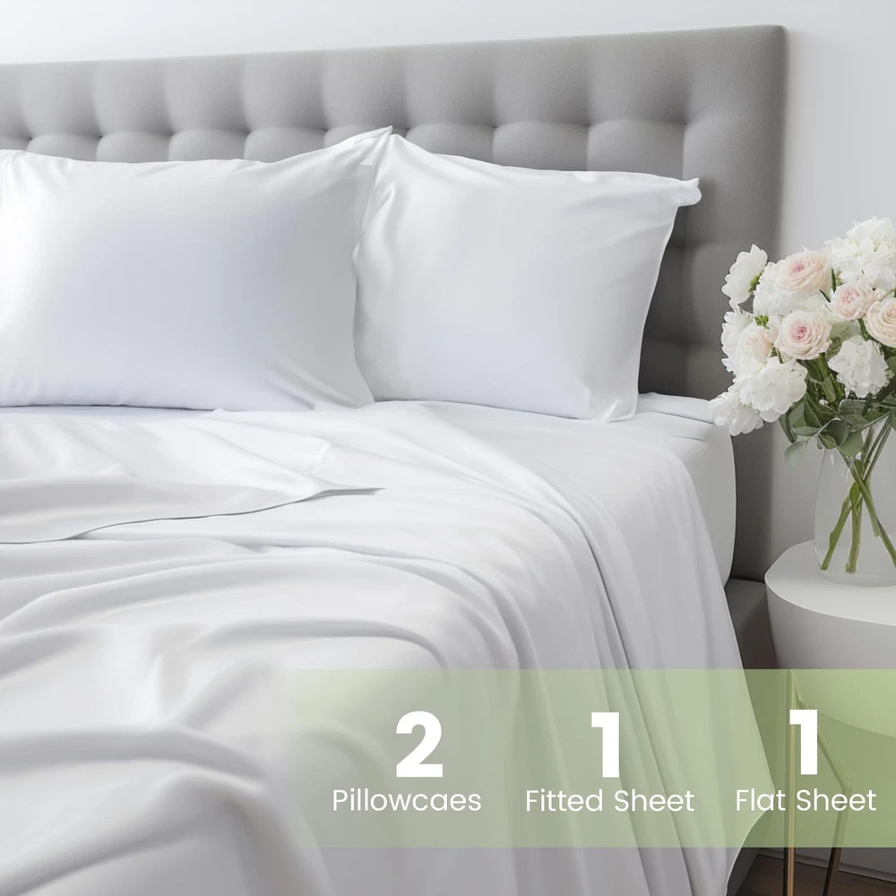 Experience the perfect combination of luxury and comfort with the Bamboo Sheet Set that will bring a whole new level of enjoyment to your sleep. Made of 100% natural bamboo viscose, this bamboo sheet set is not only soft and silky, but also breathable and moisture-absorbent, allowing hot sleepers to enjoy a dry sleep environment every night. In addition, the eco-friendly properties of bamboo fiber make it an ideal choice for sustainable development, helping you do your part for the planet. Exquisite craftsmanship and stylish design make this sheet set not only practical, but also a beautiful piece of home décor. Whether it's for yourself or as a gift for your friends and family, the Bamboo Fiber Sheet Set will be a smart choice. Choose it to make every night full of warmth and serenity and enjoy a cloud-like sleeping experience. [100% ORGANIC BAMBOO VISCOSE]: Bamboo viscose luxury bed sheets are crafted from the finest 100% organic bamboo viscose, OEKO-TEX Standard 100 certified, and tested for over 100 harmful substances and softer than Egyptian cotton sheets [COMPLETE 4-PIECE]: Includes 1 fitted sheet(60”x80”+16”pocket) 1 flat sheet(90”x102”) and 2 envelope-style pillowcases with overlapping closure(20”x30”+2”). Choose from five elegant and luxurious colors: sophisticated light gray, timeless white, opulent navy blue, sleek dark gray, or warm cream [LUXURY BEDDING]: The bamboo viscose bed sheet set is designed to fit nearly all mattresses with a depth that does not exceed 16", is machine washable, and is wrinkle-free. Superior moisture-wicking and thermoregulation properties to keep you cool in summer and warm in winter [BREATHABLE COMFORT]: Naturally thermo-regulating to keep you cool and relaxed while sleeping and providing all season comfort. Bamboo viscose bedding is made from 400 thread count sateen weave fabric for a softer, smoother and more silky feel [GENTLE WASH]: Machine washable on gentle cycle, tumble dry low, and do not iron. And this sheet set is finished with fine stitching to ensure a good level of comfort to last for years. To avoid wrinkles, put your sheets on your bed right after you pull them out from the dryer. If you have any questions during use, please contact us without hesitation
