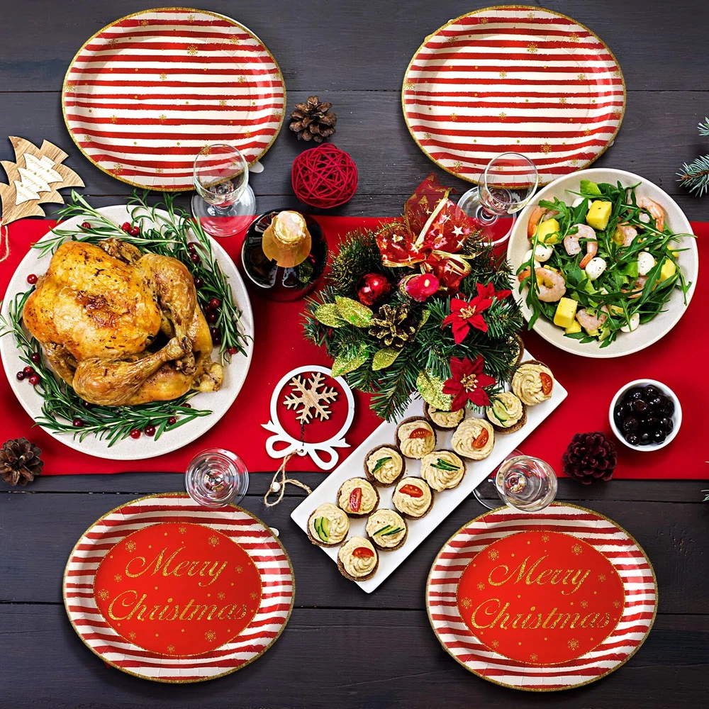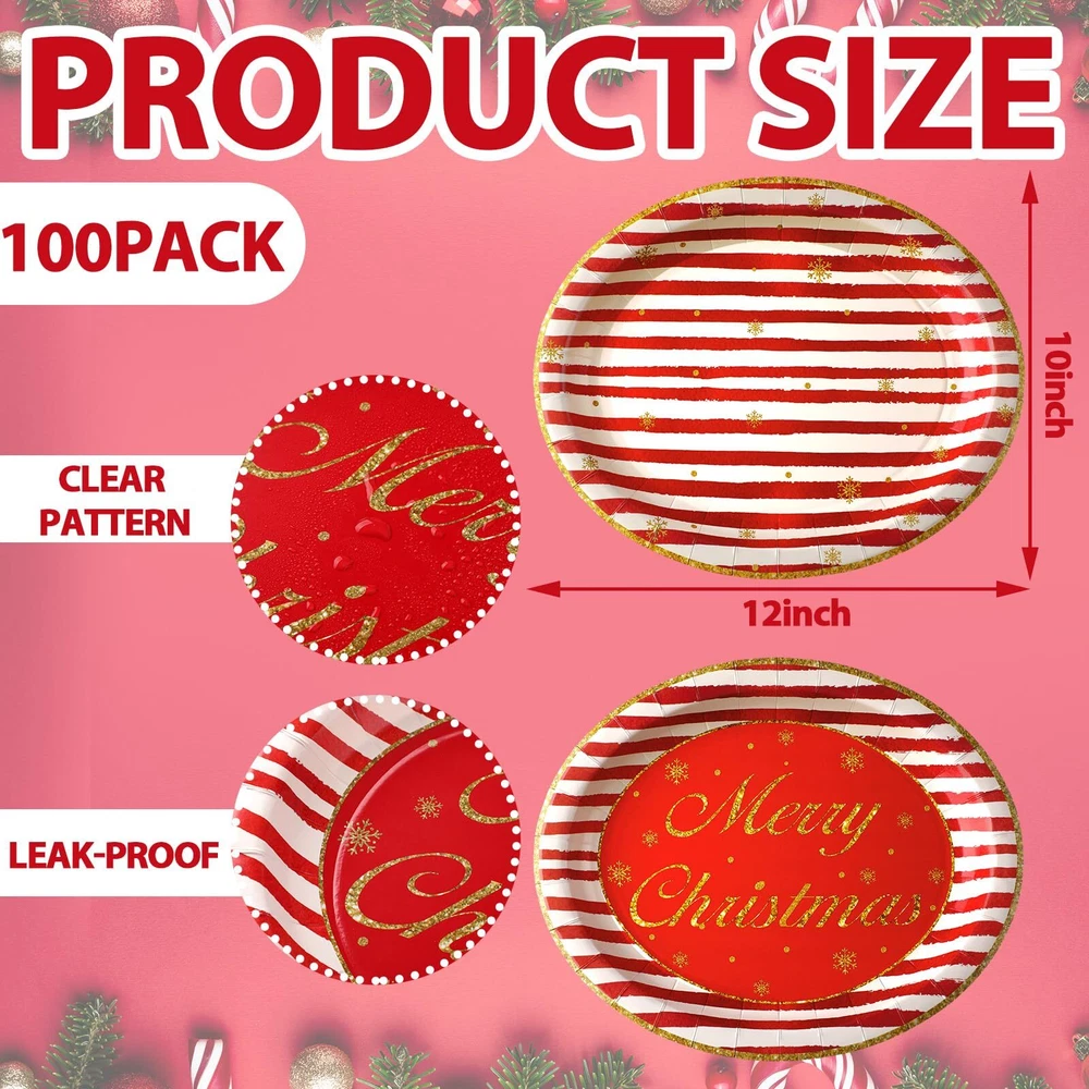 Beautifully Designed Christmas Patterns: the red and gold oval paper plates feature classic Christmas designs such as candy cane and striped patterns, these eye catching patterns instantly create a festive and inviting atmosphere for your Christmas celebration and add a touch of elegance to your table setting Abundant Quantity for Convenience: you will receive 100 paper plates, giving you plenty of plates to cater to your gathering, the large quantities ensure that all your guests can enjoy their meals without interruptions or clean up hassles Wide Range of Applications: the Christmas paper plates are suitable for various occasions, such as Christmas parties, picnics, birthdays, weddings, and more; The versatile designs and practicality of these plates allow you to indulge in their charm all year round, making every event special and memorable Reliable and Serviceable: crafted from 350g white cardboard, the plates are sturdy and reliable, and they are designed to withstand the weight of your favorite dishes without bending or breaking, ensuring a hassle free dining experience for you and your guests Proper Size: with a size of about 10 x 12 inches, the paper plates provide ample space for serving your delicious meals, you no longer have to worry about overcrowding your plates or spilling food over the edges; Serve your culinary creations with confidence and style