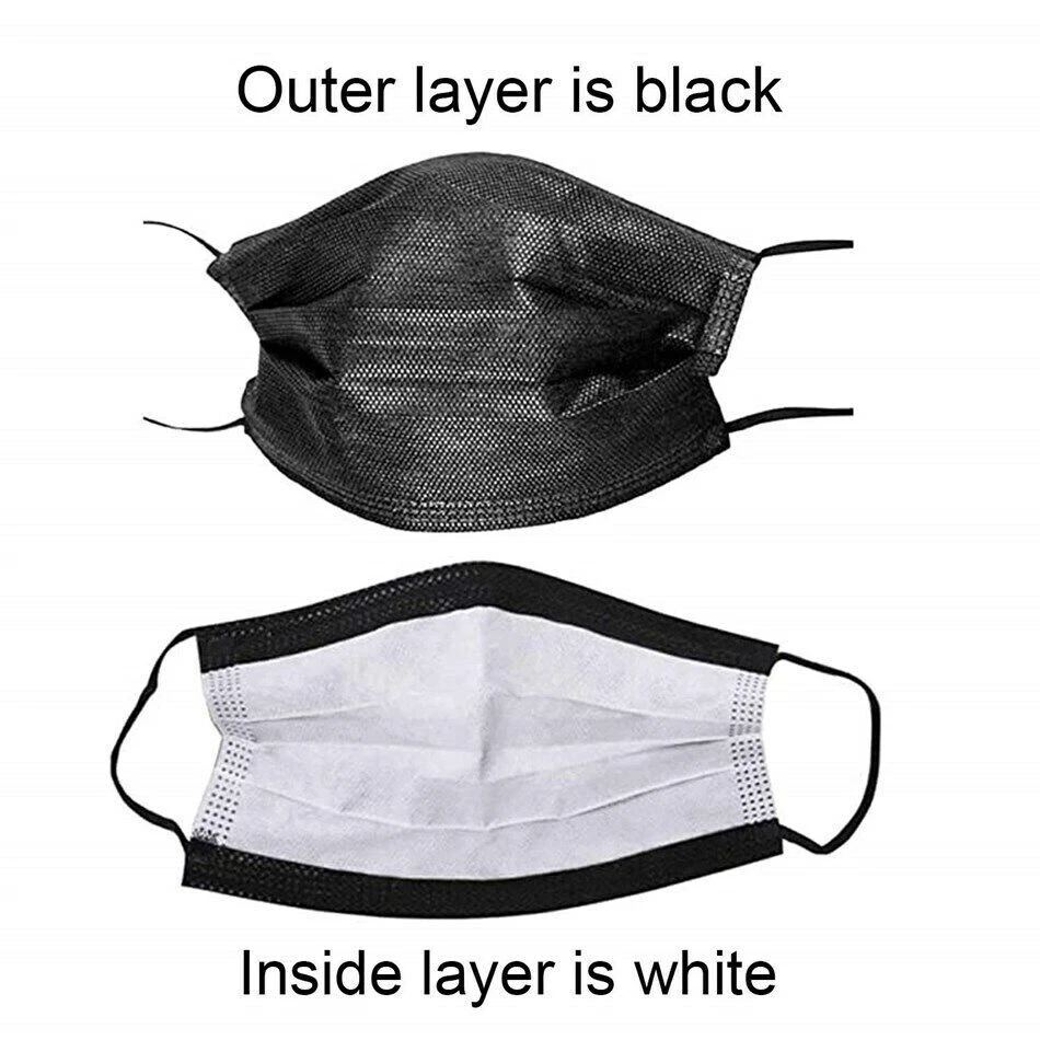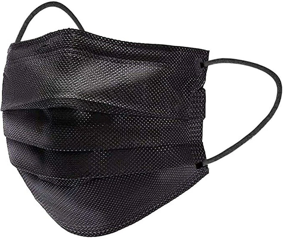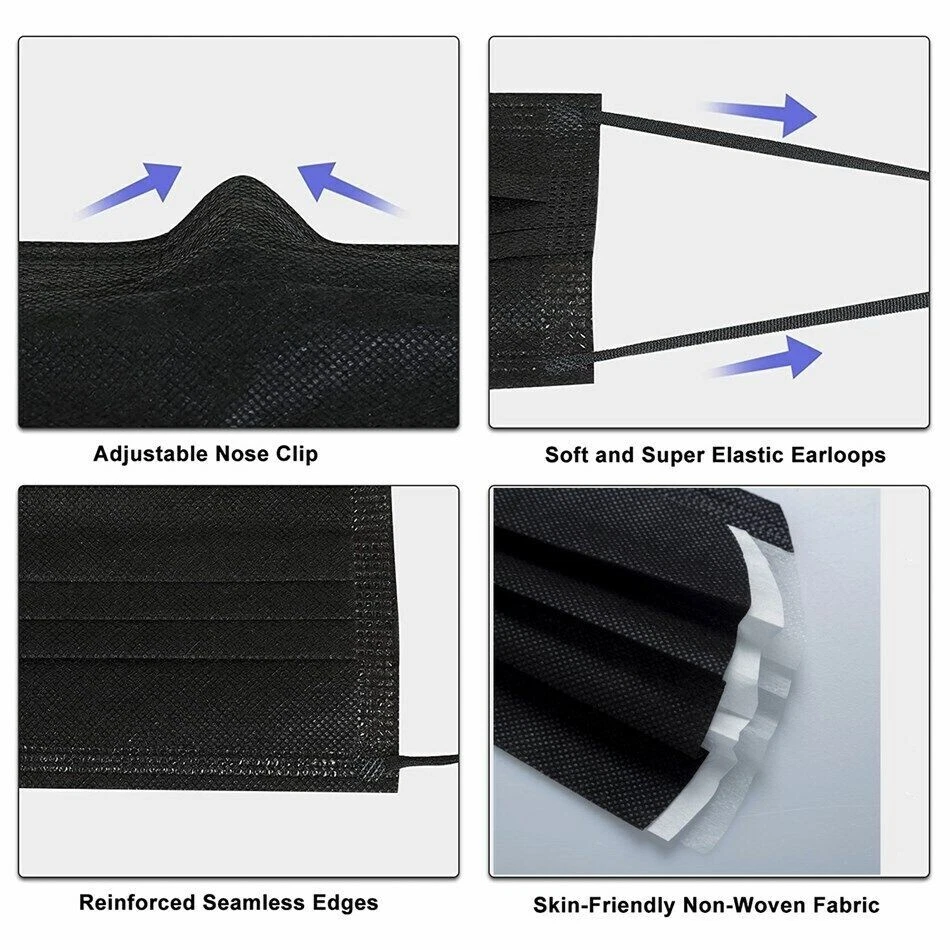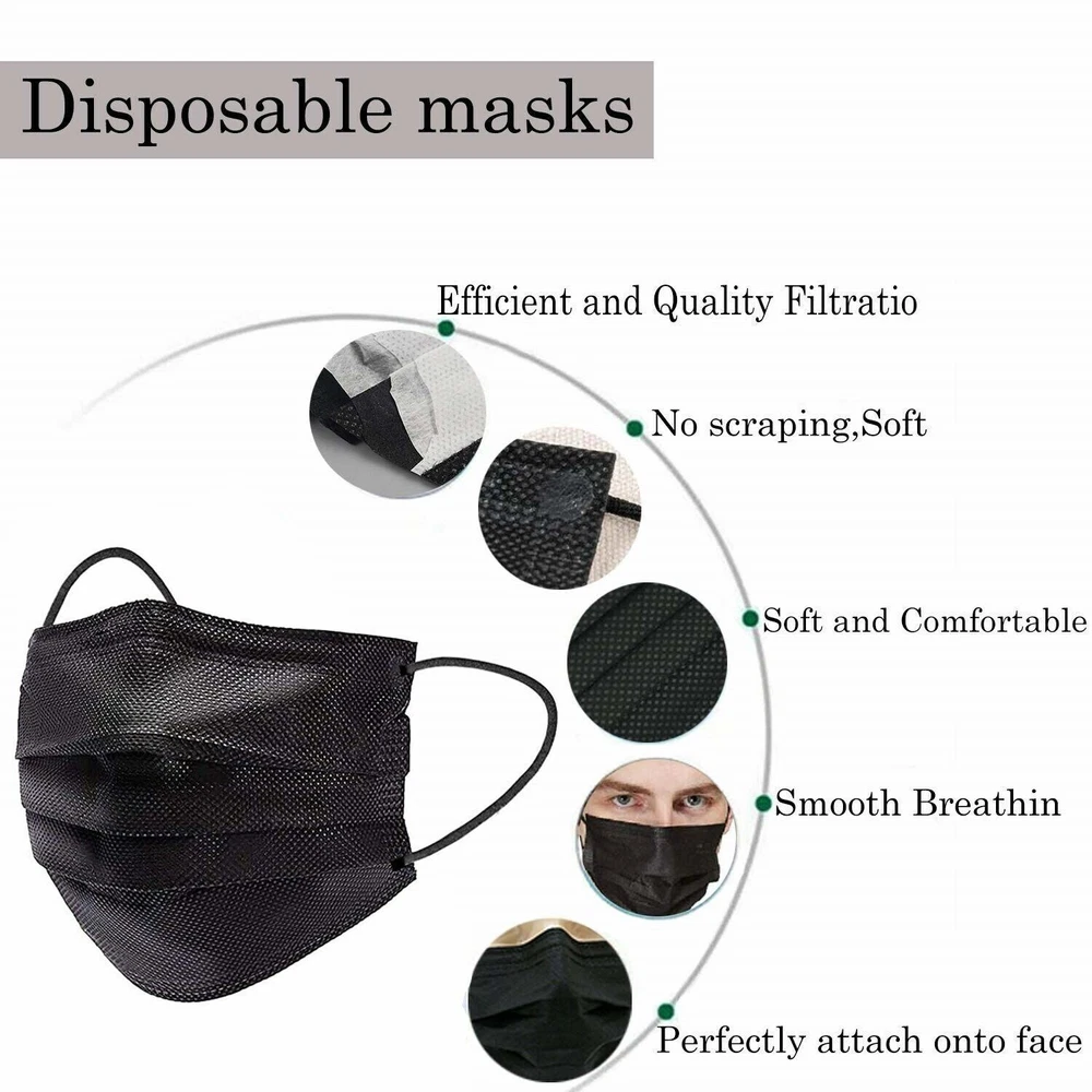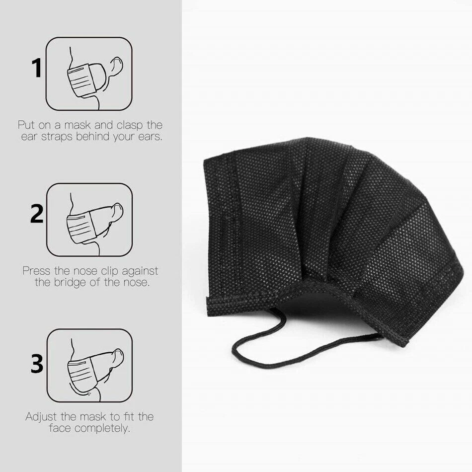 100 PCS Disposable Face Mask Non Medical Surgical 3 Ply Ear loop Black Masks Description Non Woven Imported FACE MASKS DISPOSABLE Our disposable face masks provide 3 layer protection. The face masks have a soft non-woven fabric in the inner side for comfort. The outside layer is made up of non-woven fabric and the middle layer has melt-blown fabric filter for better filtration of air. 3 PLY BREATHABLE PROTECTION Our facial mask fit all and are suitable for both adults and children. Stretchable, Soft Elastic Ear-loops and deformable nose clip of the masks make it easy and comfortable to wear as they fit every face shape and size. NOT FOR MEDICAL USE Face mask pack has 50 pcs 3 PLY face mask which would help protect your respiratory system against Dust and Pollution. FAST SHIPPING ACROSS USA Our Black face masks are made of breathable material and are allergy free.