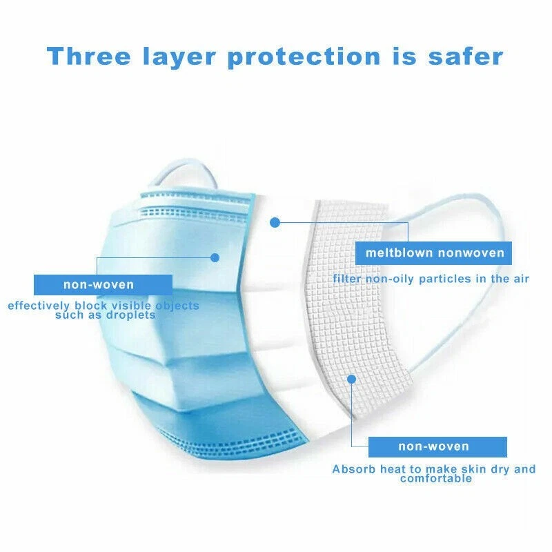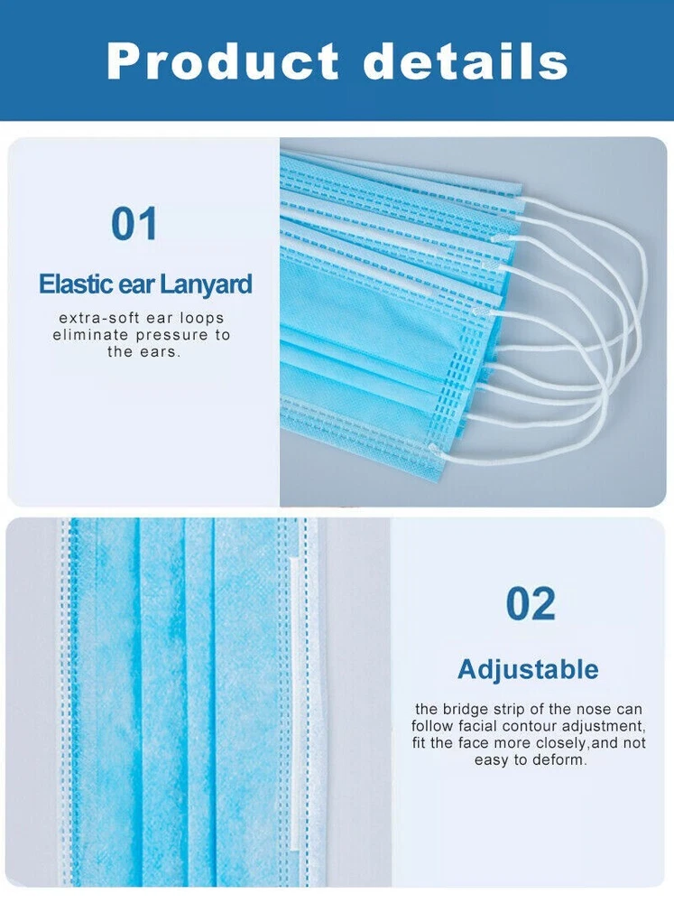Product Description What's Included? 100 - Disposable Face Mask Non Medical Surgical 3 Ply Ear loop Blue Masks Features: ⭐ SUPERIOR PROTECTION ⭐ HIGHLY EFFICIENT ⭐ UNBEATABLE COMFORT ⭐ BREATHABLE MOUTH MASK ⭐ DEPENDABLE QUALITY ⭐ Elastic Ear Loop ⭐ Nose Bridge Strip Inside Help Keep Mask Close to Skin ⭐ 3-Layers of Non-Woven Fiber Fabric to Provide Fine Filtration and Maximum Breathability ⭐ Adjustable Twig Bridge of Nose is more suitable for all face shapes. ⭐ High elastic flat ear strap, does not strain the ears. ⭐ Protect Anyone from Dust, Allergens, Virus, and Air Pollution ⭐ Comfortable to Wear for Hours and Maximize the Protection at the Same Time ⭐ One size fits all, for adult use. adjustable nose-bridge (metal strip). Item Specification: Size: 17.5 x 9.5cm/6.89 x 3.74"(Approx). Quantity: 100 pcs Material: Non-woven Comfortable and breathable; soft and skin-friendly, can be worn for long hours; easy to use Effective protection against germs, dust and air pollution FDA compliant Constructed from superior quality 3-ply polyester ⭐ Layer 1, the nonwovens colored layer is the first line of defense against germs and bacteria ⭐ Layer 2, the melt blown cloth minimizes particle dispersal for the ultimate layer of defense ⭐ Layer 3, the soft, non-abrasive inner layer makes it comfortable for skin contact SUPERIOR PROTECTION: Efficiently filter out dust and allergens with these masks. Our dust masks come in packs of 50, which is ideal for daily use. A convenient alternative to cotton face coverings. HIGHLY EFFICIENT: Our masks have 3 levels of protection. The outer layer filters out dust, odors and large particles, while the key melt-blown layer filters small particles. The inner skin-care layer is a natural and anti-allergen filter. UNBEATABLE COMFORT: This non-surgical face mask is designed with soft, non-woven material, making it comfortable to use every day. Plus, these face masks have elastic ear loops to easily fit all sizes. BREATHABLE MOUTH MASK: Designed to continuously filter out haze, pollen, dust, and particles while allowing you to breathe comfortably, our anti-dust face mask is perfect for long periods of time and any daily activities. DEPENDABLE QUALITY: These breathable face masks for germ protection are designed to keep you free of pollen, dust, haze, and more. Breathe easy every day with this pack of 50 protective face masks. Each face mask made with soft, non-woven blue material for long-lasting comfort. The elastic ear loops ensure that this dust mask will easily fit your whole family, making it perfect for daily use whether you’re cleaning your house or heading to the store. Our protective face mask has been designed with three layers of filtration to protect and guard your health. The outer protective layer will block dust, odors, and large particles. The key middle melt-blown layer effectively filters out small particles. The final, inner skin-care layer is a natural and anti-allergy filter. - - - Check out our other items! Shipping: All orders placed before 10:30 am EST Will Ship Same Day Tracking is provided on ALL Orders Returns : ALL returns are accepted if returned within 30 days. Money Back or exchange guaranteed. NO Restocking Fees. We constantly strive to find ways to improve our performance.