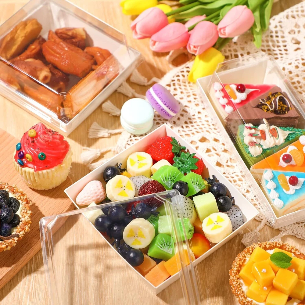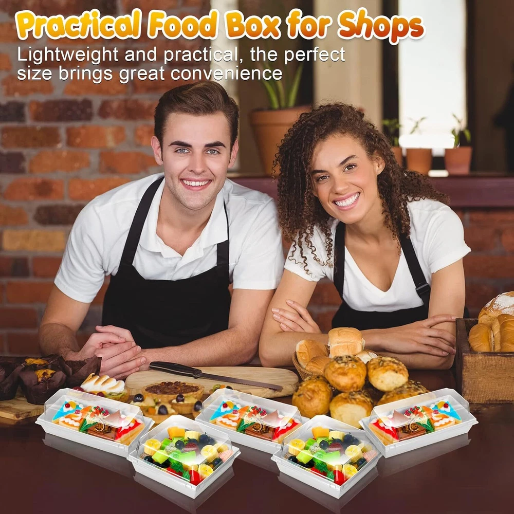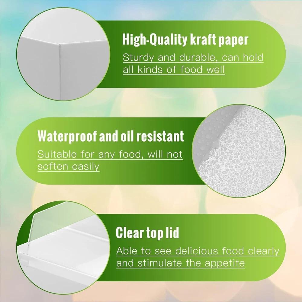 100 Pack 2 Size Paper Charcuterie Box with Clear Safety Lid 5'' White Product Details Brand: Yuxung Color: White Material: Paper, Plastic Material Feature: Non-Toxic, Disposable Product Dimensions: 16"L x 12"W x 6"H What You'll Get: the package includes 100 pieces of white paper food containers with lids in both rectangular and square styles, 50 pieces for each style, the size is shown in the picture, enough for your needs and replacement to display different foods Quality and Safe Materials: made of sturdy cardboard and plastic cover, the charcuterie box is waterproof and oilproof, tasteless and safe to use, can be directly contacted with food; Please note that this box is not high temperature resistant and cannot be heated in an oven Convenient to Carry and Display: the square sandwich transparent lid container fits closely with the slot on the edge of the lid, which has good sealing performance and prevents the food from spoiling; The transparent large window design allows you to clearly see the delicious food, which is convenient for packaging and carrying Grease Resistant Coating: each single use box has a polyester coating that prevents sauces or oils from soaking through, you can use it to hold a variety of different types of food, whether it's cream cakes or fried foods, and they stay intact save Multiple Uses: these paper food boxes are ready to use for desserts, roll cakes, baked goods, sandwiches, hot dogs, fruit salads, sushi and other foods, ideal for family meals, party gatherings, coffee shops, cake shops, and more