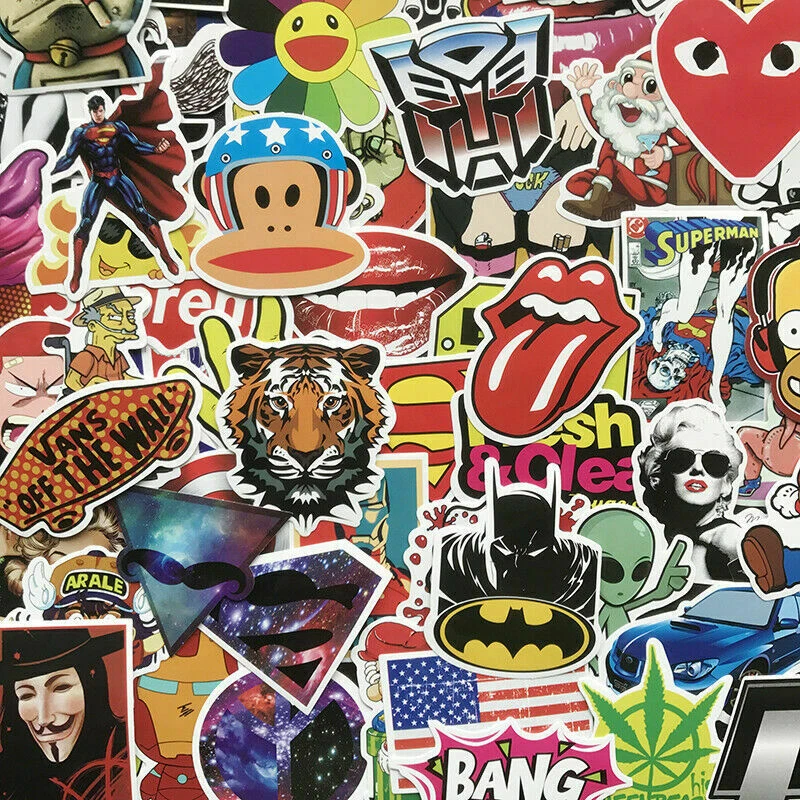 100% Brand New It can be used to decorate your car, laptop, Luggage, bike, Motorcycle, Skateboard, Room and everything you want to put it on. Features: *Our sticker is with very good quality. Made of high quality PVC *Size is 3cm-10cm *waterproof: but you can not throw them in in water:) *Sunproof :It will take very long time to use and will not fade quickly! Parents Pay Attention:The sticker may contain inapproriate contents for kids. May with some adult contents How to use: Just keep surface clean and smooth before you put stickers on. Just peel the back off, without adding any glue, you can directly paste the stickers.It is not easy to remove but you can remove it without any scratch or glue left. Package include: 100 pcs sticker non repeated!