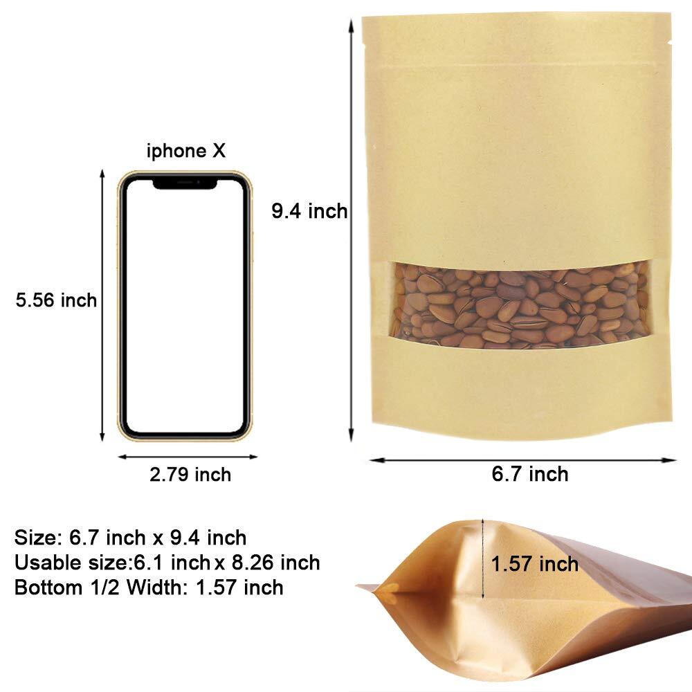Stand Up Kraft Paper Food Bags for Packaging Products Specification Material: food-grade kraft paper and plastic External Dimension: inch 6.7X 9.4 inch Package Include: 100 x paper packaging bags Why Choose Us? -Safe Quality. -Kinds of size for your choice. -Reusable clear bags for packaging. -Moisture-Proof, easily sealed, resealable. -Snack bags, cookie packaging bags, candy bags, coffee and bean storage bags, mini ziplock bags and more. Notes: 1.Please choose your right size according to the usable size. 2.We suggest opening the bottom of the bags first, then put the products in, it's better for standing up. 3.Please allow slight size errors due to manual measurement. 【Quantity & Size】You'll get 100pcs 6.7" x 9.4" kraft paper bags with window, however, the usable size is 6.1" x 8.26", suitable as sample bags, the small paper bags can store few food. There are kinds of size paper bags for your choice, please choose the appropriate size according to the purpose. 【Packaging Bags Design】With a single-sided transparent window easy to distinguish the packaging products. Zipper closure design, resealable bags for packaging, and the zip top can be sealed by sealing machine with good tightness. U-shaped notch design, easy to open the bag. And the bottom of the bag can stand up, you can open the bottom before packing. 【Safe Quality】The reusable food pouches are made of food-grade kraft paper and plastic, the inner lining are with safe wax coating, odorless, reusable and moisture proof. The bottom is thickened to increase the load-bearing capacity of the packaging. 【Applications】Depending on the different size, suitable for packaging various products, like bath salt, nuts, oats, cookies, candy, tea, coffee beans, grains, and kitchen ingredients. You can also attach your own brand label on the surface as a retail or sample display package. Perfect for home and store. 【After Service Guarantee】We have checked the zip lock storage bags strictly to guarantee the quality, if any question of workmanship under normal conditions, please feel free to contact us, we'll refund you or replace a new one for you.