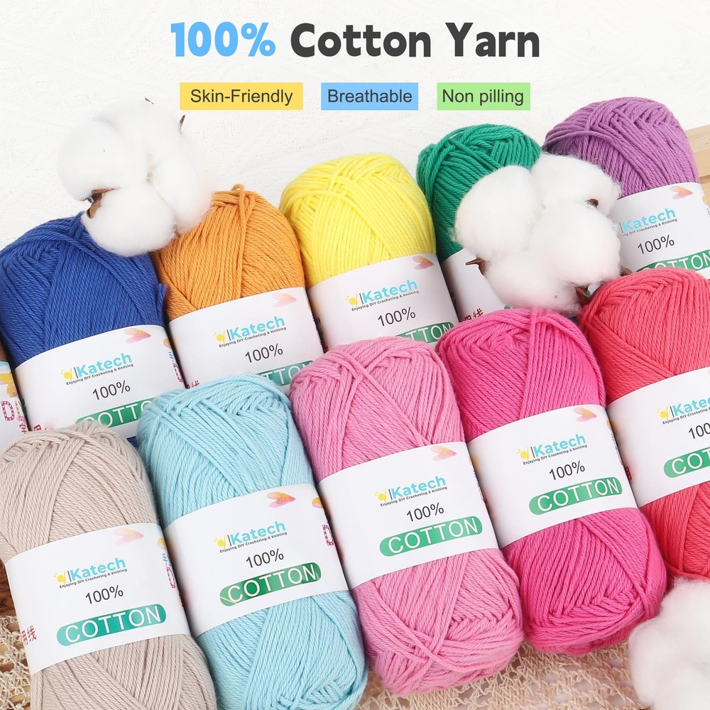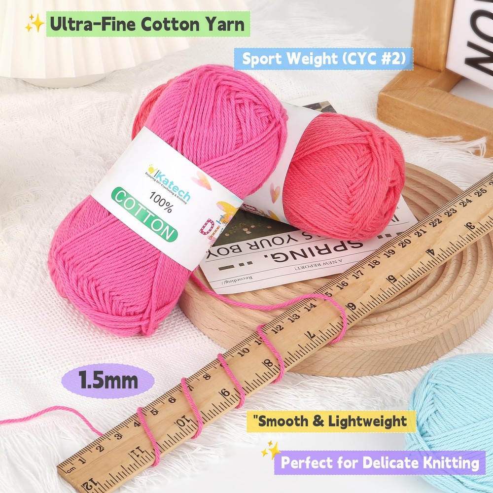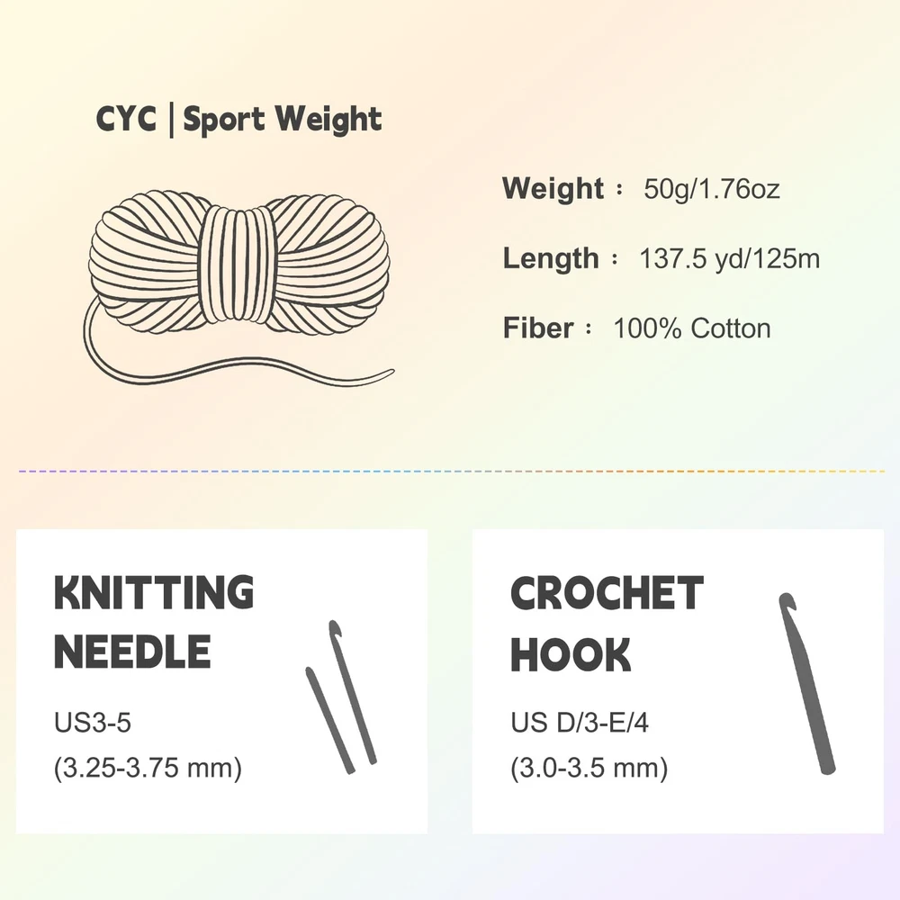 Specifications: Material: 1OO% Cotton Size in Weight & Length: Approx. 1.76oz/50g per skein, 137.5yd/125m per skein Gauge: Sport Weight (CYC #2) Suggested Use Scenes: Dishcloths, Coasters, Potholders, Scarves, Babycloths, Gifts, Home Decorations Package Includes: 12 x Cotton Yarn Skeins Notes: The color may exist a slight difference due to different screen displays Winding risk may exist, please keep our sport weight cotton yarn away from children Test a swatch for gauge accuracy before starting your yarn for crochet projects This is a thinner Sport Weight cotton yarn due to its pure fiber content and tight twist, and may appear finer than acrylic or wool blends. Please swatch before use to confirm gauge and drape 1.Premium Pure Cotton Material: Crafted from high - quality pure cotton, our baby cotton yarn offers a soft, skin - friendly touch. Ideal for making kitchen essentials like dishcloths, potholders, as well as cozy blankets, cute baby hats, and delicate scarves. Perfect for knitters and crocheters with experience, ensuring smooth stitching without snagging 2.12 - Color Versatility for Endless Projects: Includes 12 packs (50g/1.76oz each, 137.5yd/125m per skein) of 1OO% cotton yarn. With 12 carefully selected colors, this soft yarn set unlocks boundless creativity, like dishcloths and pot holders, you can bring any knitting or crocheting idea to life. Mix and match colors to suit different seasons, moods, or gifting occasions, catering to the diverse project needs of crafters 3.Durable and Easy to Maintain: The pure cotton yarn is not only soft but also durable. Items made with it can withstand regular use and washing, maintaining their shape and color. This durability ensures that your handmade creations, whether they're kitchen essentials or wearable accessories, will last long, providing good value for money and a satisfying crafting experience 4.Perfect for Gifting and Self - Use: Aligning with the user behavior of gifting handmade items, this 1OO% cotton yarn set is a great choice. You can craft personalized presents like knitted scarves for friends, crocheted baby hats for family, or decorative pieces for special occasions 5.Soft & Safe Cotton Yarn: Made from natural cotton, this sport weight yarn(CYC #2) is breathable, gentle. Safe for skin, it’s a trusted choice for baby projects. Due to its pure cotton composition and tight twist, the actual yarn may appear slightly finer than synthetic blends