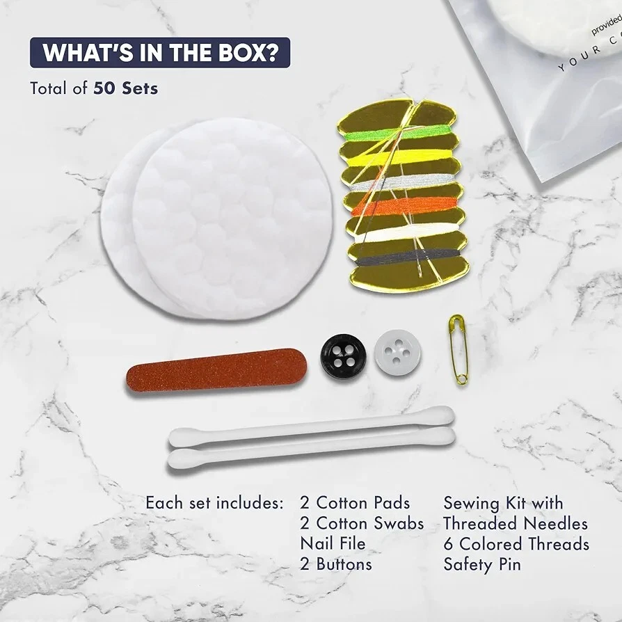 100 Personal Care Travel Packs-Cotton Rnds, Q-Tips, Nail File, Sewing Kit. Great for travel or as an offering in AirBnB rentals. Individually wrapped to maintain hygiene.