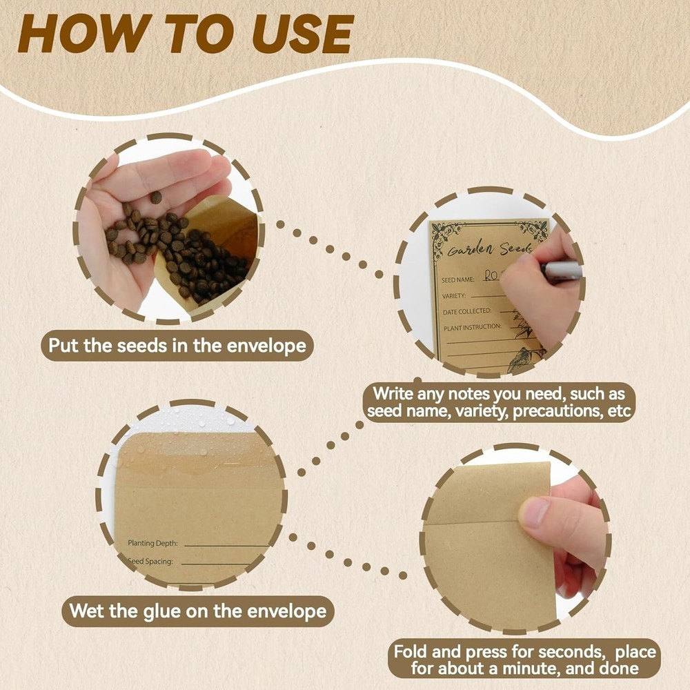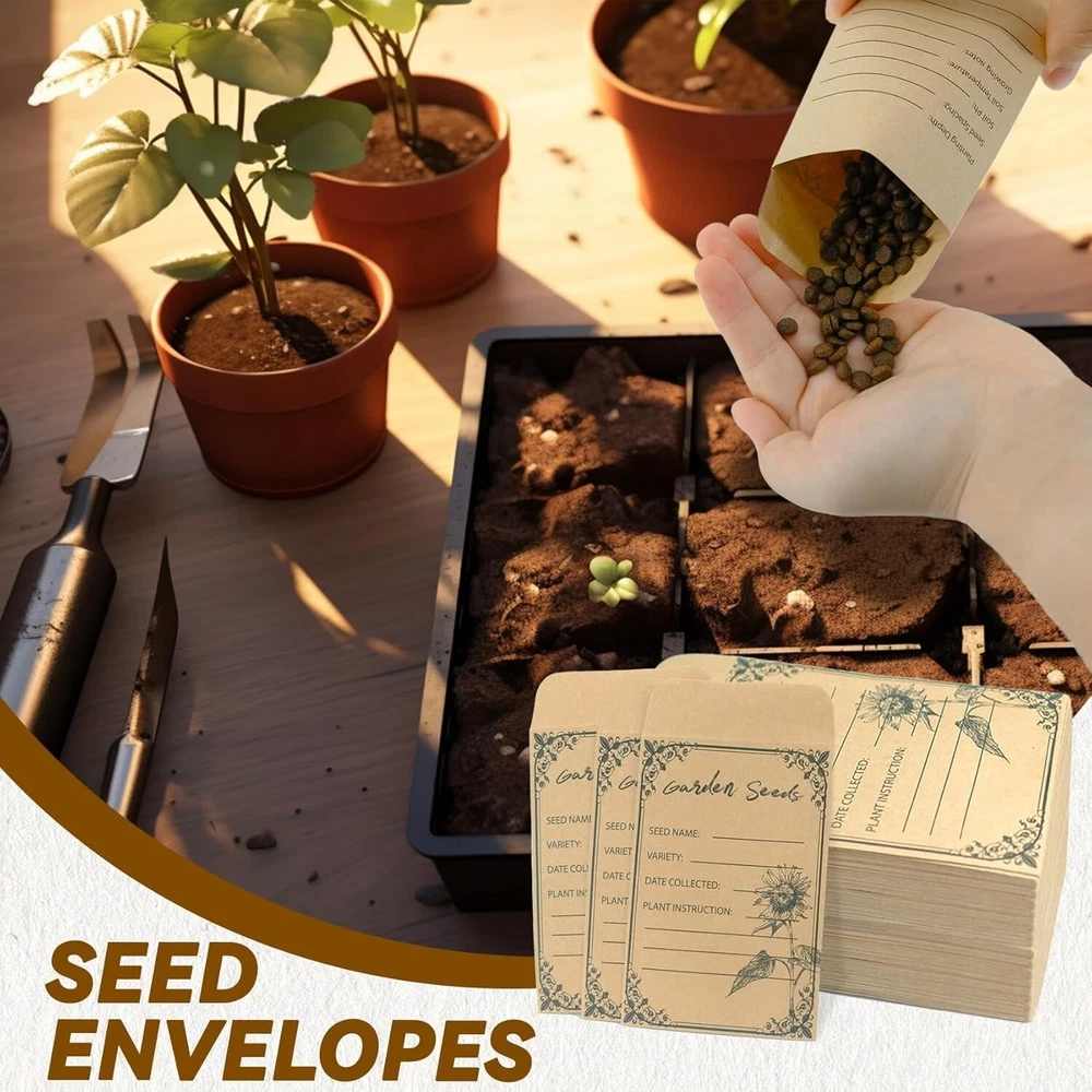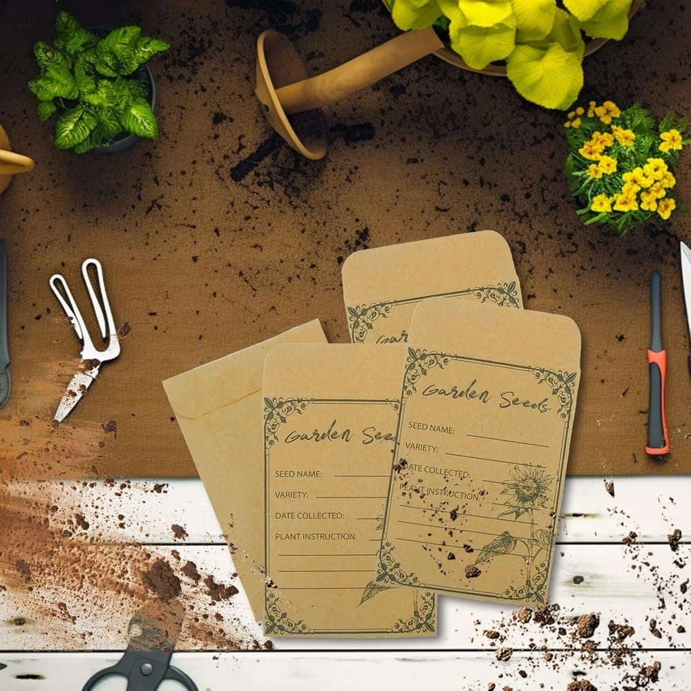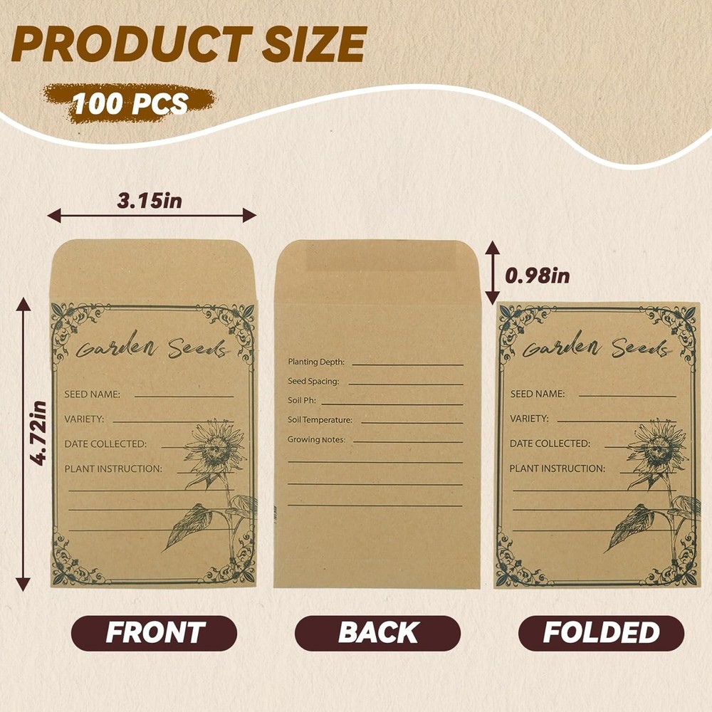 100 Pieces Seed Envelopes Seed Packets Envelopes Self Adhesive Sealing Seed New Color: Brown Closure Type: Self-Seal Material: Cardboard Number of Items: 100 Adequate for Your Requirements These kraft envelopes with dimensions of 4.72x3.15 inches, are perfect for storing various small items such as seeds, coins, bills, cash, and checks. Each package contains 100 seed storage envelopes, providing plenty to meet your requirements with extras in reserve. You can even share them with your friends or family The coin envelopes are water gel-sealed, requiring no complex installation tools. After placing seeds, small electronic components, or other items inside the paper envelopes, simply write information like names and dates on the pre-printed label. Wet the adhesive on the envelopes with water, fold, press for a few seconds, and let it sit for 1-3 minutes to seal securely. This is a simple and secure seed saver envelope to protect your items Convenient Pre-Printed Design These seed bags feature thoughtful preprinted designs. on the front, including "Seed Name," "Variety," "Date Collected," and "Plant Instruction" for easy seed information recording. The back also features preprinted text designs, such as "Planting Depth" and "Soil pH Value," to help you easily document your plant's growth journey. These kraft paper envelopes make it a breeze to identify your flower and vegetable seeds for future use Premium Quality Material Crafted from high-grade kraft paper, our money envelopes assure reliability, safety, sturdiness, and a smooth texture. Resistant to breaking or tearing, they offer dependable storage for your seeds. Keeping your seeds dry and organized, these envelopes provide excellent storage space for all your gardening needs, ensuring prolonged usability Beyond their practicality, these mini envelopes serve a myriad of purposes. Ideal for storing and collecting seeds, they find applications in diverse settings such as weddings, birthday celebrations, and even in the classroom to introduce children to the joy of planting. With their wide range of uses, these small seed envelopes are not only an excellent choice for seed preservation but also an ideal option for storing various small items in our daily lives Return Policy: We offer a 30 day return policy from the receiving date. Please contact us for a Free Return Label. Please use our return label so it will go back to our supplier and we can do a refund or replacement afterwards. Feedback: Your satisfaction is very important to us! If you have any problem with your order, please contact us and we will do our very best to make you satisfied. As long as you are happy with your purchase, please leave a positive feedback for us. We will always leave you a positive feedback in return. If you have any problem with your purchase, please do not leave a negative feedback. Please Contact us ... and your issue will be solved quickly and positively We are a small family-owned business trying to make a living, not a huge company that does not care ... We will ALWAYS do our best for you!