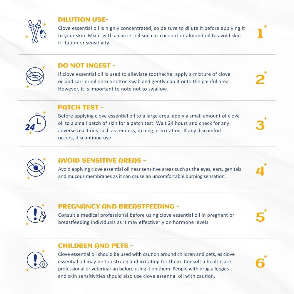 Product Description - TechStore Available at Yawaoutlets HIQILI 1 Fl Oz Clove Oil for Teeth and Gums, Oral Care, DIY Clean Spray, Aromatherapy, 100% Pure Natural Premium - -30ml Ingredients & Aroma: Sourced from Indonesia and extracted using the traditional steam distillation method, our 100% pure Clove Essential Oil has a cool, sweet aroma with a slightly herbaceous, captivating aroma Oral Care: Clove essential oil is a multi-purpose natural healing oil that can not only relieve gums pain, soothe toothache, but also refresh breath, improve oral hygiene, and keep strong and healthy teeth, find relief for sensitive gums Tooth Aches: Dilute clove essential oil in sweet almond oil at 1 drop of clove oil per milliliter of carrier oil. Dip a cotton swab and gently apply it to the affected area. Or Mix with 1-2 drops of clove essential oil to 60ml of warm water, vigorously swish between teeth for 30 seconds then spit out. Do not swallow Multiple Use Scenarios: Add 1-2 drops of clove essential oil when washing clothes in the washing machine to eliminate odors, commonly used in, diffuser, home cleaning, kitchen, shower, bathtub, toilet, sauna, humidifier, spa, aromatherapy, outdoor space, car, air freshening, office, bedroom, yoga DIY: Add clove essential oil to conditioners, tooth pastes, shampoos, massage oils, diffusers, cleaners, sprays, laundry detergents, cleaners, body lotions, creams, bath salts. Also DIY candles, perfumes, soaps, bath bombs Safer: The clove oil we produce is distilled from the aromatic leaves of wild evergreen trees in Indonesia and tested for purity and composition by GC/MS, MSDS, COA, IFRA, and more Multiple Blends: Clove essential oil can be blended with Lavender essential oil for better skin soothing. Blended with Sweet Orange essential oil, the freshness of sweet orange is balanced by the warmth of clove for air purification and to enhance the ambiance of the home. It can also be blended with rosemary, eucalyptus, cinnamon, sage, clove, geranium, myrrh and nutmeg About this item Brand HIQILI Scent Clove Special Feature Undiluted, Oil Soluble, Therapeutic Grade, Long-lasting smell Product Benefits Skin Care, Hair Care, Soothing Teeth and Gums, Aromatherapy, Oral Care Seasons All Seasons $16.00 Buy Now