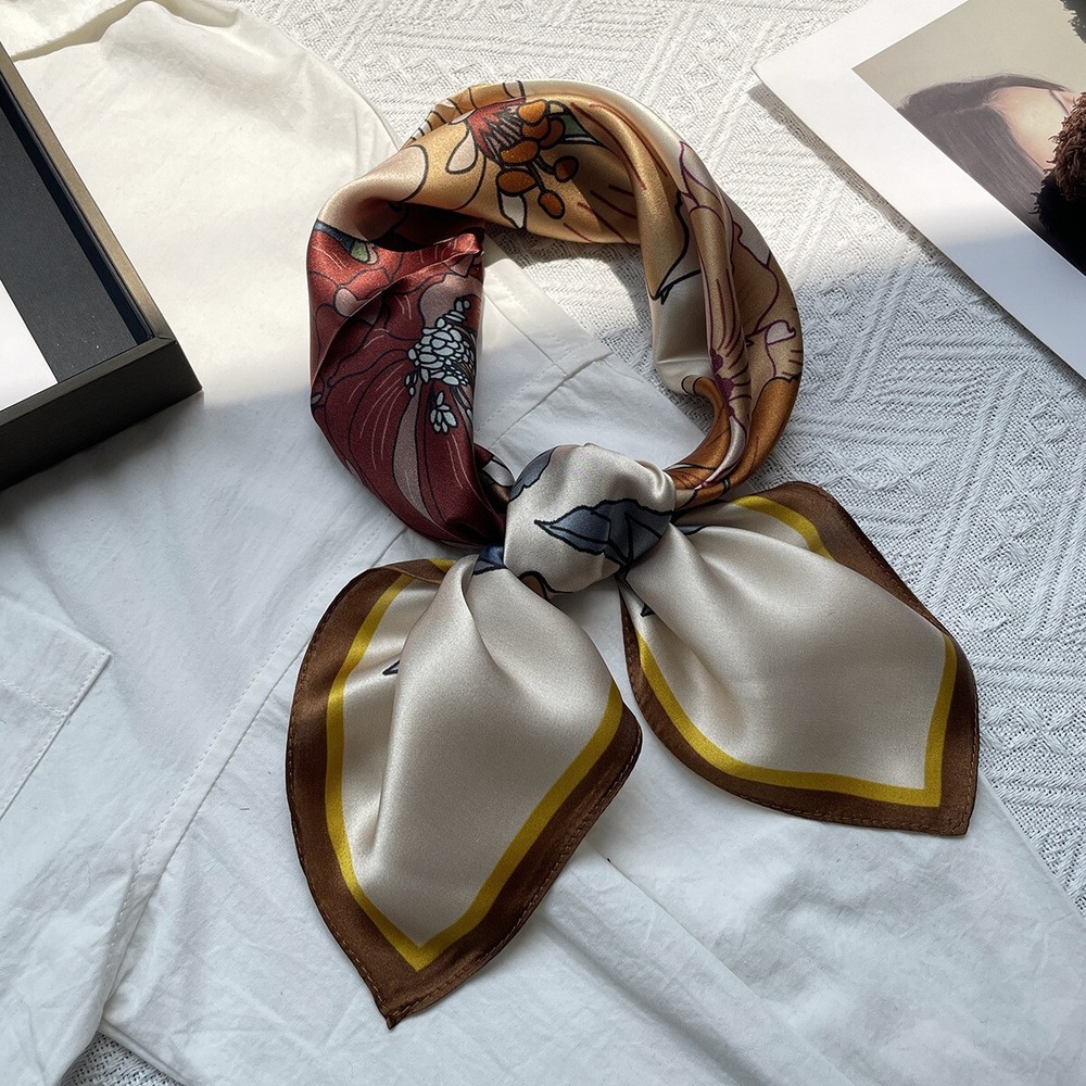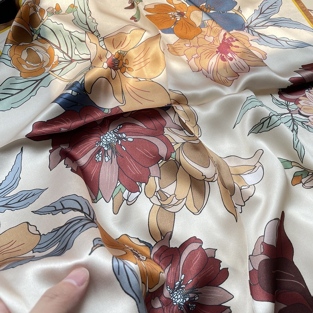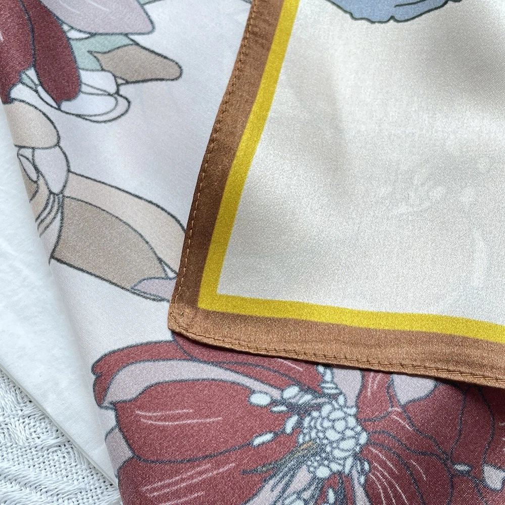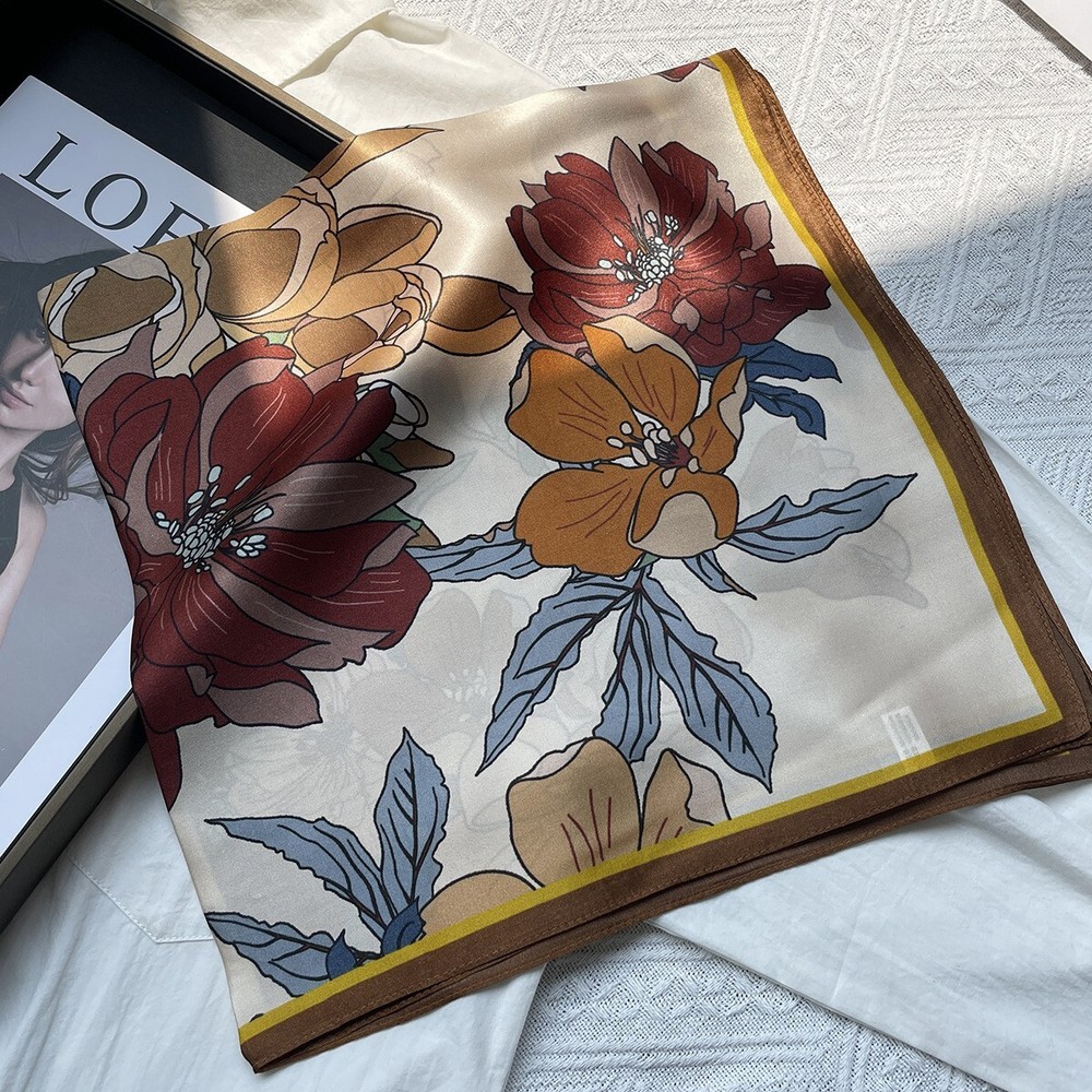 Fabric Type: Satin Item Length: 68cm Style: Square Scarf Pattern: Floral Country of Origin: China Color: Beige Features: Multifunctional, Neck Warmer UPC: Does Not Apply Item Width: 68cm Department: Women Theme: Art, Flower Vintage: Yes Type: Scarf gtin13: Does Not Apply Brand: Unbranded Material: Silk Season: Fall, Spring, Summer, Winter