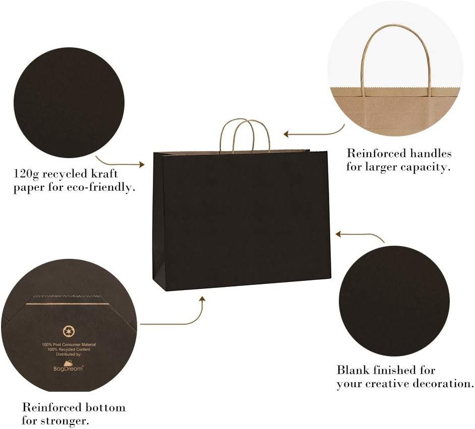 Type: Bags Product Dimensions: 16 X 6 X 12 Inches Material: Paper, Recycled Paper, Kraft Paper gtin13: Does not apply Theme: 16x6x12 Paper Bags Black Brand: Unbranded Style: Solid Recipient: Multipurpose Personalize: Yes Item Weight: 12.32 Pounds Total Eaches: 100 Occasion: All Occasions Size: Large Number Of Items: 100 UPC: Does not apply Color: Black Unit Count: 100.0 Count Pattern: Solid Antique: No