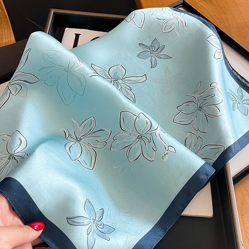 100% Pure Silk 21'' Scarf Women Beige Gray Flower Kerchief Small Square Bandana