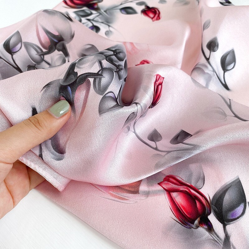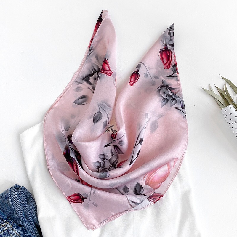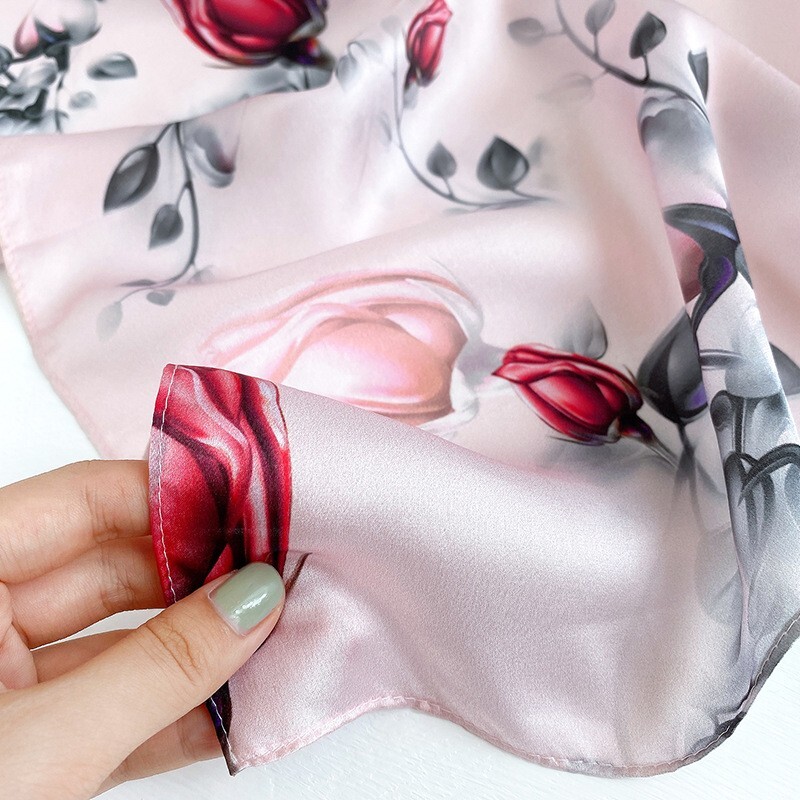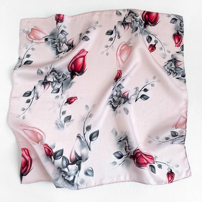 100% Silk Vintage Floral Scarf for Women Blue Red Square Wrap 53x53cm