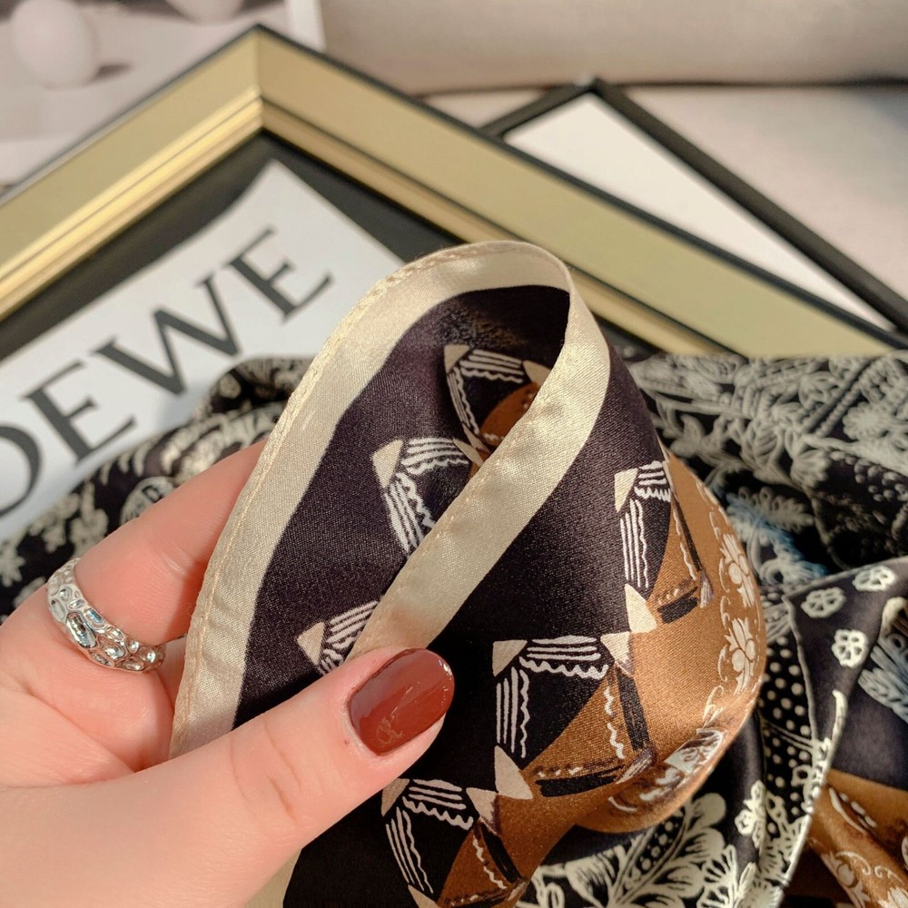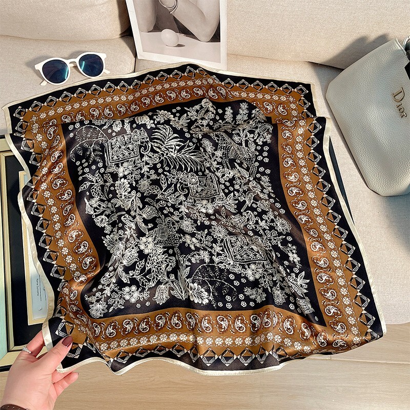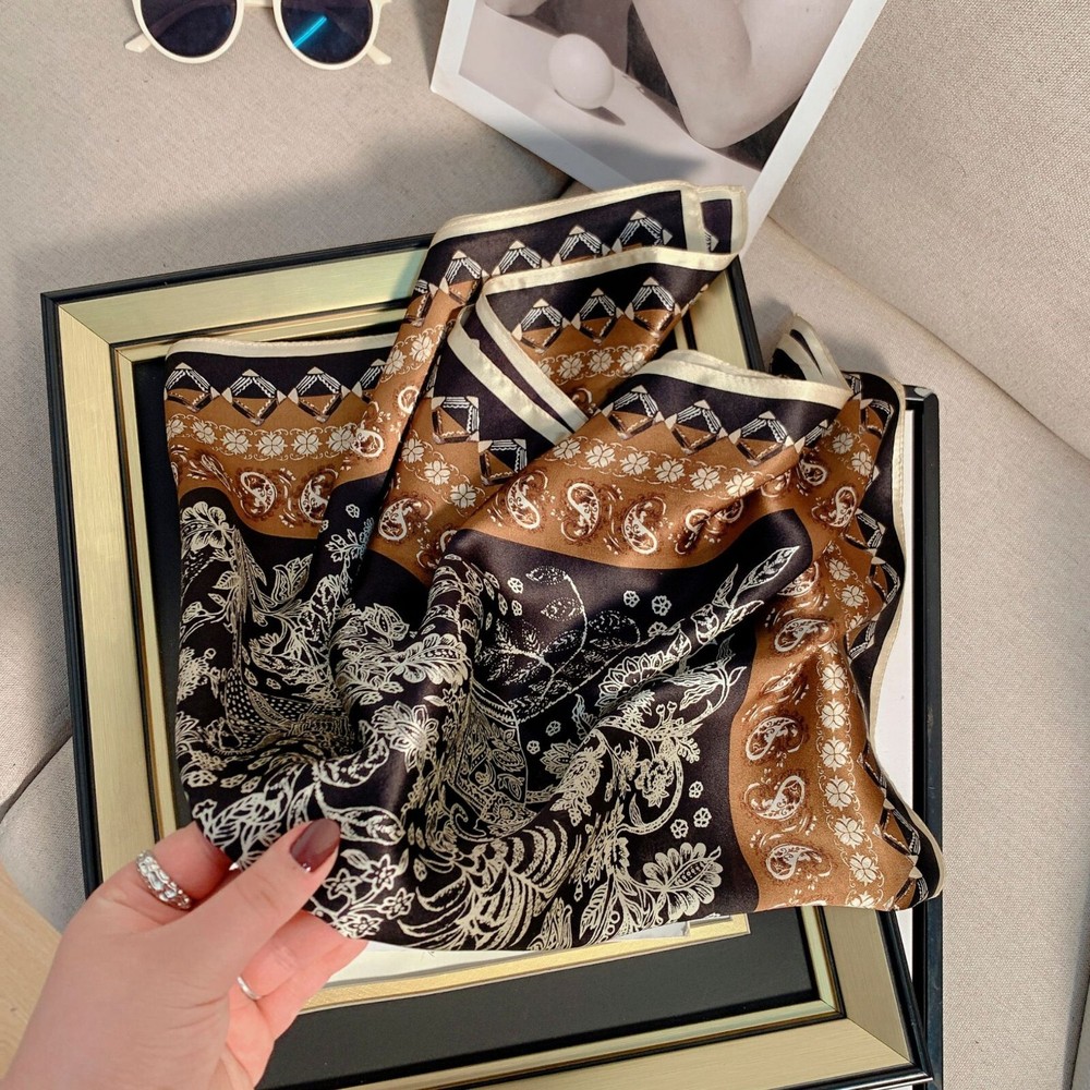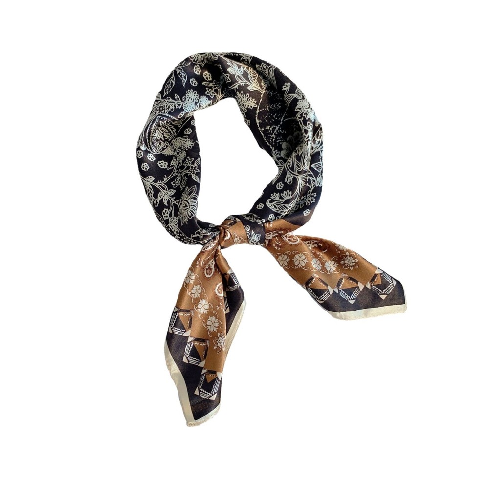 100% Silk Vintage Scarf for Women Black Brown Square Bandana Wrap 68x68cm