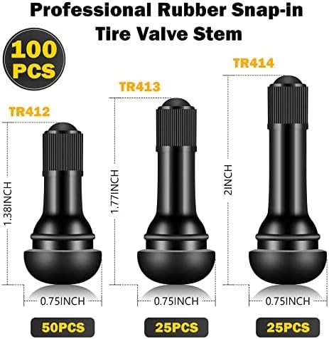 What you will get: you will receive a total of 100 pieces of tubeless tire valve stems (TR412: 50 pcs, TR413: 25 pcs, TR414: 25 pcs) ,sufficient quantity to meet your demands for daily use and replacement, you can store them for a long term use and please check the compatibility information carefully before placing an order Various Application: Snap-in valve stems for tubeless 0.453” (11.5mm) diameter rim holes, U.S. standard,providing safe tire system and safe driving, up to 65 PSI cold pressure per industry standard, durable and practical Universal Rubber Stem: Valve stems are a standard diameter and fit for Cars, light trucks, small trailers, wheelbarrows, lawn mowers, ATVs, motorcycles Quality material: these black rubber snap-in valve stems are made of quality brass and ozone-resistant rubber, and have been tested by EPDM, ozone and leakage tests, and are equipped with high temperature brass valve cores, better performance, can serve you for a long time, economical and practical.100% leakage tested, high quality and providing safe tire system and safe driving. Easy to install: the standard length replacement tire valve stems are very easy to install and disassemble due to the snap-in design, you can easily install the valve stem with hands, time-saving and simple, providing you with much convenience when you are driving out; When replacing a tire, a tire technician should always replace the valve stem to ensure there are no issues with the tire changing process