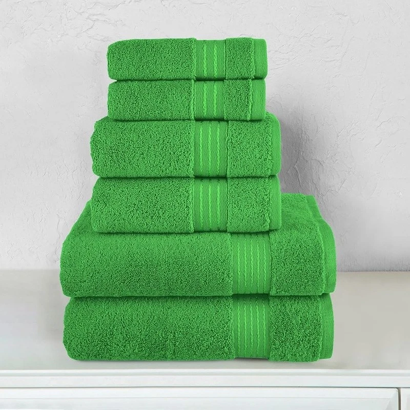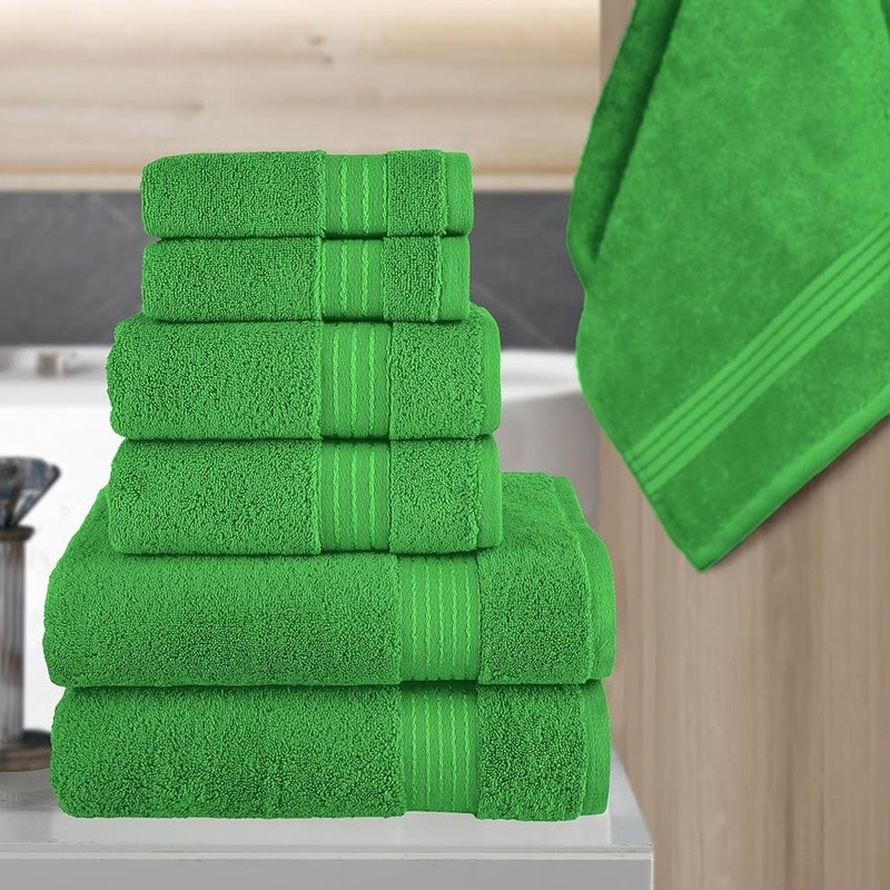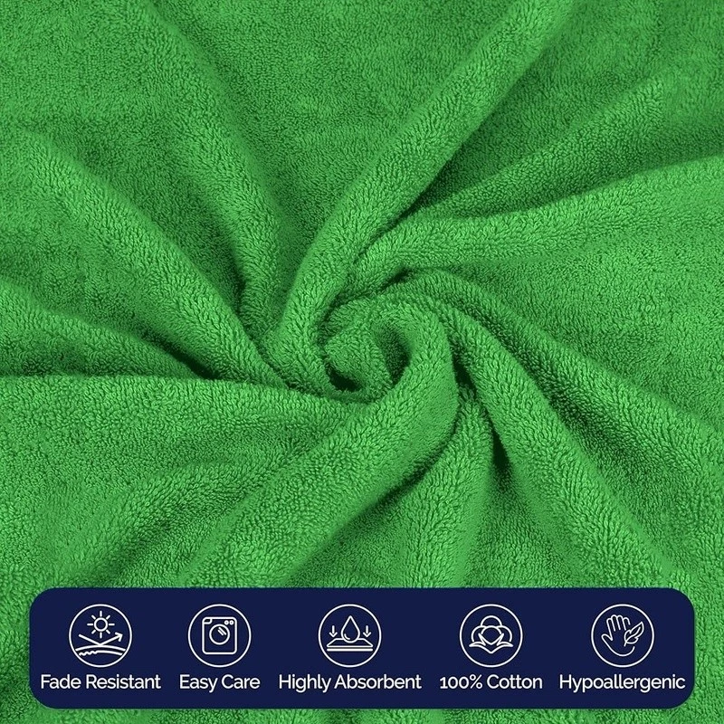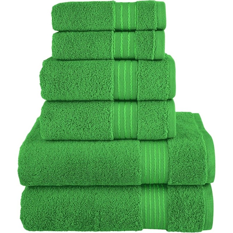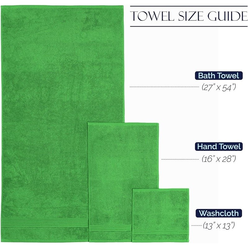 About this item 100% Turkish Cotton CONTENTS & MEASUREMENTS - This 100% Turkish Cotton towel set includes 2 Bath Towels ( 27" x 54" ), 2 Hand Towels ( 16" x 28" ) and 2 Washcloths ( 13" x 13" ). This collection features a high range of color options making them perfect for any type of home decor. This towel set is heavy weight with 680 GSM designed for heavy duty use. ELEVATED DESIGN - Our 100% Turkish Cotton towel set combines luxury softness and ultimate absorbency providing an extra soft finish and high absorbency levels. Their 680 GSM thickness makes these towels feel plump and fluffy, dry quickly and thoroughly, super soft to the touch for the ultimate comfort in your bathroom. VERSATILE USE - These towels are perfect to use in your home as a bathroom towel set, kids bath towels, gym towels, Spa or when traveling. These make an ideal complement to any bathroom whether you use it to pamper yourself or reserve it for special guests. DESIGNED WITH CARE - This product is OEKO-TEX STANDARD 100 and OEKO-TEX MADE IN GREEN certified, meaning this product has met high environmental safety standards and has been tested for harmful substances. Each fabric batch is also tested for various durability features such as no-pilling, low shrinkage, color fastness, etc. EASY CARE- We recommend you wash your towel set before initial use. Wash separately. Machine wash cold on a delicate cycle. Tumble dry low. After the first wash, the towels will fluff up. They will bring cheer to your home decor for a long time. › Color: Emerald Green Brand: Towel form type: Bath Towel Material: Cotton Product Dimensions: 54"L x 27"W