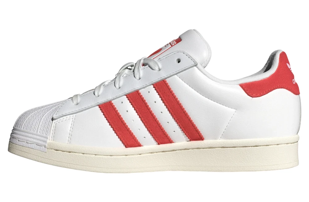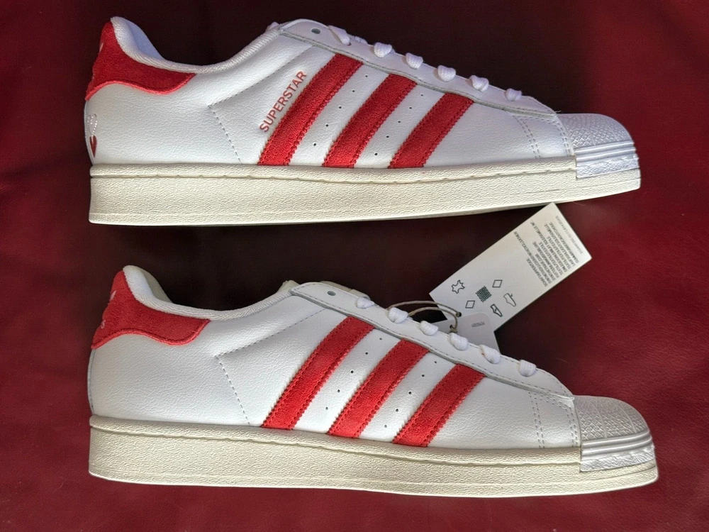 $100.00 MSRP NOTE: Shoes and brand new, pristine, and have never been worn. Box is beat up. The adidas Women’s Superstar ‘Valentine’s Day 2024’ dresses the classic silhouette in a holiday-themed palette in honor of February 14. Crafted from white leather with a tonal rubber shell toe, the upper features red suede detailing on the signature three-stripes and Trefoil-branded back tab. A pair of hearts are embroidered on the lateral heel, while an additional heart graphic adorns the adidas tongue tag. A vintage off-white finish is applied to a rubber cupsole, featuring a herringbone traction pattern underfoot. Details & care Serrated 3-Stripes and a textured clamshell toe bring iconic detailing to a sneaker that's been a footwear favorite since it hit the streets in 1969. Its low, lace-to-toe profile and herringbone tread keep the heritage vibes alive and on the move. Lace-up style Leather and synthetic upper/textile lining/rubber sole Imported PRODUCT INFORMATION Model: IG5958 Release Date: 2024-01-01 Series: Superstar Nickname: Valentine's Day Thickness: Regular sole Upper Material: Leather Closure: Lacing Sole Material: Rubber Sole Upper: Low Top Toe Type: Round Toe Occasion: lifestyle Color: white Colorway: Cloud White/Bright Red/Wonder Clay