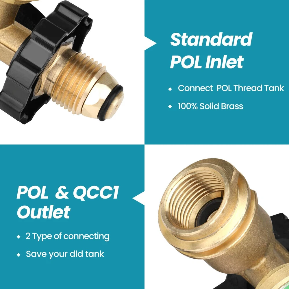 【Role and Function】The upgraded pol to qcc1 adapter converts your large propane tank's POL connection to QCC Type1 & POL connection, It offfers both types of connections for your propane tank. It is more convenient for daily use by using this pol propane tank gauge. 【Fluorescent Pointer】The pointer of this 100 lb propane tank gauge is made of fluorescent material, you can clearly know the propane level of the propane tank in dark environment. The rotatable gauge allows the gauge to be in a position suitable for reading. (Tips: This propane tank gauge 100lb only provides a reference interval and it is not accurate to every pound.) 【Preferred Material】The pol lp tank valve to qcc1 kit is made of 100% solid brass with high strength and hardness, so it can withstand harsh weather and hot and cold changes, dent corrosion, scratches, etc. It will provide you with long term secure connection, more worry free. 【Packing list】Propane adapter pol to qcc1 X 1, dust cover X 1. This pol to type 1 propane adapter is equipped with an handwheel, you just need to tighten the propane tank adapter by the handwheel and then you can put it into use, tools is no need. (tips: before starting to use, please make sure the installation is correct, no gas leakage)
