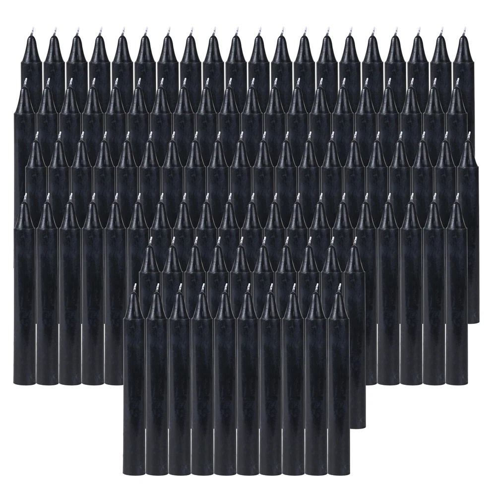 Size: 4in x 1/2 inch Scent: Unscented Number in Pack: 100 Color: Black Item Length: 4 in Brand: NORDICO Candlelights Features: Non-Drip, Single Wick, Smokeless Material: Wax Blend Custom Bundle: No Shape: Round Style: Modern Burning Time: 1.5 H Personalize: No Room: Any Room, Dining Room Item Height: 4 Type: Bulk Candles Additional Parts Required: No