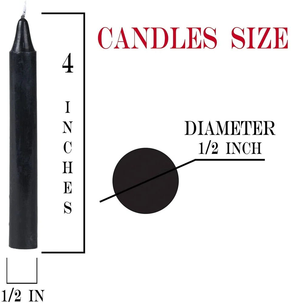 100 pcs Black Candles for Christmas Tree - Angel Chime Decorations - Christmas Pyramids Carousel -Magic Ritual Small Mini Spell Chime Candles-for Pagan and Witchcraft Altars-4 inch X 1/2 inch Diameter - 1.5 Hour Burn Time *FEATURES AND DETAILS – Packaged in 100 candles per box [ 1.5 Hours burning Time] [ SIZE: 4 inches x 0.5-inch Diameter] Designed to fit your Angel chimes, Christmas pyramids and more. Make sure to check the size of your candle holder to ensure these matches up. *TOP QUALITY - You will love how these Black candles burn, they are clean burning, smokeless. Perfect for congregation candlelight service, Christmas Pyramid, Chime Decorations, Christmas Tree Decorations and more. * BOX PACKAGE - Properly packed. These sets of candles are packaged box to ensure low damage during transportation. This will make a perfect add on gift or for use of your Christmas season home décor PERFORMANCE WICKS - Each wick is made from high-grade cotton. Raw wicks are coated with a blend of waxes to ensure proper smokeless burning with no scent * 100% BUYER PROTECTION GUARANTEE - If you do not love it, we are not satisfied Let us know and we will make it right. Click ‘’ADD TO CART’’ and ORDER yours TODAY. 100 Black candles per pack 4-inch x 0.5 Inch Diameter Burn Time up to 1.5 Hours. Maintain color throughout burning. Cotton wick Clean Burn MULTIPURPOSE USE - Mini Taper Candles - Spell Candles - Chime Candles - Shabbat Candles - Rituals - Spells - Vigil Candles - Witchcraft Candle - Wiccan Supplies - Wax Play Candles Perfect Chime Candles Taper Candles add elegance and sophistication to any formal event. Whether it is at a wedding, a reception table or just for a romantic candlelight dinner for that special person. They provide just the right amount of textured lighting for a dramatic presentation. Small Tapers make the perfect tabletop light for upscale restaurants and parties. Those mini taper candles are the perfect decorations for a Christmas tree, Christmas caroling or Holiday Season. They will fit to your angel chimes; pyramids and many others candle holders.