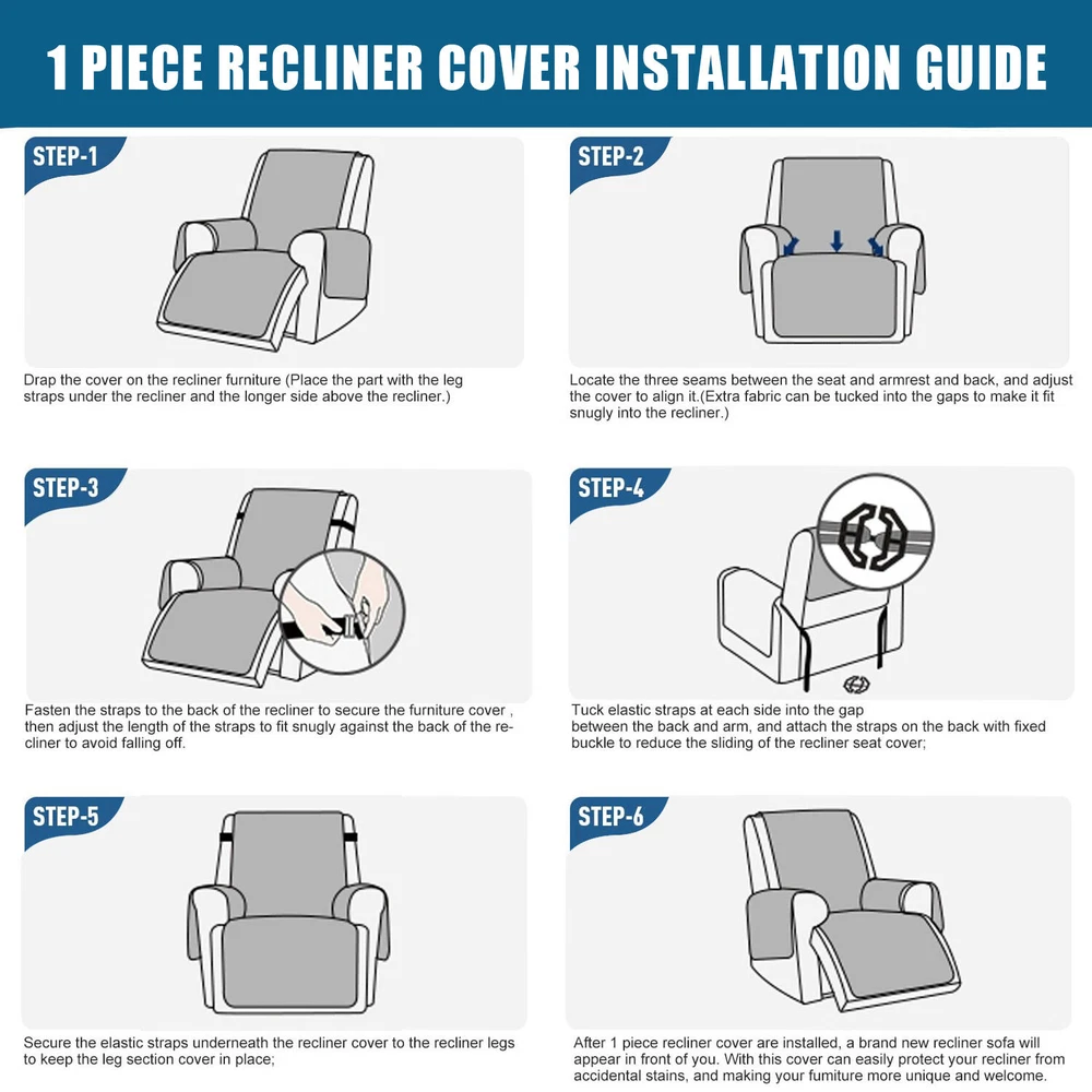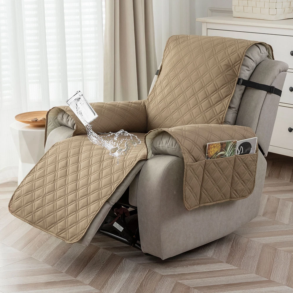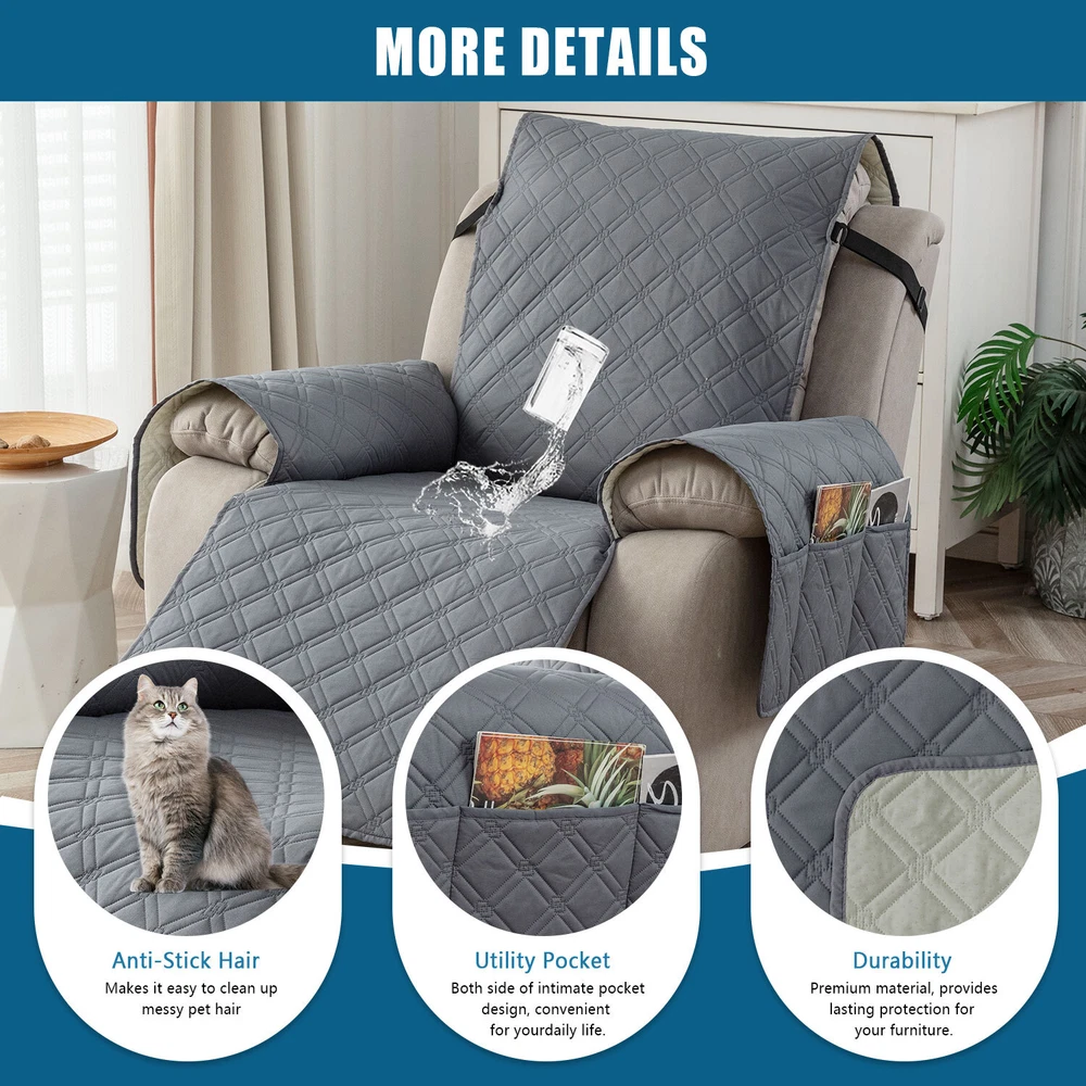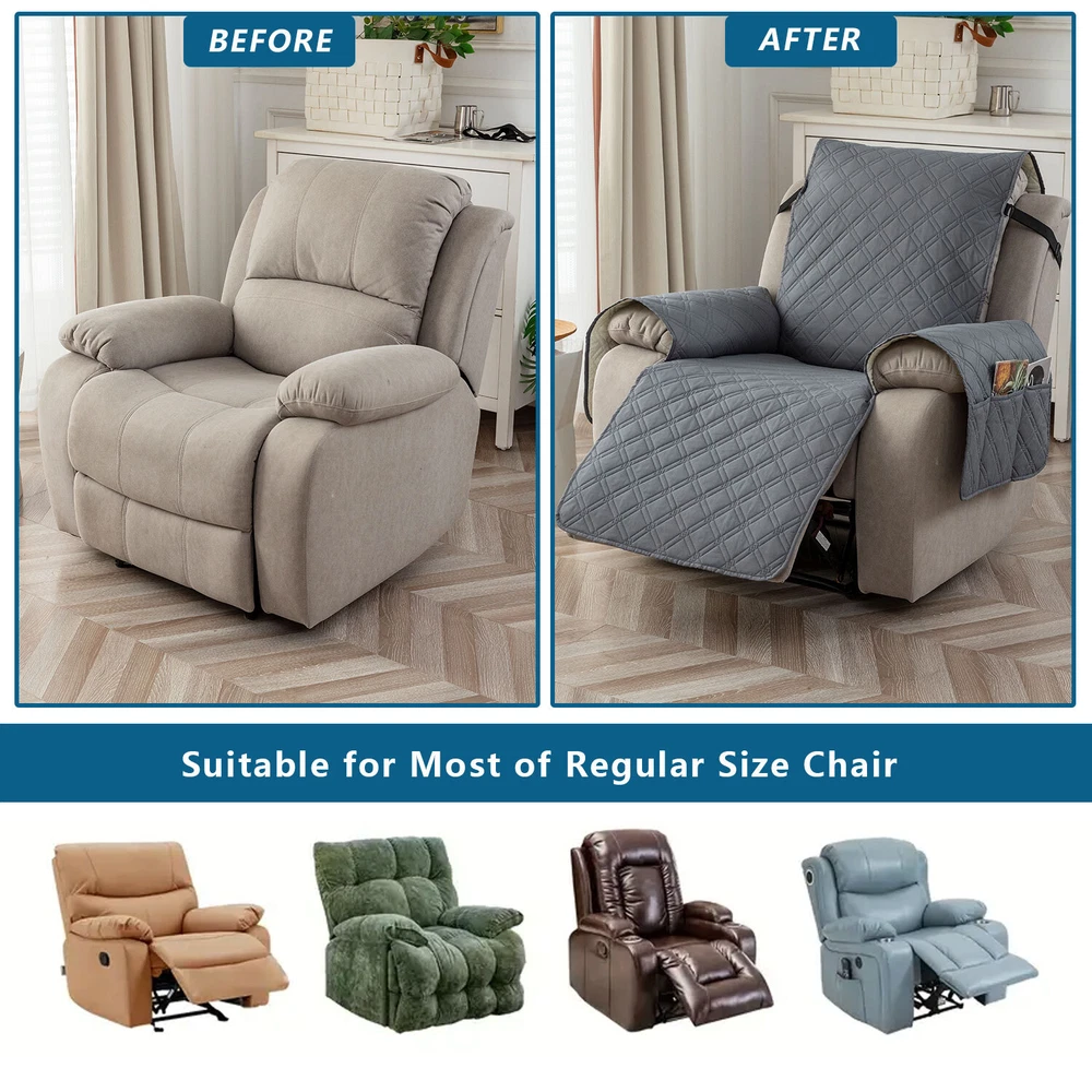 About this item 【100% WATERPROOF FABRIC】We use high-grade fabric to undergo waterproof treatment by coating a waterproof layer on the top, to ensure our recliner chair cover provides 100% guaranteed waterproof and leak-proof features. This new waterproof feature (can be tested), is a great way to protect your sofa from any drinks, spills, daily wear and tear. Making sure your furniture are clean at all times. 【HIGH QUALITY MATERIAL】 reclining chair cover are made of choiceness material, quilted from 5 layers of durable fabric, and the inner-layer is filled with soft texture fabric to make it more comfortable, soft, durable and strong, it would be a great choice for homes with kids and pets. 【REDUCE SLIP-OFF CONCEPT】Reduce movement around! 1. Solid round colloid design on the back of our recliner cover; 2. Additional flexible elastic straps; 3. Two elastic bands at seat's back side and the matching buckle, to reduce the sliding of the recliner chair slipcover, even on the leather furnitures. 【DIMENSIONS GUIDE】 Small pet recliner cover fit a chair with a seat width of 20 in, see measurement guide in photos. NOTE: Please confirm the size before purchasing.(Due to some lighting reasons, the color of each display will be different, so please refer to the actual color.) 【Easy to install & Easy care】Care instruction: Hand or machine washable, wash at a temperature around 30 degrees Celsius, mild laundry detergent advice. Do not bleach. Do not iron. (Service Guarantee: If have any questions on the product, please contact us for help.)