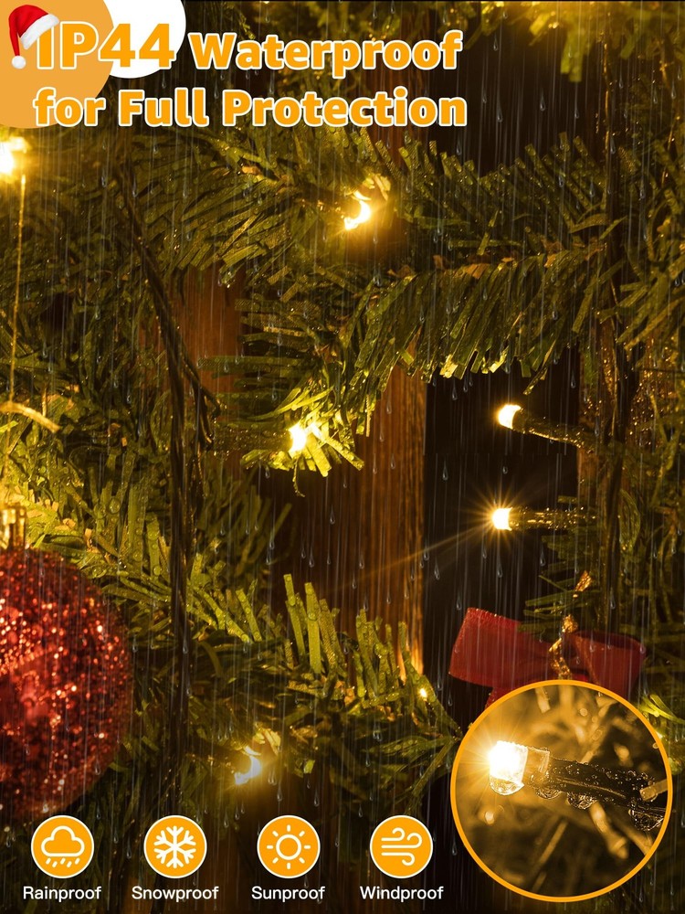 Why choose our Christmas lights for tree ? 1: The led Christmas tree lights are 1000 LED 328 FT in length and emit a soft, romantic glow that will create a cozy atmosphere in your space; The lights are extra bright and perfect for both indoor and outdoor decorations. 2: The outside christmas lights has 8 lighting modes (Steady ON, In Wave, Sequential, SLO-GLO, Chasing Flash, Fade, Twinkle Flash, Combination); With remote You can easily customize the lighting mode to match different occasions. 3: The outdoor led christmas lights features 3 timer function, (4 hrs on & 20 hrs off); (6 hrs on & 18 hrs off); (8 hrs on & 16 hrs off ); The lights also come with a built-in memory chip that will save the previous mode settings. 4: The outdoor xmas lights have 4 brightness adjustments, Range from 25%, 50%, 75%, to 100%; You can adjust the different brightness of the string fairy lights by remote control to suit different scenes. 5: The christmas led lights are certified by UL588, operate at 29V low-voltage, making them safe to touch when on; With IP44 waterproof rating, the lights remaining bright and sparkling even during extreme weather. Specification: Length: 328 FT Voltage: 30V Material: Plastic Power: 9W Dimmable: 4 Dimmable ways with Remote Control Waterproof Grade: IP44 Mode: 8 Lighting Modes Quantity of Bulbs: 1000 LED Package Included: 1 x Chrismtas String lights 1 x User Manual 1 x Remote Control Extra Long and Bright Christmas Lights: The LED outdoor Christmas lights are 1000 LED 328 FT in length and emit a soft, romantic glow that will create a cozy atmosphere in your space 8 Lighting Modes: The Christmas lights for tree has 8 lighting modes; (Steady ON, In Wave, Sequential, SLO-GLO, Chasing Flash, Fade, Twinkle Flash, Combination) Timer Memory Function: The LED Christmas lights features 3 timer function; 4 hrs on & 20 hrs off; 6 hrs on & 18 hrs off; 8 hrs on & 16 hrs off; The memory mode will save the previous settings 4 Dimmable Ways for Widely Use: The outside Christmas lights have 4 brightness adjustments range from 25%, 50%, 75%, 100% to choose Waterproof and UL Certification: The warm white Christmas lights are certified by UL588; With IP44 waterproof rating; the lights remaining bright even during extreme weather