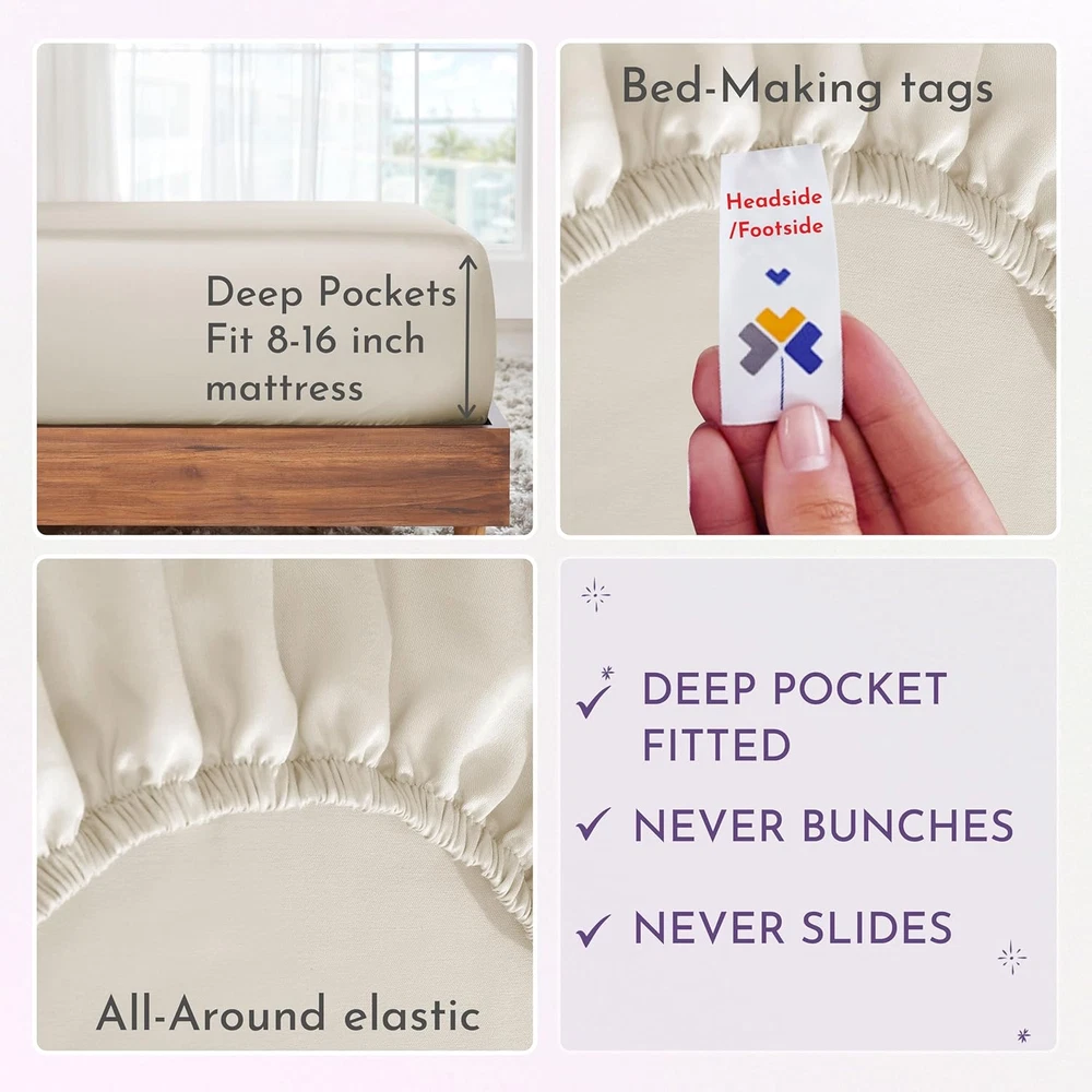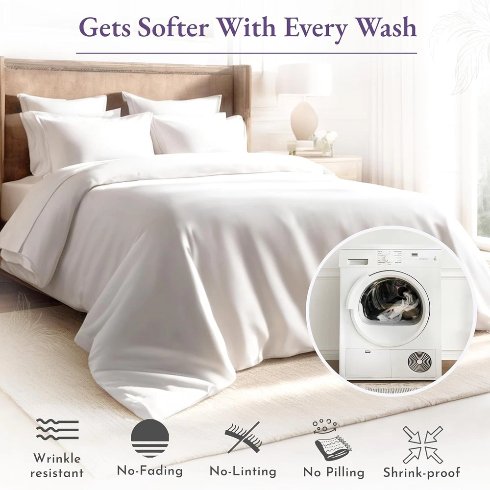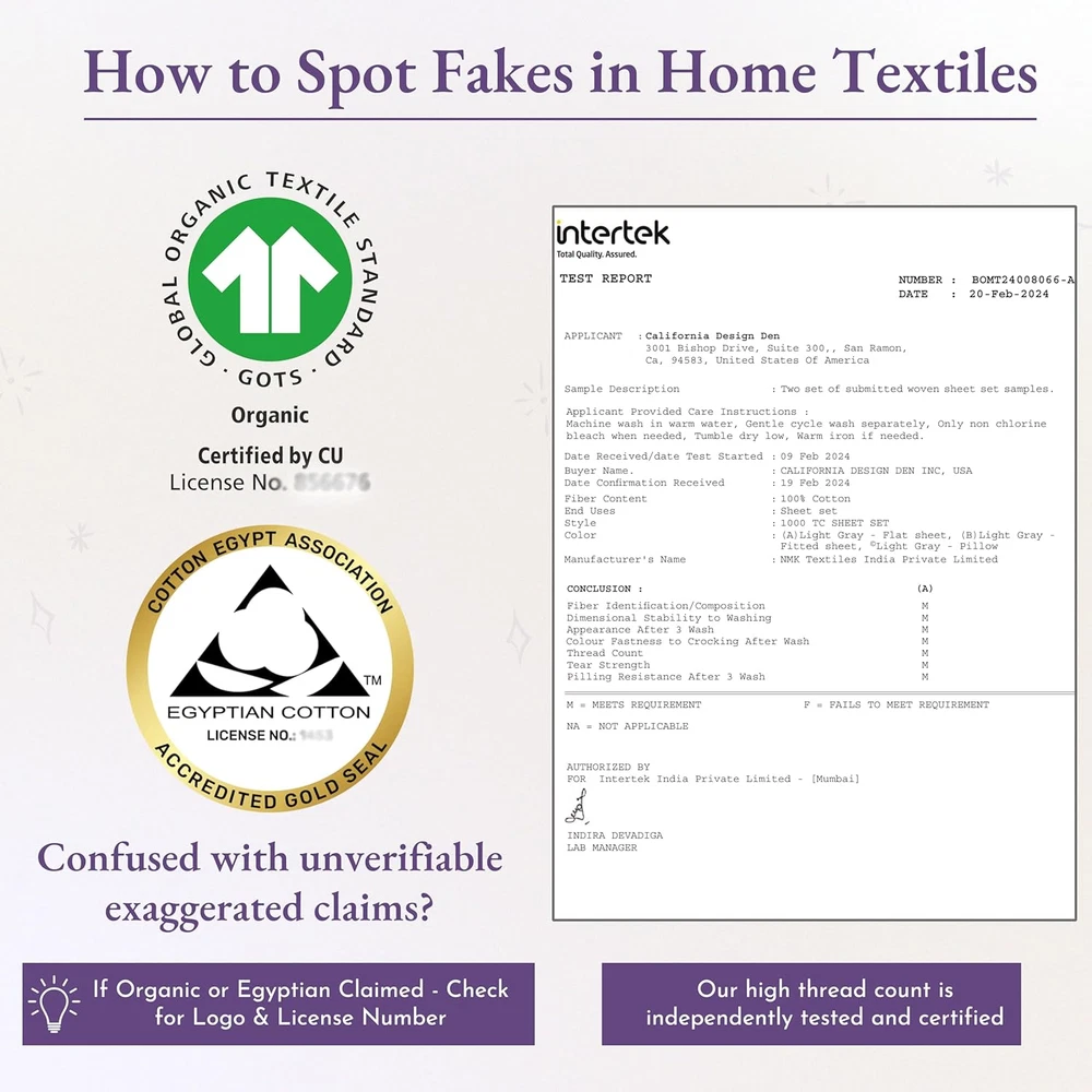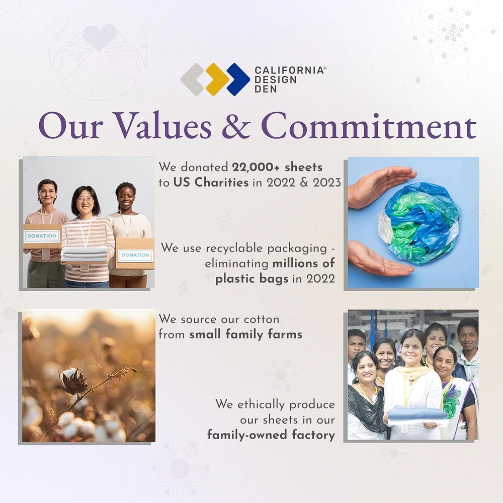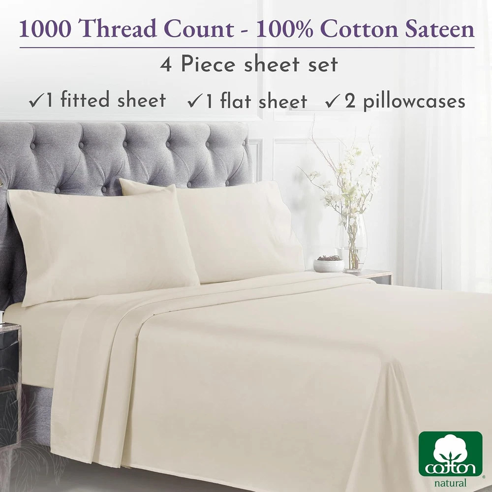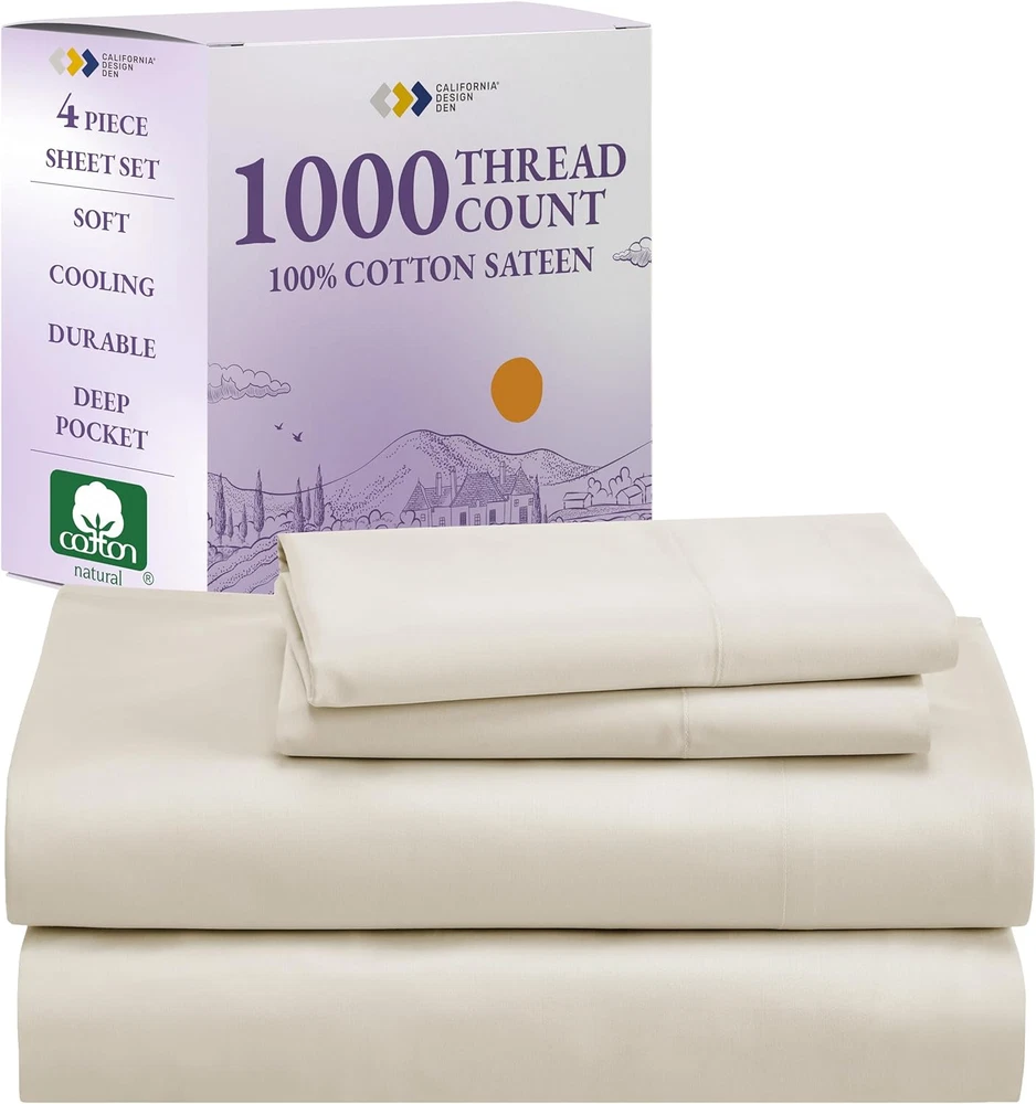 Store New Arrivals Add to Favorite View Feedback Contact 1000 Thread Count Queen Size Sheet Set, Winner Architectural Digest Best Sheet, 100% Cotton Sateen Luxury Bed Sheets, Softer than Egyptian Cotton (Ivory) Description Age Range Description Adult Weave Type Sateen Item Dimensions 11.2 x 9.2 x 5.5 inches Pattern Solid Material Type Cotton Theme Modern Unit Count 4 Count Pillowcase Quantity 2 Material Cotton Item Display Dimensions 11.2 x 9.2 x 5.5 inches Seasons All, Winter, Summer, Fall Additional Features No-Shrink, No-Fade, Cooling, Deep Pocket, Head/Foot Side Indicator Tags, Exclusive Anti-Slip All-Around Grip-Elastic, Authentic Thread Count, 100% Natural Soft Cotton Sateen Closure Type Pull-On Occasion Everyday/Casual Fitted Sheet Pocket Depth 16 Inches Color Ivory Thread Count 1000 Global Trade Identification Number 00840307139931 Style Name Ultra Luxury Included Components 1 Flat Sheet, 1 Fitted Sheet & 2 Pillowcases Product Care Instructions Machine Wash, Tumble Dry Size Queen Architectural Digest Best Sheet Category Winner 2024: Our award winning Luxury 1000 thread count 100% cotton sateen sheets are sumptuously soft and thick, reminding you of a premium luxurious hotel. Meticulously crafted for a luxurious sleep experience, these cotton bed sheets queen are soft, thick, and cooling, ensuring a comfortable sleep all year long. Sheet Set with a Great Fit: Our 4-piece high thread count cotton sheet set includes a top sheet (94" W x 102" L), a deep pocket bottom fitted sheet (60" W x 80" L) for mattresses 8 to 16 inches deep, and two standard/queen size pillowcases (21" W x 32" L). Fitted sheet features all-round elastic with deep pocket fit, ensuring it won't loosen or bunch up, with head/foot side indicators to make bed-making a breeze. Independently Tested & Authentic: Our queen sheet set is independently checked and authentic, providing a high level of comfort and softness. Unlike many sellers, we don't make unverifiable claims of Egyptian cotton sheets. Our sheets are made from the finest cotton grown in India. Easy to Wash & Lasts for Years: Our queen bed sheet set is easy to wash and lasts for years. Machine wash and dry our queen bed sheets at regular settings at regular settings, and they'll come out looking great with almost no wrinkles. They are durable, won't pill, fade, or shrink, certified "Oeko Tex Standard 100", and are tested for harmful substances to protect your health. Our Commitment: We donated over 22,000 pieces of bedding to local charities in 2022 & 2023. Our bedding sheets are produced in our family-owned factory in India, packaged without plastic, and inspected for quality. Enjoy a 30-day return policy for a confident purchase. Product Description Color range in 1000 Thread Count Cotton Sateen The video showcases the product in use. The video guides you through product setup. The video compares multiple products. The video shows the product being unpacked. Experience Luxury With Our 100% Cotton Sheet Sets The video showcases the product in use. The video guides you through product setup. The video compares multiple products. The video shows the product being unpacked. Bed Sheet Set Range from California Design Den Add to Cart Add to Cart Add to Cart Add to Cart Add to Cart Add to Cart Customer Reviews 4.5 out of 5 stars 3,554 4.5 out of 5 stars 5,361 4.4 out of 5 stars 29,179 4.5 out of 5 stars 12,785 4.5 out of 5 stars 80,968 4.4 out of 5 stars 2,810 4.3 out of 5 stars 6,051 Price $99.99 $ 99 . 99 $70.39 $ 70 . 39 $55.24 $ 55 . 24 $42.34 $ 42 . 34 $38.69 $ 38 . 69 $39.99 $ 39 . 99 $25.49 $ 25 . 49 Thread Count 1000 Sateen 800 Sateen 600 Sateen 500 Sateen 400 Sateen 300 Percale Everyday Sateen Experience the Feel Luxuriously Smooth & Plush Soft & Buttery Smooth Soft & Crisp Soft & Silky Soft & Comfortable Crisp & Cool Classic Softness Weight Substantial Substantial Optimum Light Medium Light Medium Cost guide πͺπͺπͺπͺ πͺπͺπͺπͺ πͺπͺπͺ πͺπͺπͺ πͺπͺ πͺπͺ πͺ Color Range 5+ Solid Colors 5+ Solid Colors 15+ Solid Colors & Prints 16+ Striped & Solid Colors 30+ Solid, Stripes, Prints 6+ Solid Colors 6+ Solid Colors Bed Sizes Available Queen & Above: Q, K, CK, SK All: T, F, Q, K, CK, SK All: T, T-XL, F, Q, K, CK, SK All: T, T-XL, F, Q, K, CK, SK All: T, T-XL, F, Q, K, CK, SK All: T, T-XL, F, Q, K, CK All: T, T-XL, F, Q, K Extra Pillow Cases Available βοΈ βοΈ βοΈ βοΈ βοΈ βοΈ βοΈ Easy Machine Wash & Dry βοΈ βοΈ βοΈ βοΈ βοΈ βοΈ βοΈ 100% Inspected & Certified βοΈ βοΈ βοΈ βοΈ βοΈ βοΈ βοΈ Easy Returns & Refunds βοΈ βοΈ βοΈ βοΈ βοΈ βοΈ βοΈ What is a thread count, and how it does matter while buying sheets? It is a measurement of the number of threads woven into each square inch of fabric. Higher thread counts indicate the use of finer yarns & a denser, smoother surface which creates a luxurious, cooling effect, ensuring a better night's sleep. What distinguishes percale sheets from sateen sheets? Sateen and percale are weaves in our 100% cotton sheets. Percale has a crisp, matte finish with a classic vibe. Sateen feels smooth and lustrous, with a subtle sheen, offering a luxurious feel, often in high thread counts. Would you recommend these sheets for all seasons, specially for hot sleepers? Our 100% cotton sheets are suitable for all seasons, specially for hot sleepers. Cotton is naturally soft, breathable and helps regulate your body temperature while sleeping. Our sheets will keep you cool and comfortable all night long. Can I wash these sheets in hot water? Hot water washing is acceptable, but may slightly shorten lifespan for any cotton sheet. For optimal cotton sheet care, machine wash in warm water. Basic cotton sheets last a few years, while our high thread counts endure 5β10 years. What is the return policy if I'm not satisfied with these sheets? These sheets are covered by Amazon's return window - so you can buy them with confidence even i