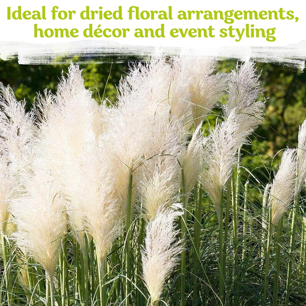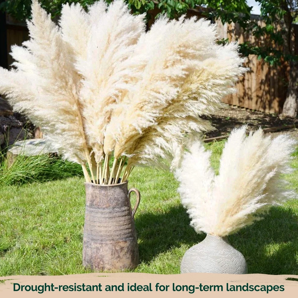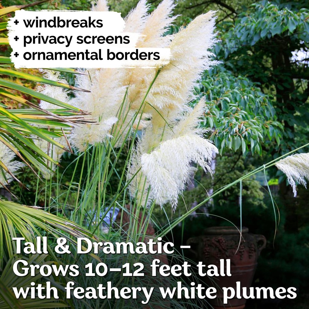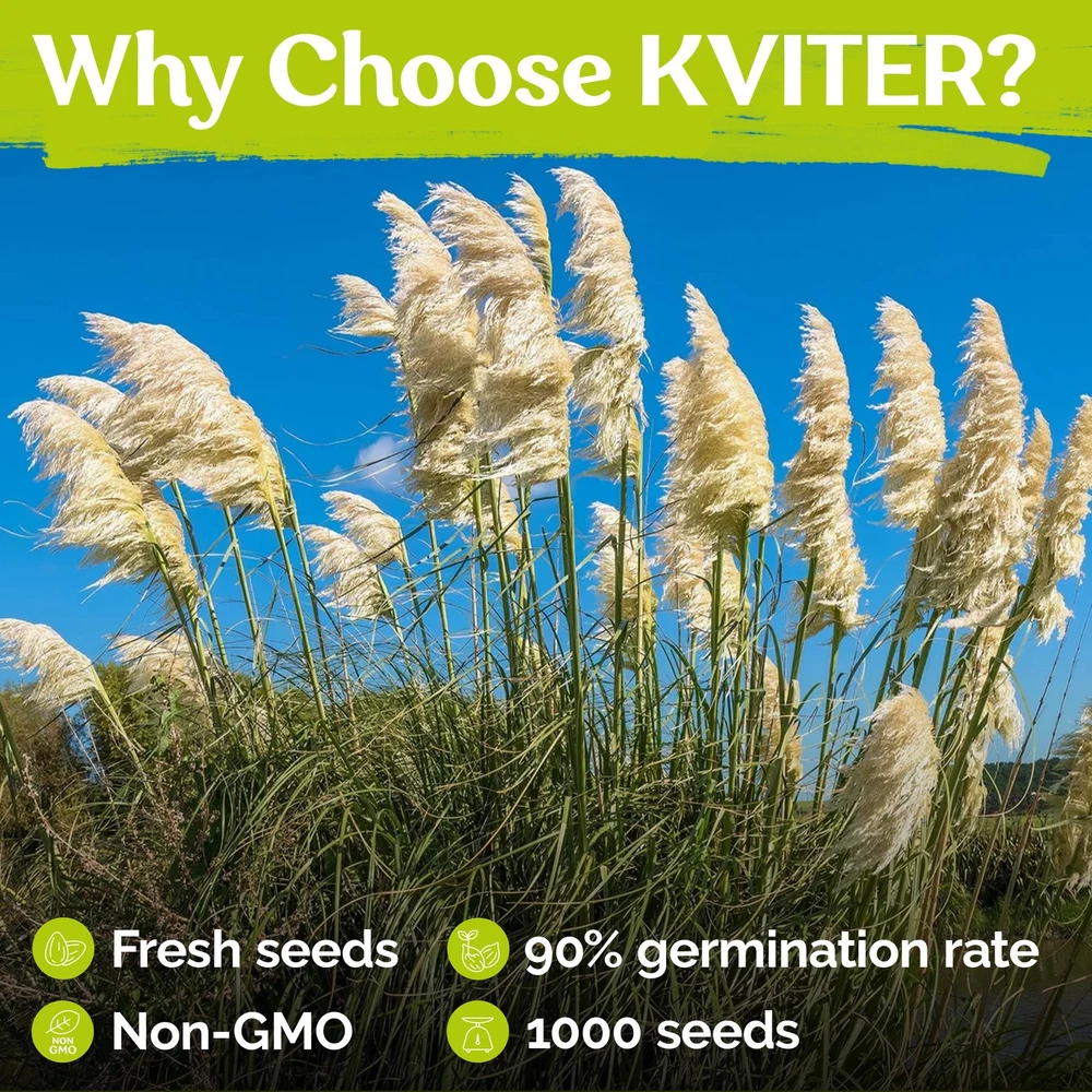 KVITER 1000 White Pampas Grass Seeds for Planting (Cortaderia Selloana Alba) Tall & Fluffy Perennial Ornamental Grasses, Heirloom - Ideal for Dried Pampas Grass Decor, Privacy Screens & Wind Breaks Key Features: i Vigorous Growth: Enjoy robust pampas grass that forms stunning white pampas plumes. As perennial plants in USDA Zones 6-11, they reach up to 10-12 feet, adding dramatic height to any flower garden. i High Germination Rate: tall pampas grass boast up to 90% germination. Sow these fast growing grass seeds at 72 ° F indoors 8-10 weeks before planting out. Or direct sow in spring. Sporuts in 20-30 days. i Eye-Catching Plumes: Revel in white pampas grass fluffy panicles that enhance any ornamental grass display. Thrives with minimal water, making it a drought resistant grass seed choice. i Versatile Landscaping: Hardy pampas thrives in diverse climates. These pampas grass seeds for planting outdoors or indoors form a perennial ornamental grass hedge for your privacy or windbreaks. i Low-Maintenance Beauty: Cortaderia selloana pampas grass plants require minimal upkeep. Expect first blooms in 2-3 years for lasting garden elegance. Also perfect for dried arrangements & decor. Product Description: In ornamental gardening, few species match pampass grass for dramatic flair. Although pink pampas grass has its charm, this white variety shines with luminous plumes that sway in gentle breezes, instantly uplifting any outdoor garden. Harvest it fresh for pampas grass decor or preserve as dried pampas grass for timeless, textured arrangements. Originally cultivated as white flower seeds, these enduring grasses belong to the perennial grass seed category, ensuring multi-year beauty. Raised from ornamental grass seeds, they can ascend to heights of 10 feet as ornamental grass plants. The lush fronds provide dramatic structure, while fluffy plumes showcase a refined yet impressive presence. As perennial ornamental grasses, they adapt to various soils and sunlight levels. Gardeners seeking fast transformations often categorize them as tall grass plant options. For those favoring eco-friendly methods, sowing these heirloom seeds aligns with organic seeds standards, contributing to a healthier, more vibrant outdoor environment. For expansive designs, consider heirloom seed garden setups that incorporate large pampas grass plantings. Spacing each clump about 80 inches apart allows the airy plumes to flourish without crowding. Many landscapers use them as living screens or to define pathways, thanks to their robust growth and broad, arching leaves. Whether you're establishing a cozy nook or planning an expansive landscape, these organic seeds deliver enduring beauty. Germination typically occurs within two weeks under adequate warmth and light. By year three, expect feathery plumes that stand throughout autumn, offering an elegant, low-maintenance ornamental grasses live plants perennial highlight to any setting. Embrace the timeless appeal of these plumes and transform your yard into a memorable retreat. We create products that preserve the purity of nature and brighten the world.